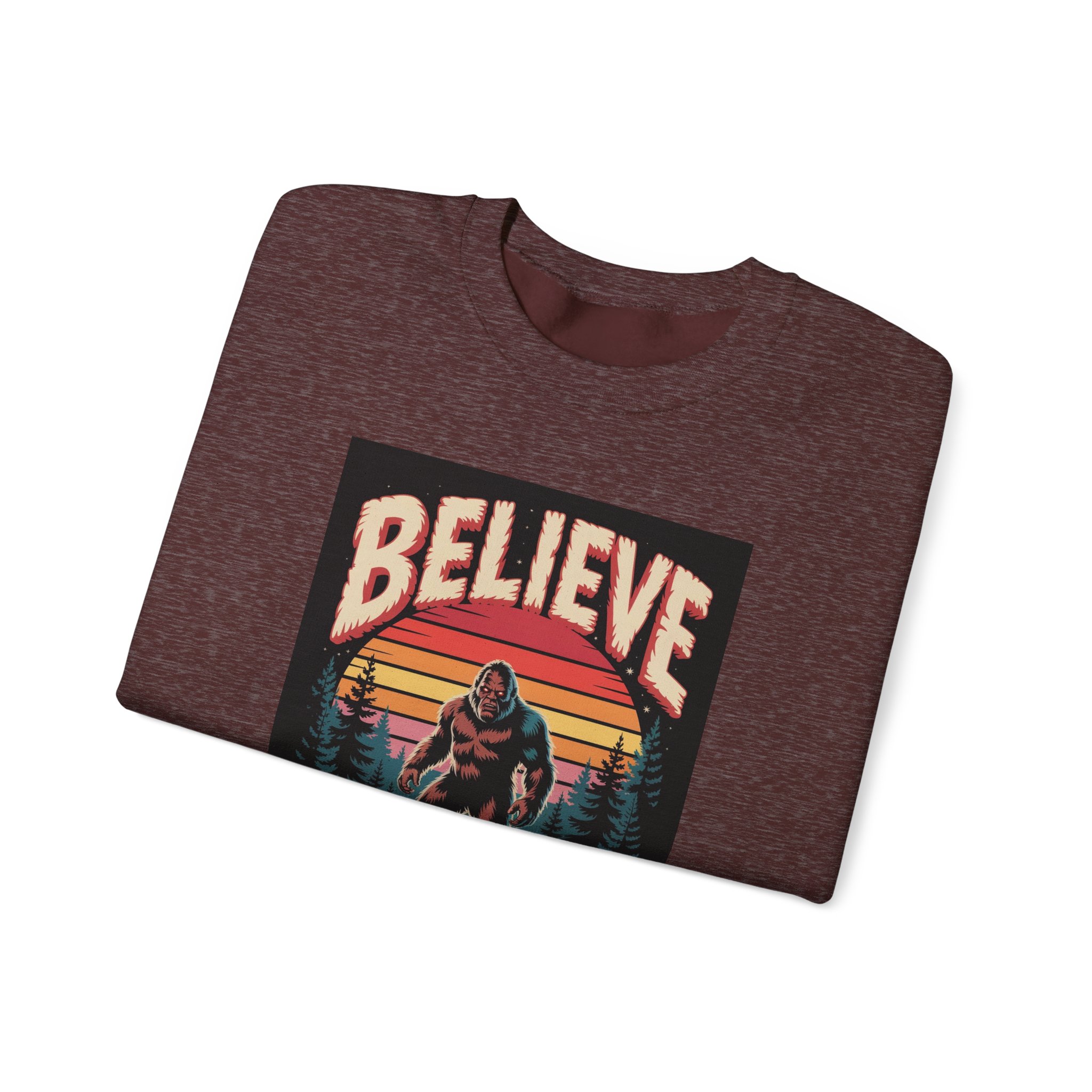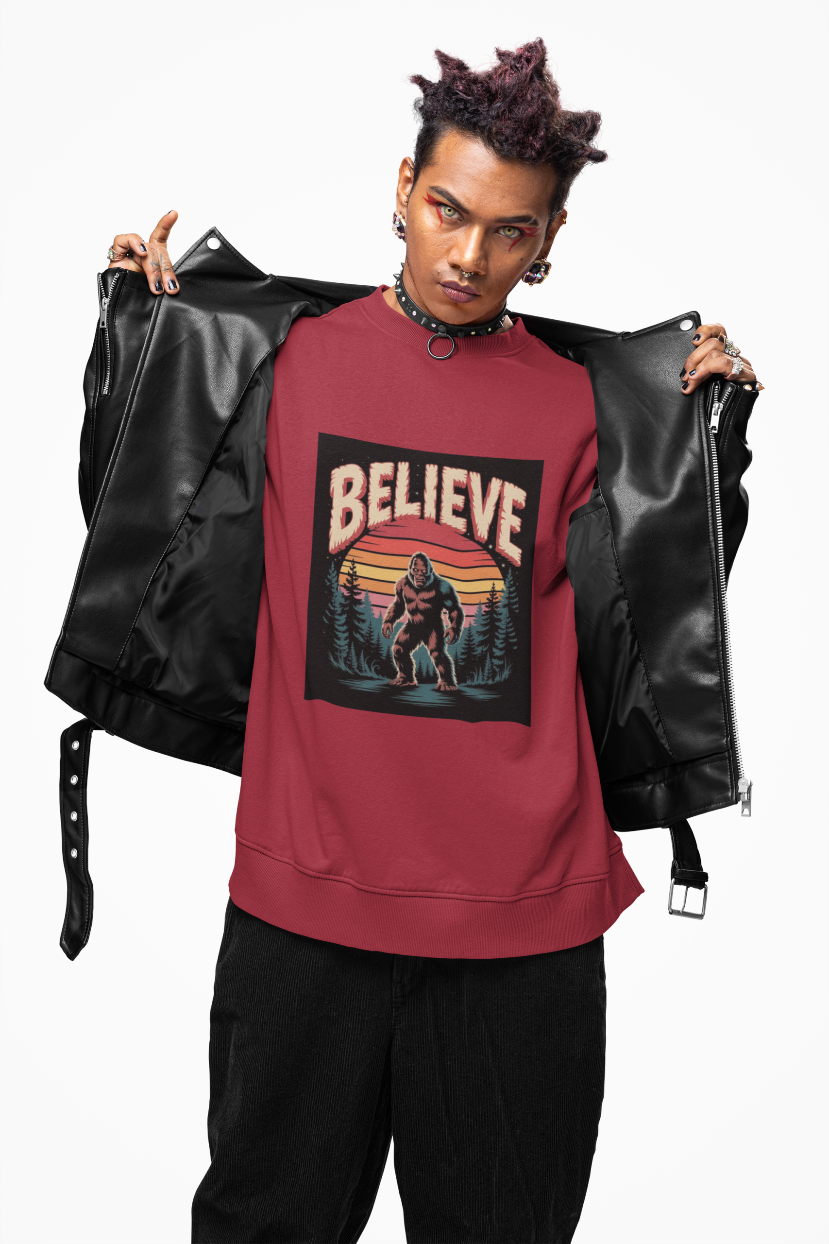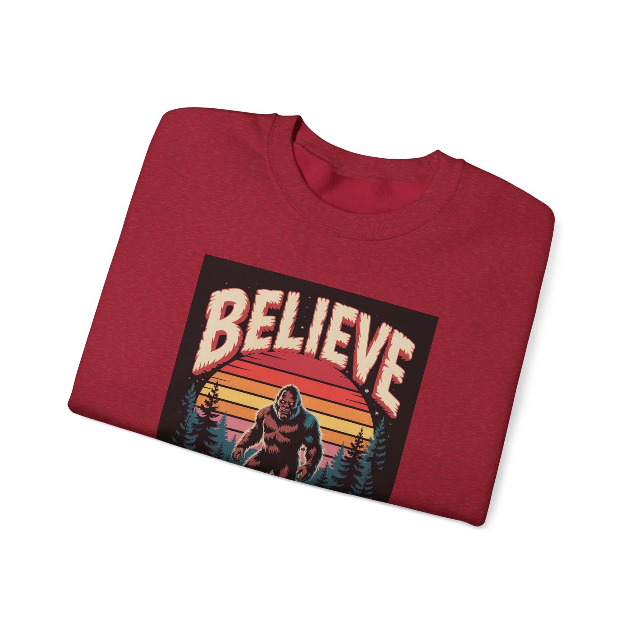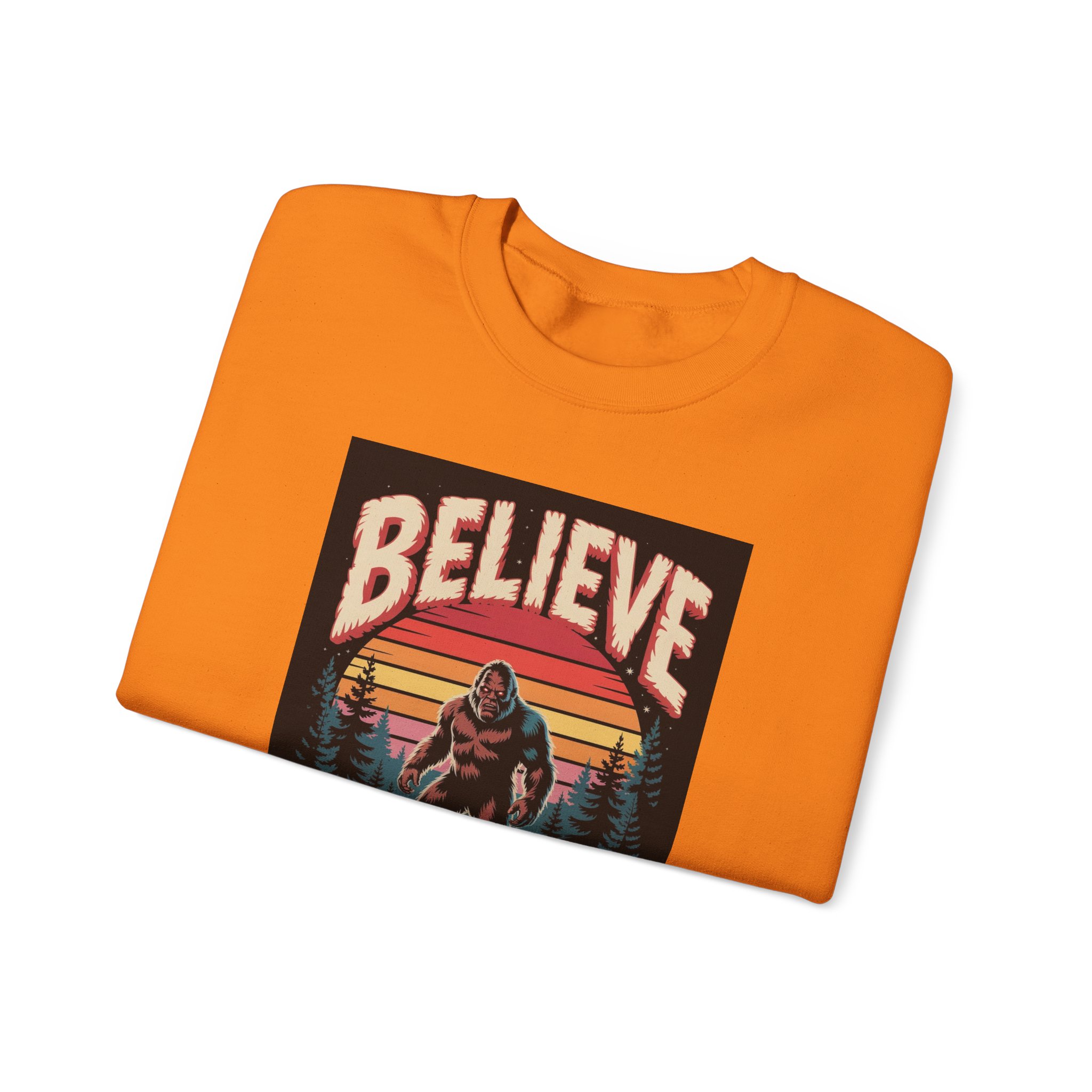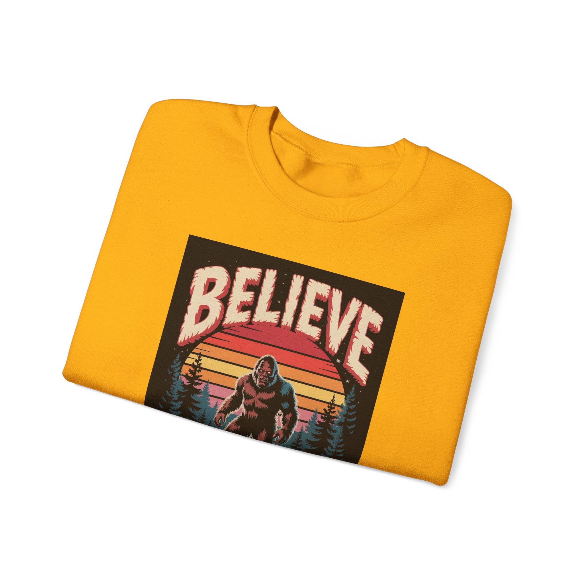 This vintage-style graphic poster depicts a Bigfoot or Sasquatch creature standing in a misty forest landscape with a retro sunset gradient backdrop. The word “BELIEVE” is prominently displayed in large, textured letters above the creature, suggesting a theme of cryptozoological mystery and folklore. The Sasquatch is rendered in detailed, muscular silhouette, standing in shallow water with a line of dark green pine trees framing the background. The color palette features warm sunset tones of red, orange, and yellow, transitioning to cooler blue-green hues in the forest and water. The overall design has a nostalgic, 1980s-inspired aesthetic with a slightly grungy, screenprinted look that emphasizes the mythical and enigmatic nature of the legendary creature.