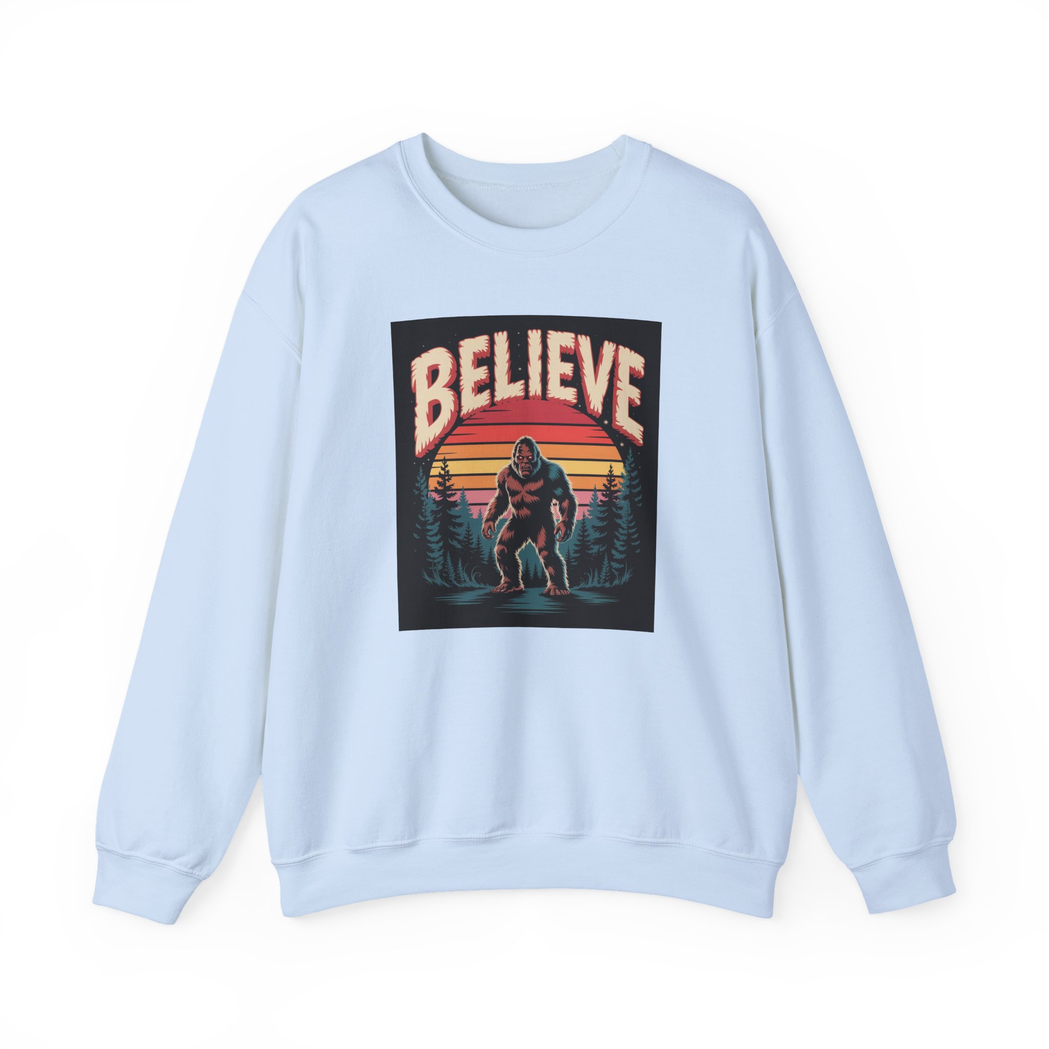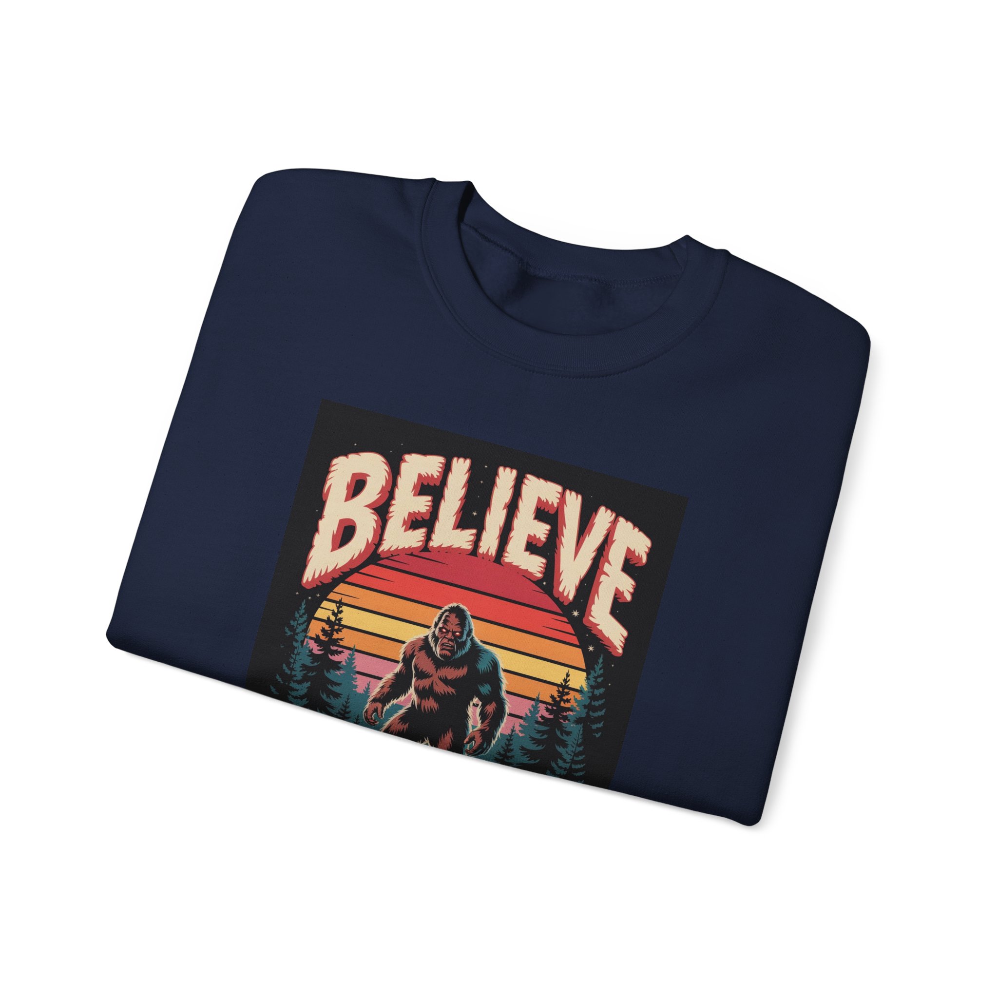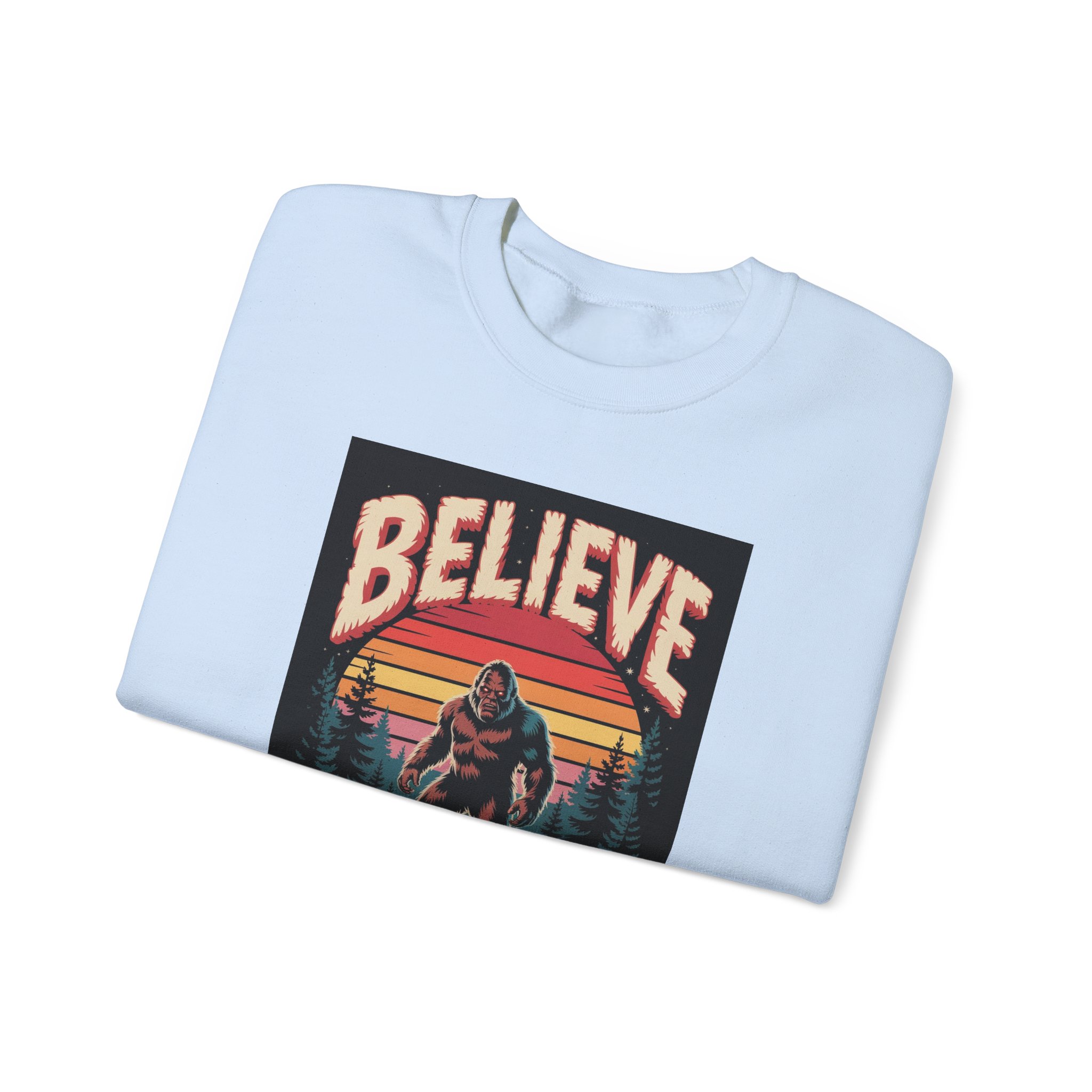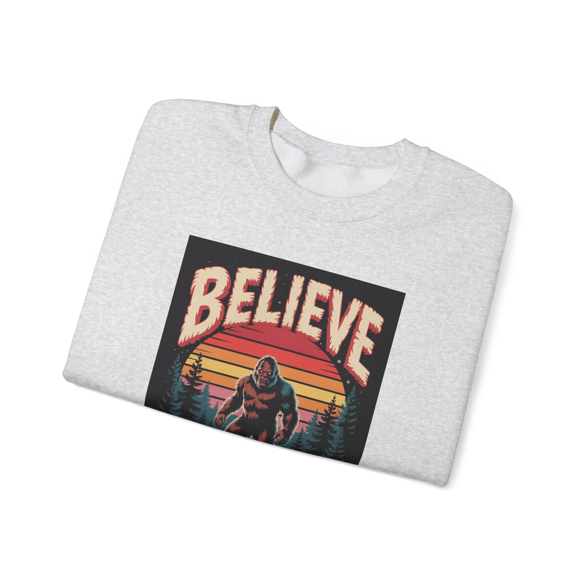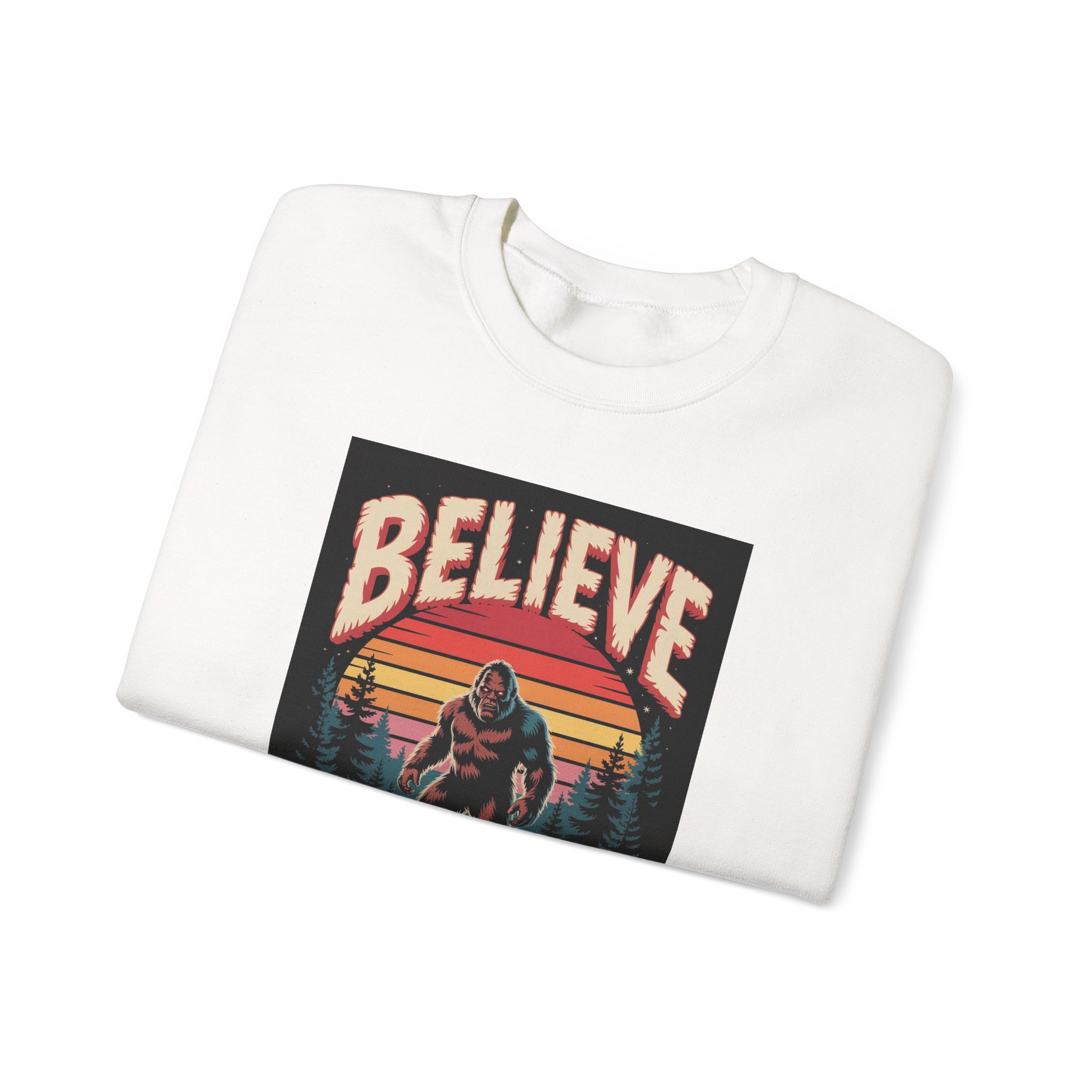 This vintage-style graphic poster depicts a Bigfoot or Sasquatch creature standing in a misty forest landscape with a retro sunset gradient backdrop. The word “BELIEVE” is prominently displayed in large, textured letters above the creature, suggesting a theme of cryptozoological mystery and folklore. The Sasquatch is rendered in detailed, muscular silhouette, standing in shallow water with a line of dark green pine trees framing the background. The color palette features warm sunset tones of red, orange, and yellow, transitioning to cooler blue-green hues in the forest and water. The overall design has a nostalgic, 1980s-inspired aesthetic with a slightly grungy, screenprinted look that emphasizes the mythical and enigmatic nature of the legendary creature.