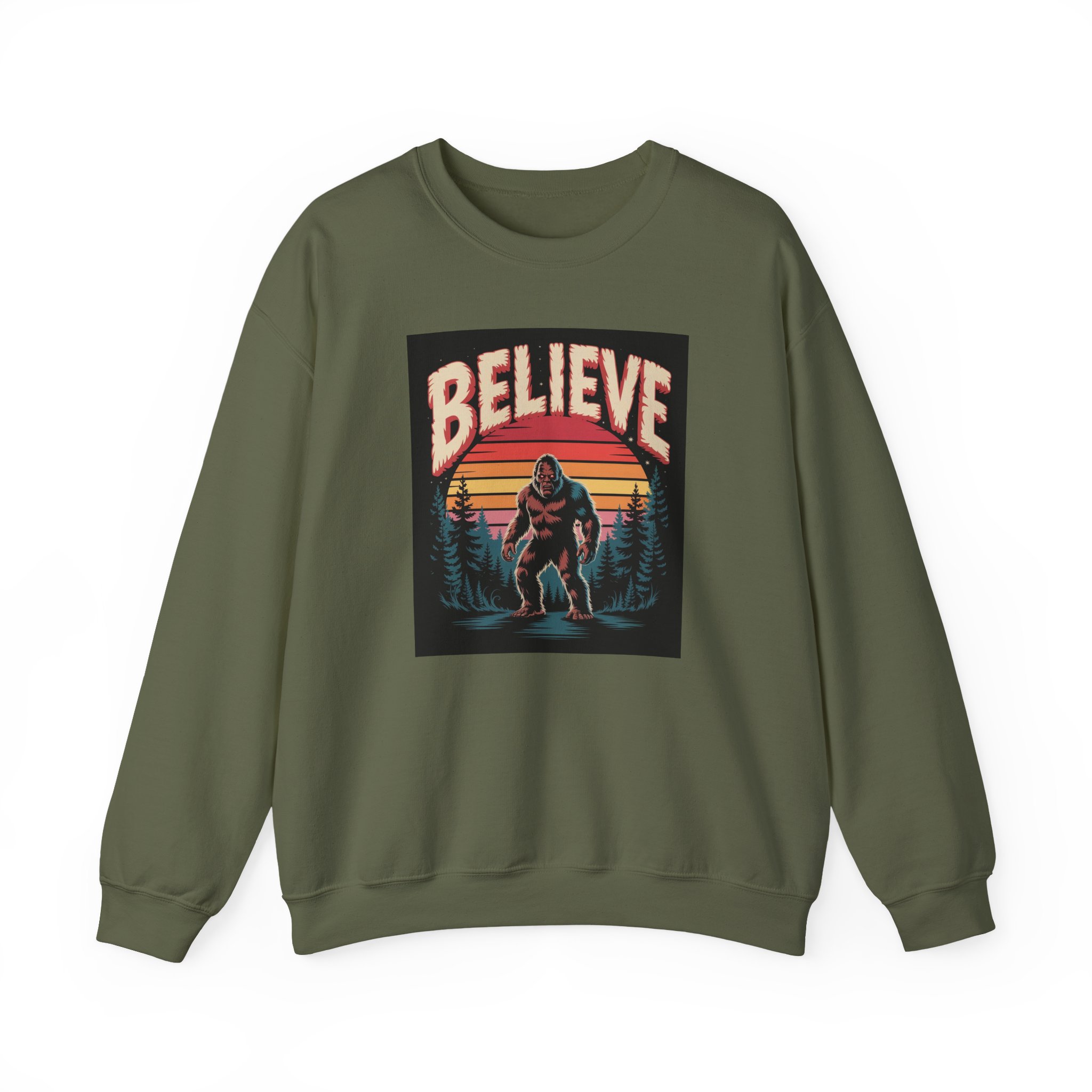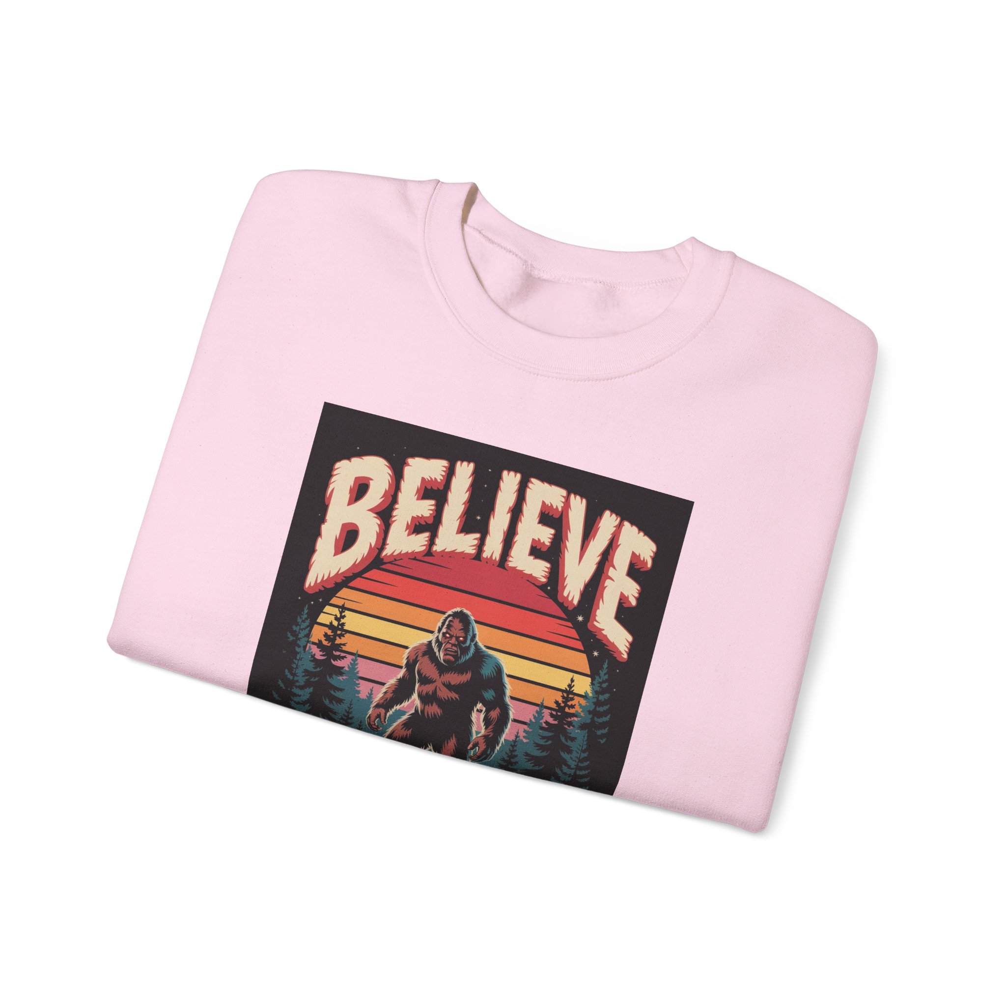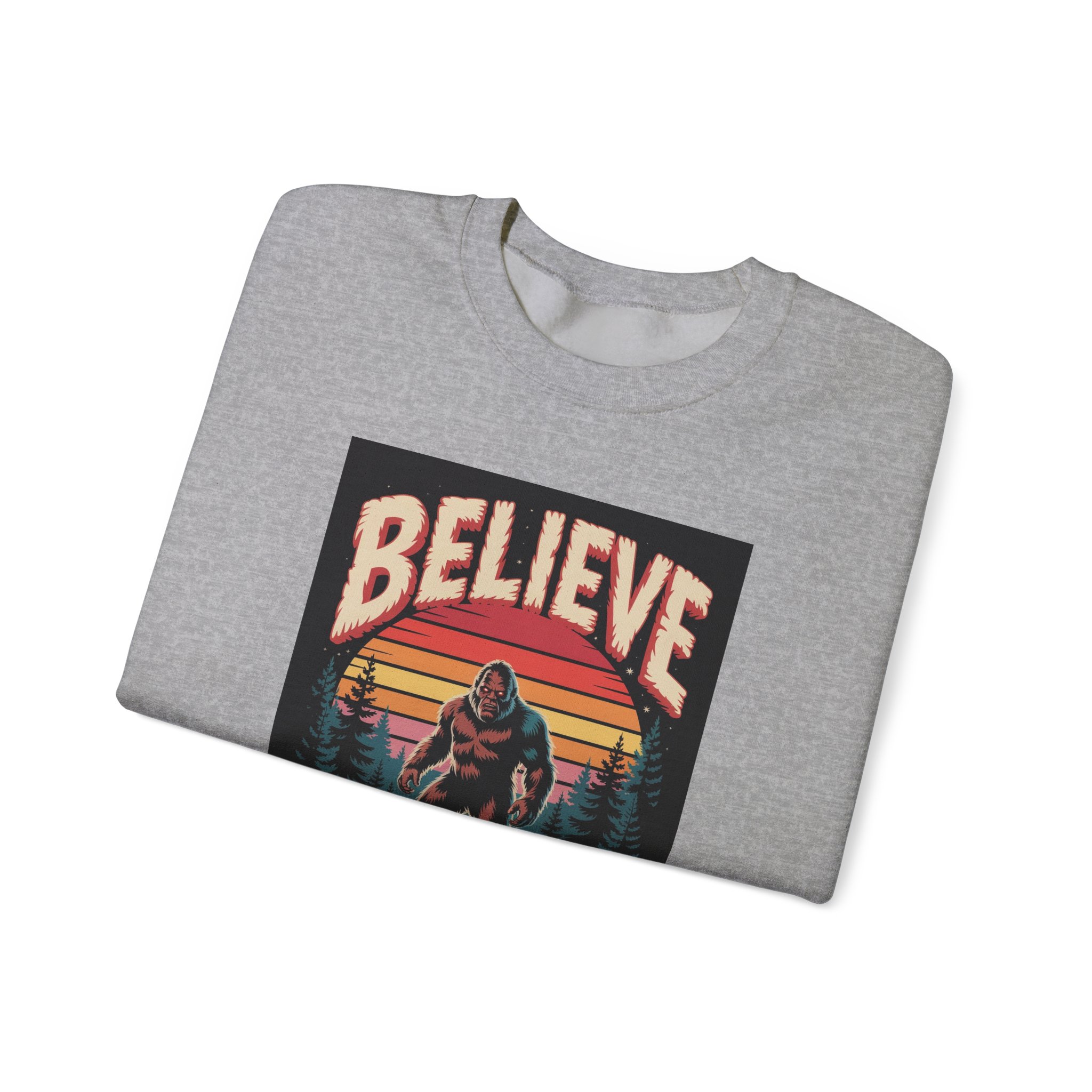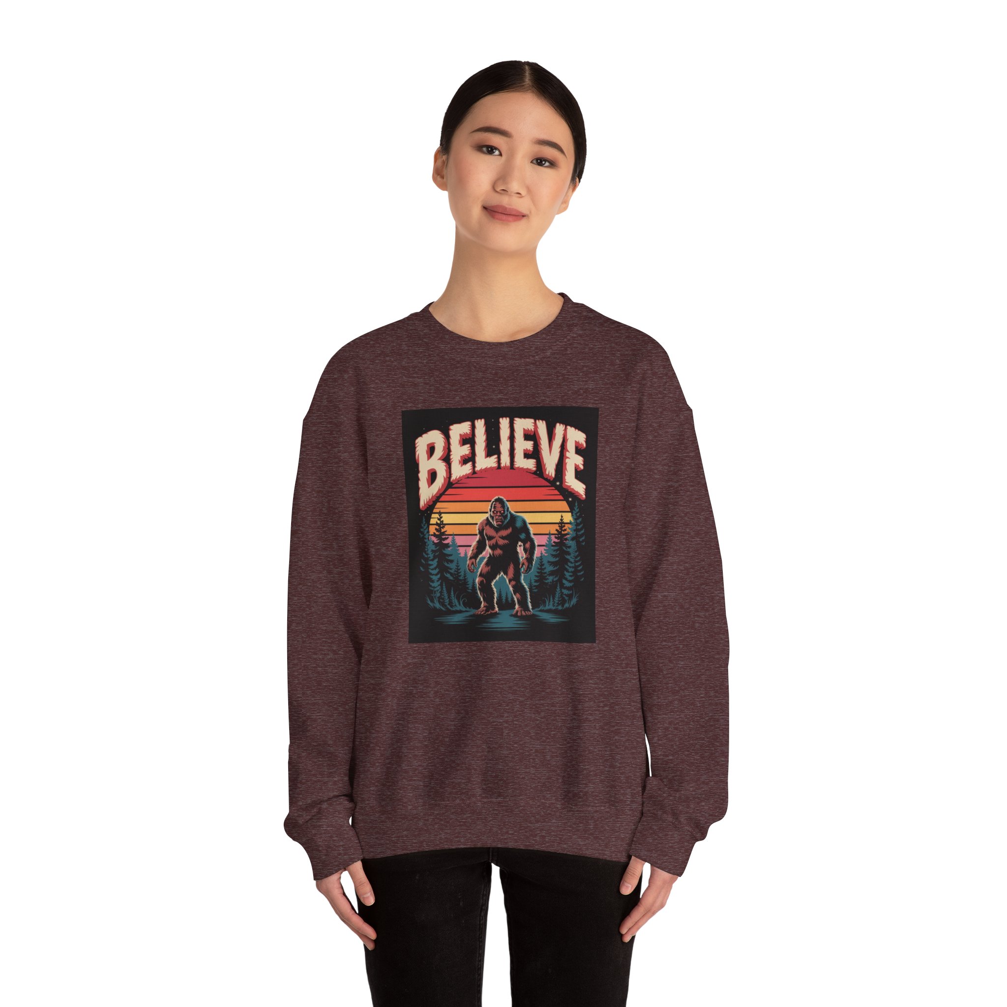 This vintage-style graphic poster depicts a Bigfoot or Sasquatch creature standing in a misty forest landscape with a retro sunset gradient backdrop. The word “BELIEVE” is prominently displayed in large, textured letters above the creature, suggesting a theme of cryptozoological mystery and folklore. The Sasquatch is rendered in detailed, muscular silhouette, standing in shallow water with a line of dark green pine trees framing the background. The color palette features warm sunset tones of red, orange, and yellow, transitioning to cooler blue-green hues in the forest and water. The overall design has a nostalgic, 1980s-inspired aesthetic with a slightly grungy, screenprinted look that emphasizes the mythical and enigmatic nature of the legendary creature.