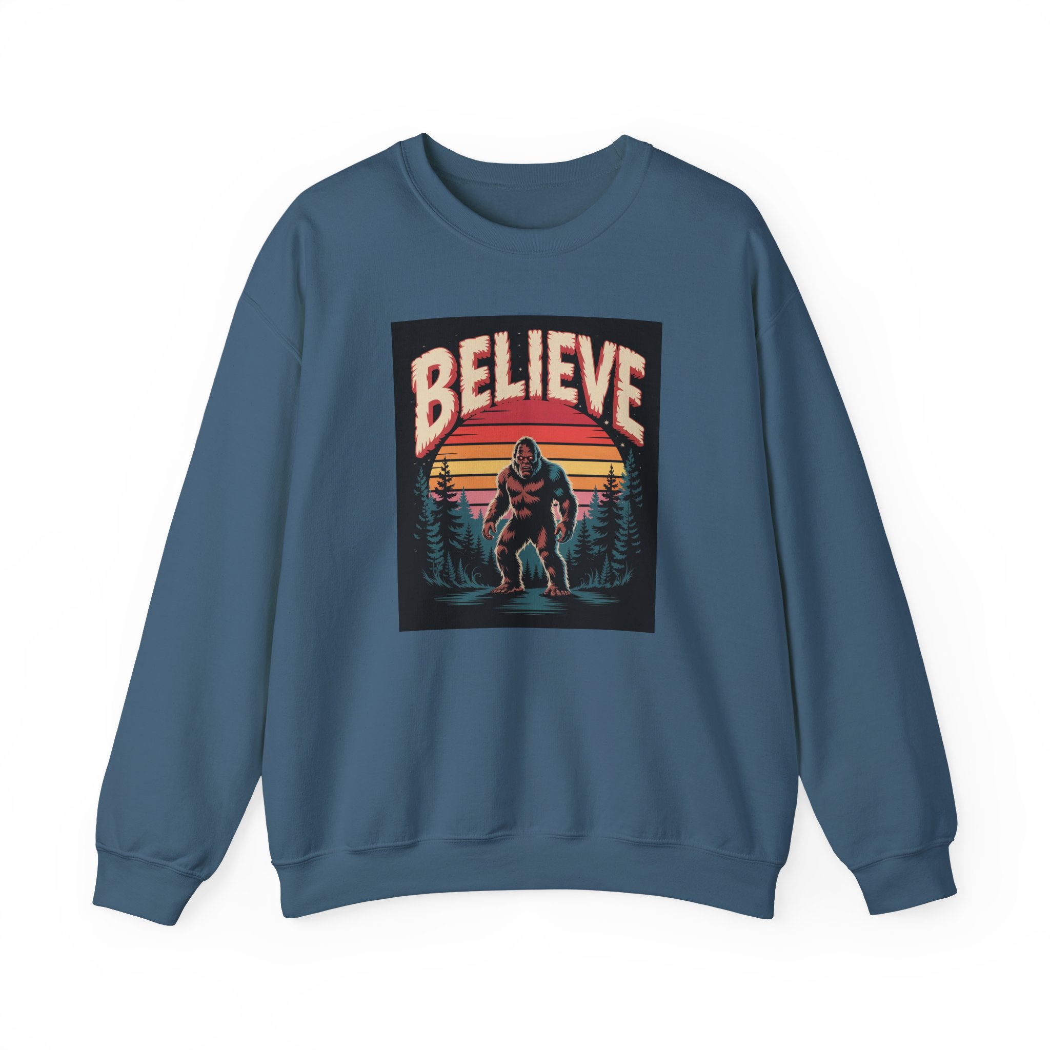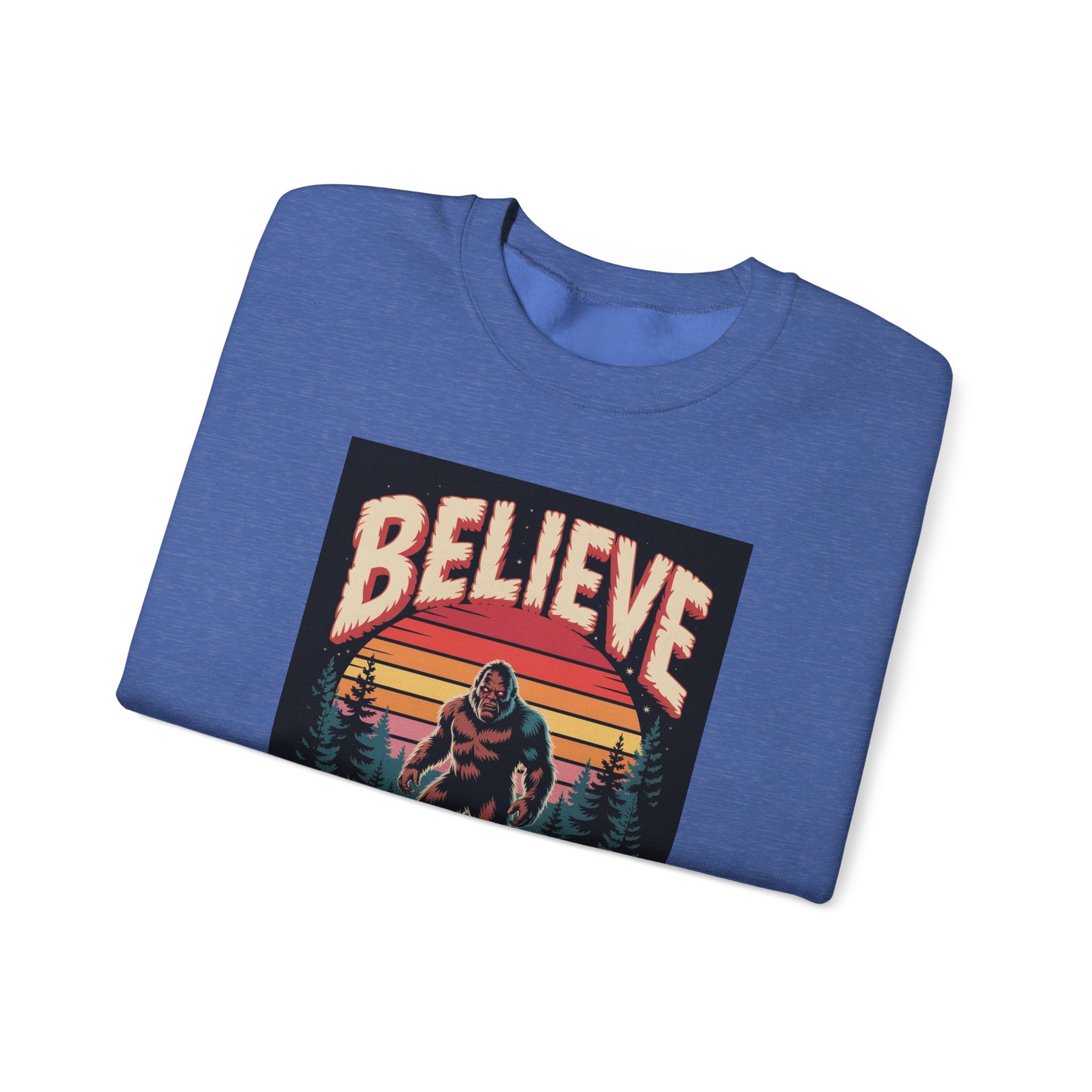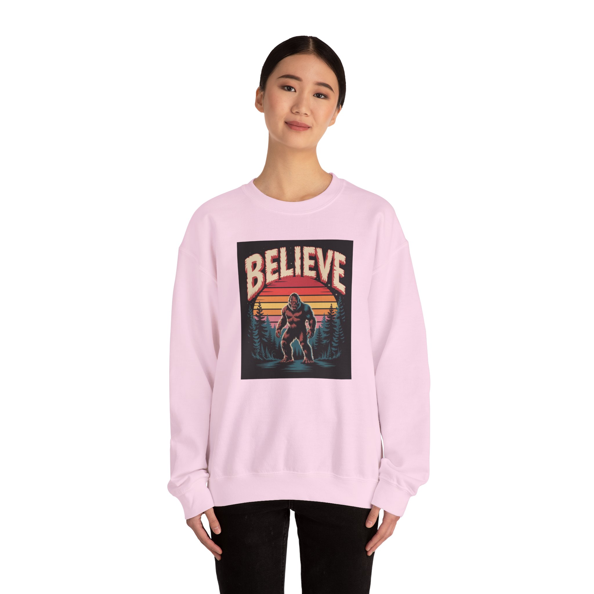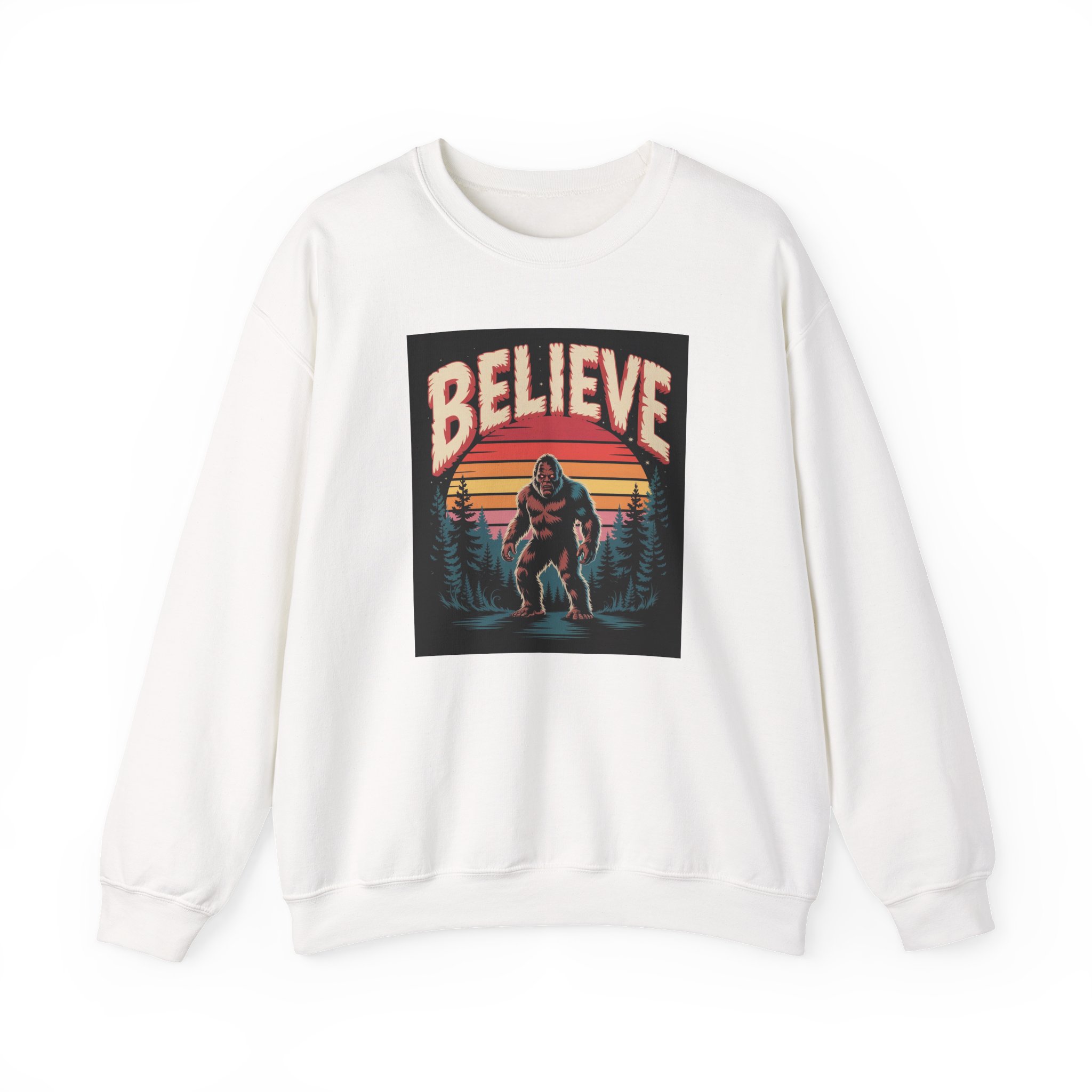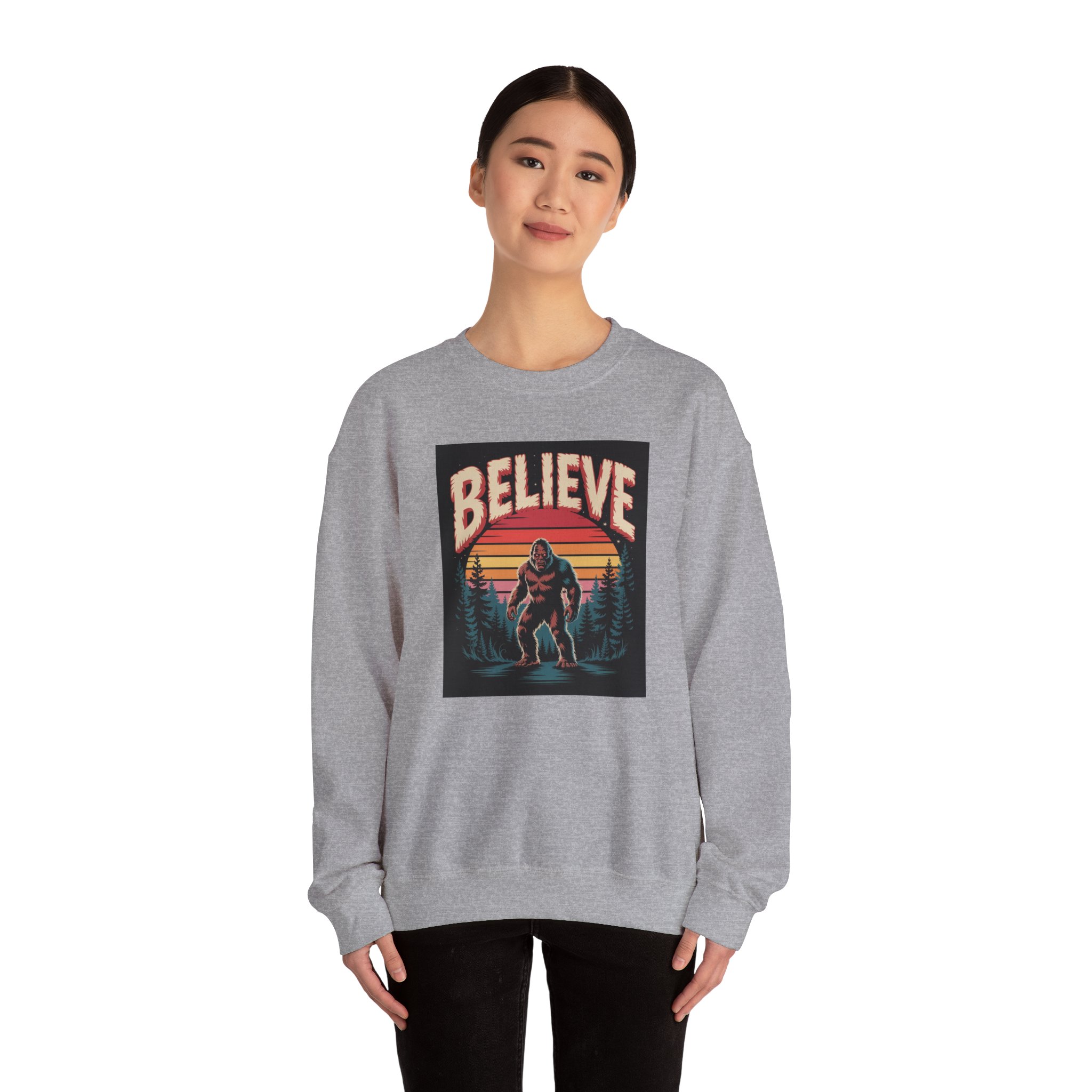 This vintage-style graphic poster depicts a Bigfoot or Sasquatch creature standing in a misty forest landscape with a retro sunset gradient backdrop. The word “BELIEVE” is prominently displayed in large, textured letters above the creature, suggesting a theme of cryptozoological mystery and folklore. The Sasquatch is rendered in detailed, muscular silhouette, standing in shallow water with a line of dark green pine trees framing the background. The color palette features warm sunset tones of red, orange, and yellow, transitioning to cooler blue-green hues in the forest and water. The overall design has a nostalgic, 1980s-inspired aesthetic with a slightly grungy, screenprinted look that emphasizes the mythical and enigmatic nature of the legendary creature.