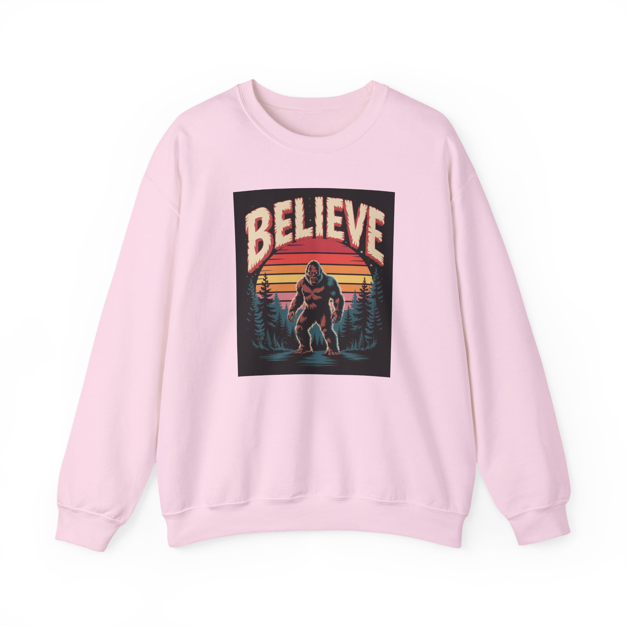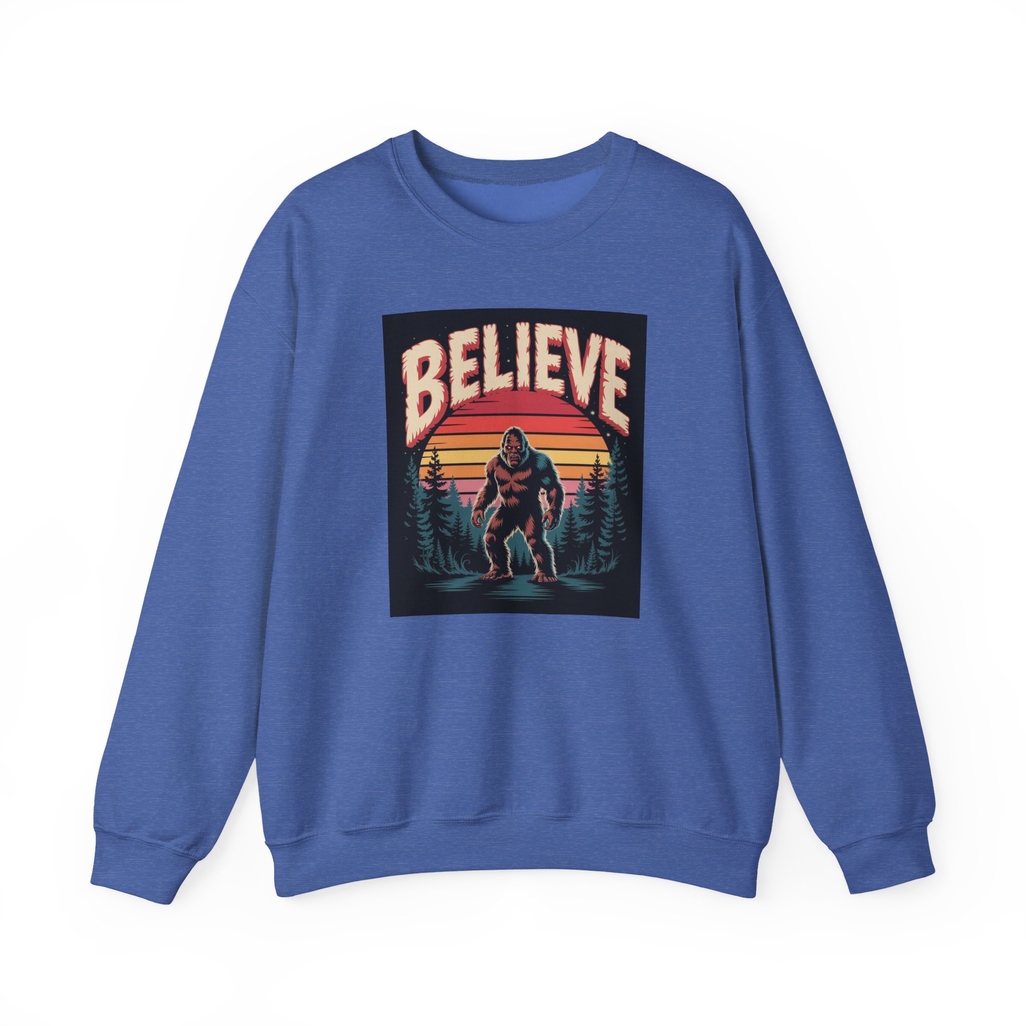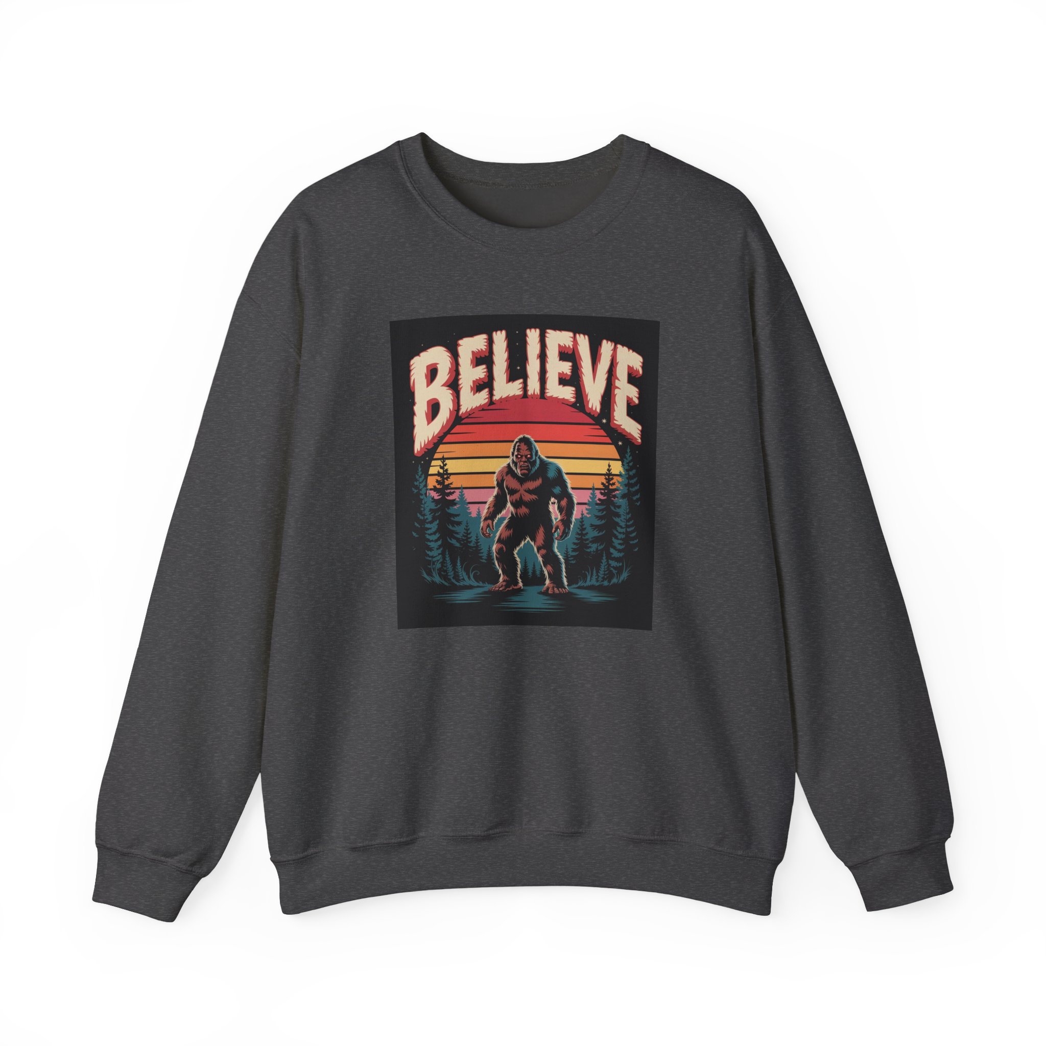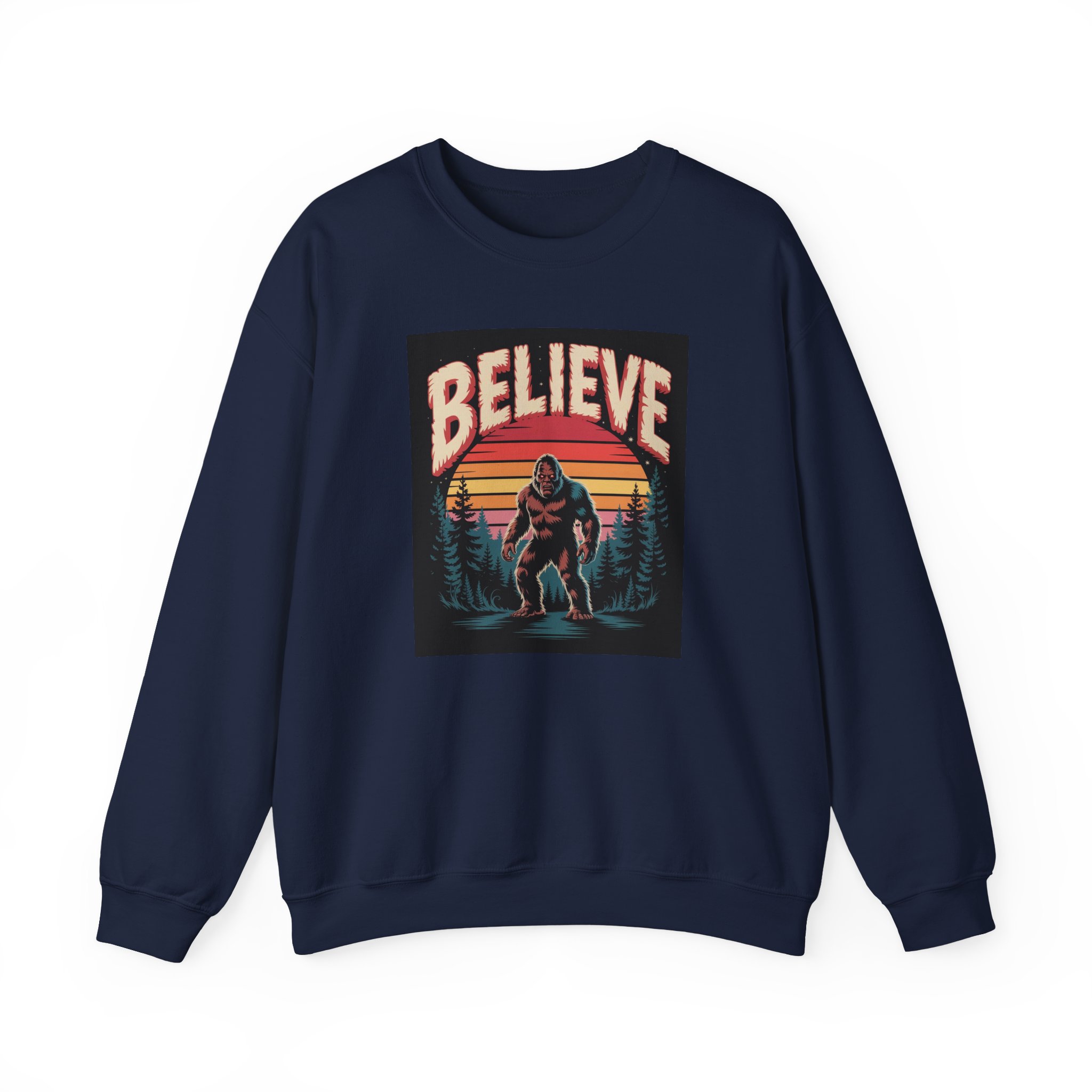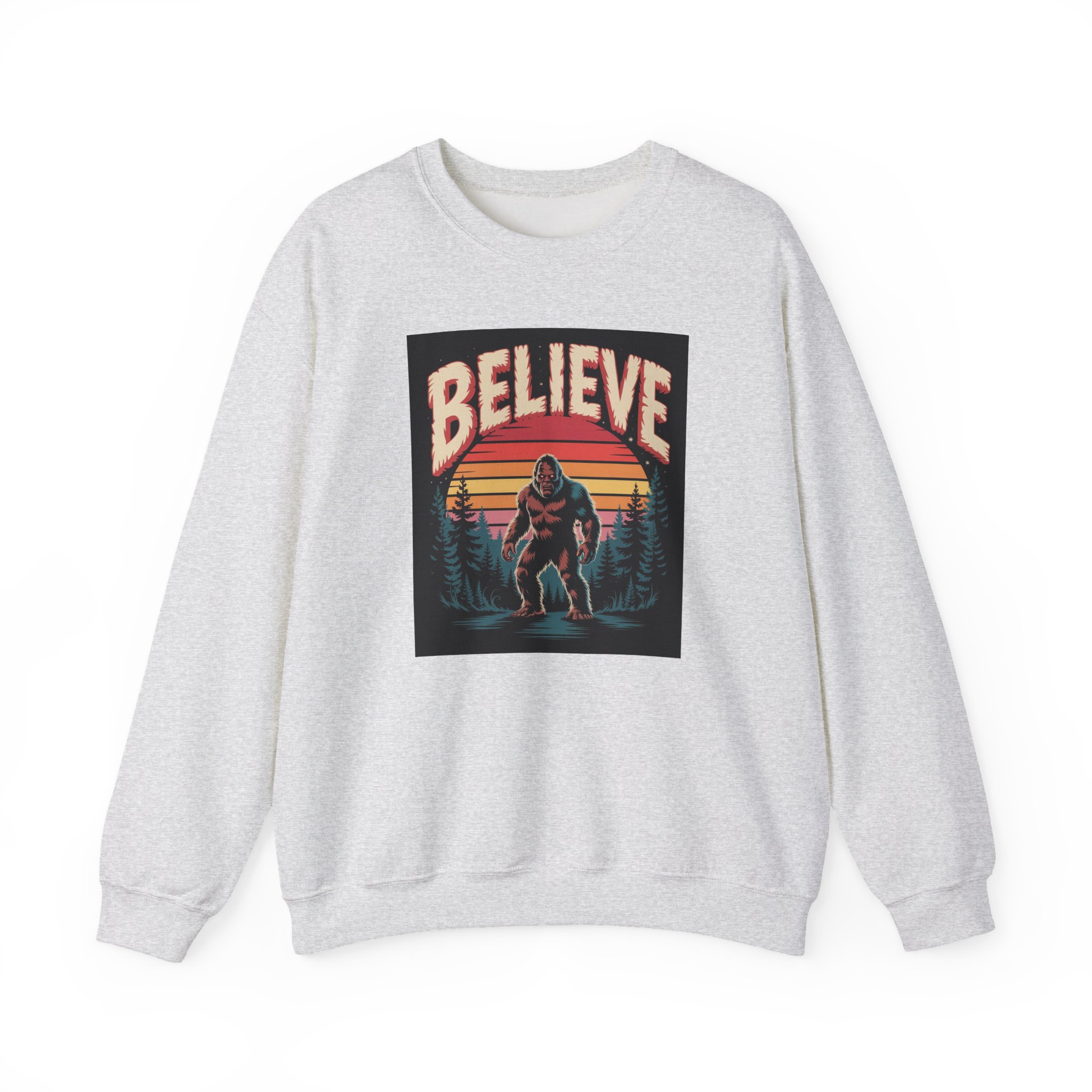 This vintage-style graphic poster depicts a Bigfoot or Sasquatch creature standing in a misty forest landscape with a retro sunset gradient backdrop. The word “BELIEVE” is prominently displayed in large, textured letters above the creature, suggesting a theme of cryptozoological mystery and folklore. The Sasquatch is rendered in detailed, muscular silhouette, standing in shallow water with a line of dark green pine trees framing the background. The color palette features warm sunset tones of red, orange, and yellow, transitioning to cooler blue-green hues in the forest and water. The overall design has a nostalgic, 1980s-inspired aesthetic with a slightly grungy, screenprinted look that emphasizes the mythical and enigmatic nature of the legendary creature.