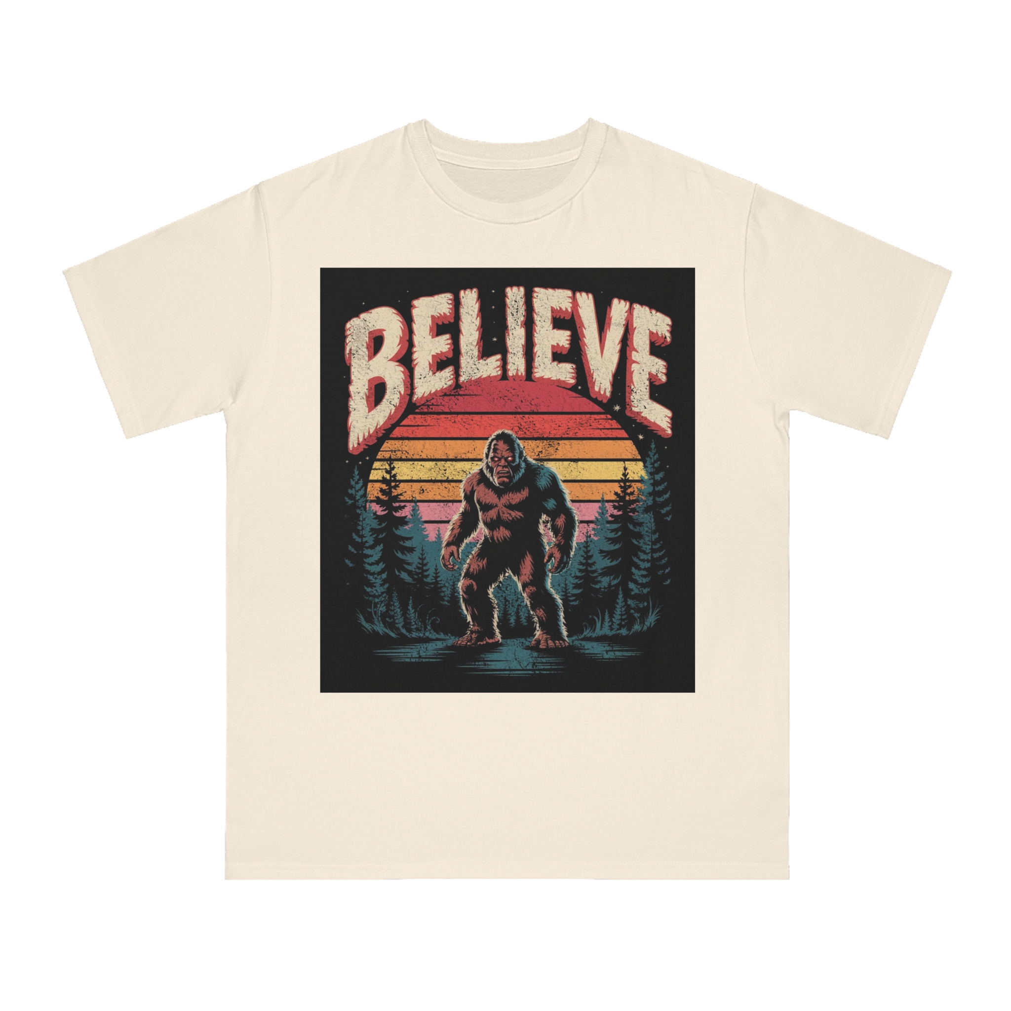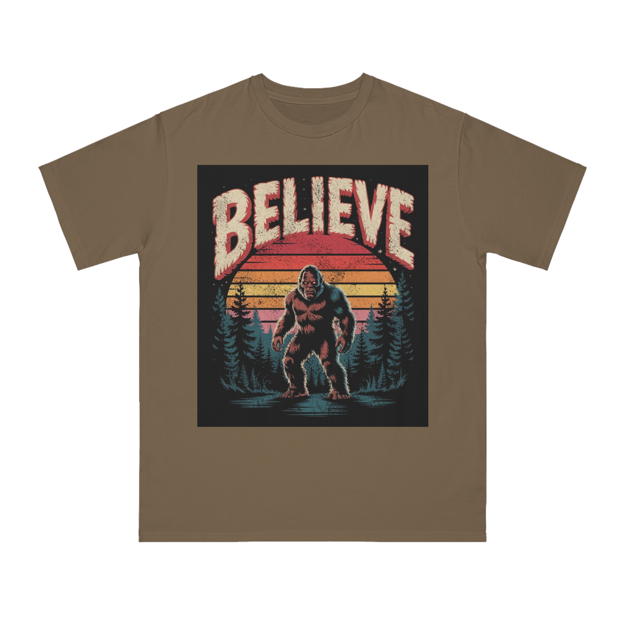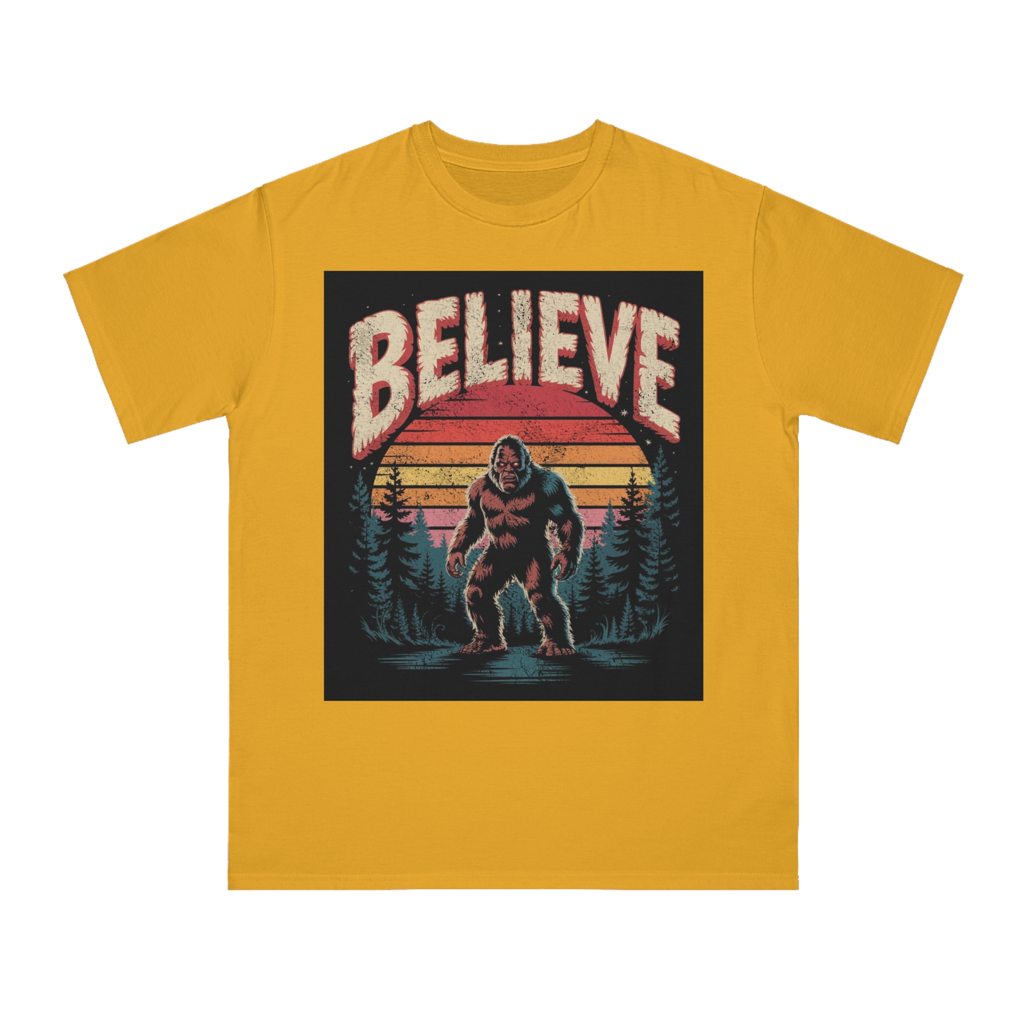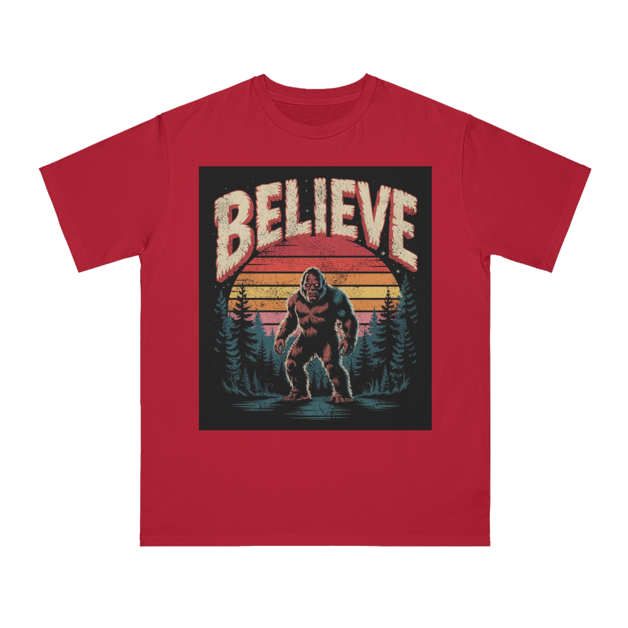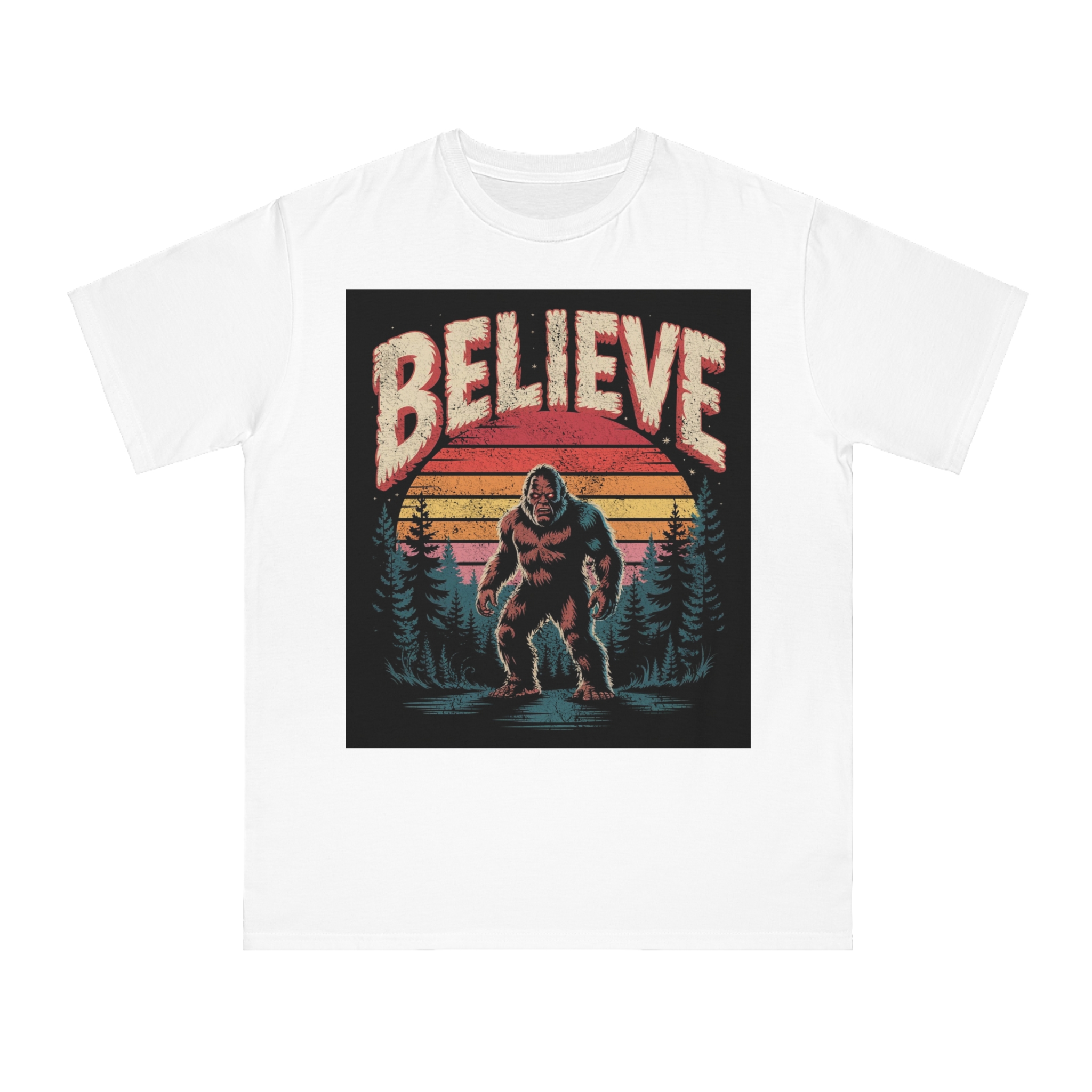 This vintage-style graphic design poster features a Bigfoot or Sasquatch creature standing in a misty forest landscape with a retro sunset backdrop. The word “BELIEVE” is prominently displayed at the top of the image in large, distressed lettering with a textured, weathered appearance. The cryptid is depicted in a menacing pose, standing in water with a reflection, surrounded by silhouetted pine trees against a gradient background of sunset colors ranging from deep red to orange and yellow. The image has a nostalgic, slightly grungy aesthetic reminiscent of 1970s and 80s graphic design and cryptozoology culture. Small white stars are scattered in the dark background, adding to the mysterious and mythical atmosphere of the illustration.