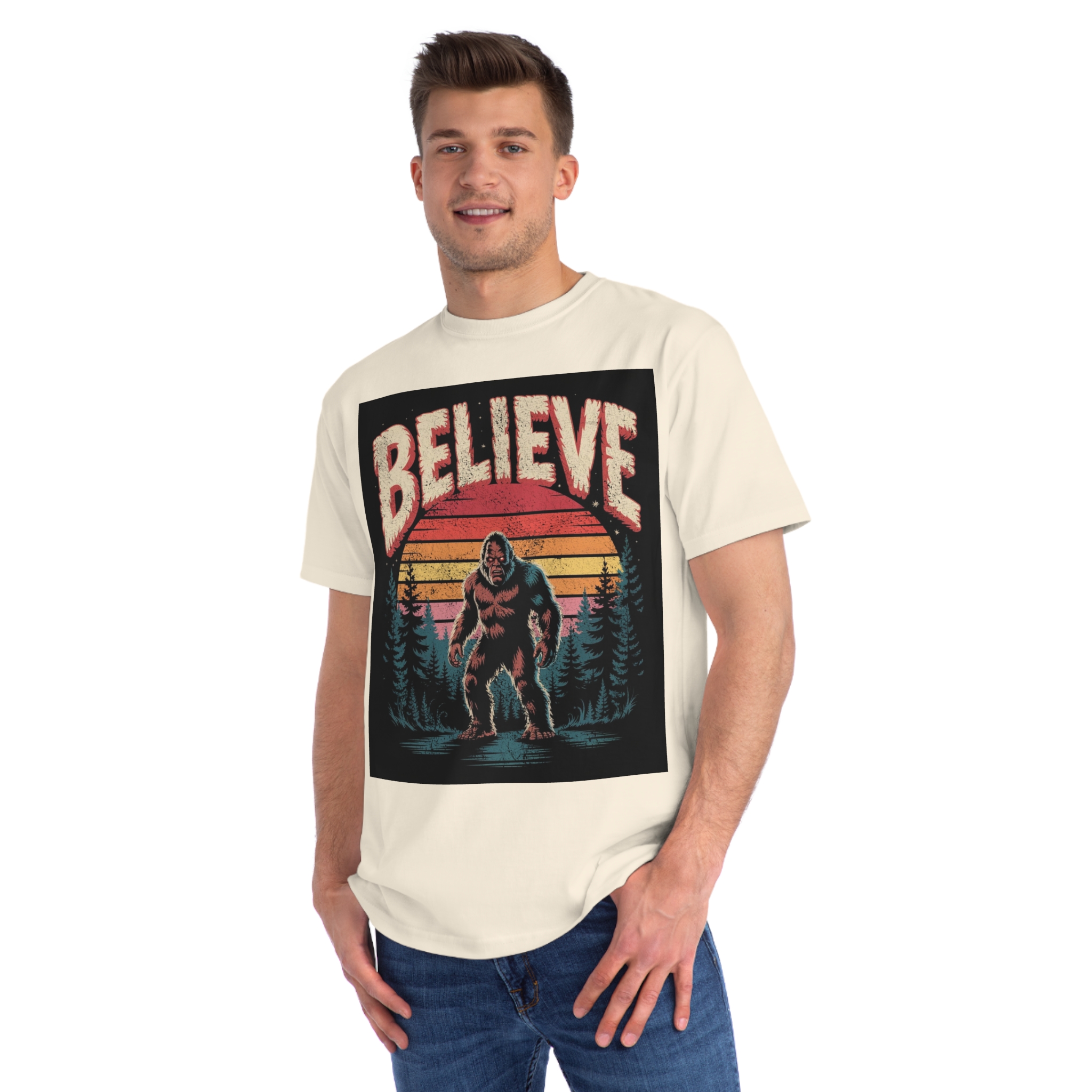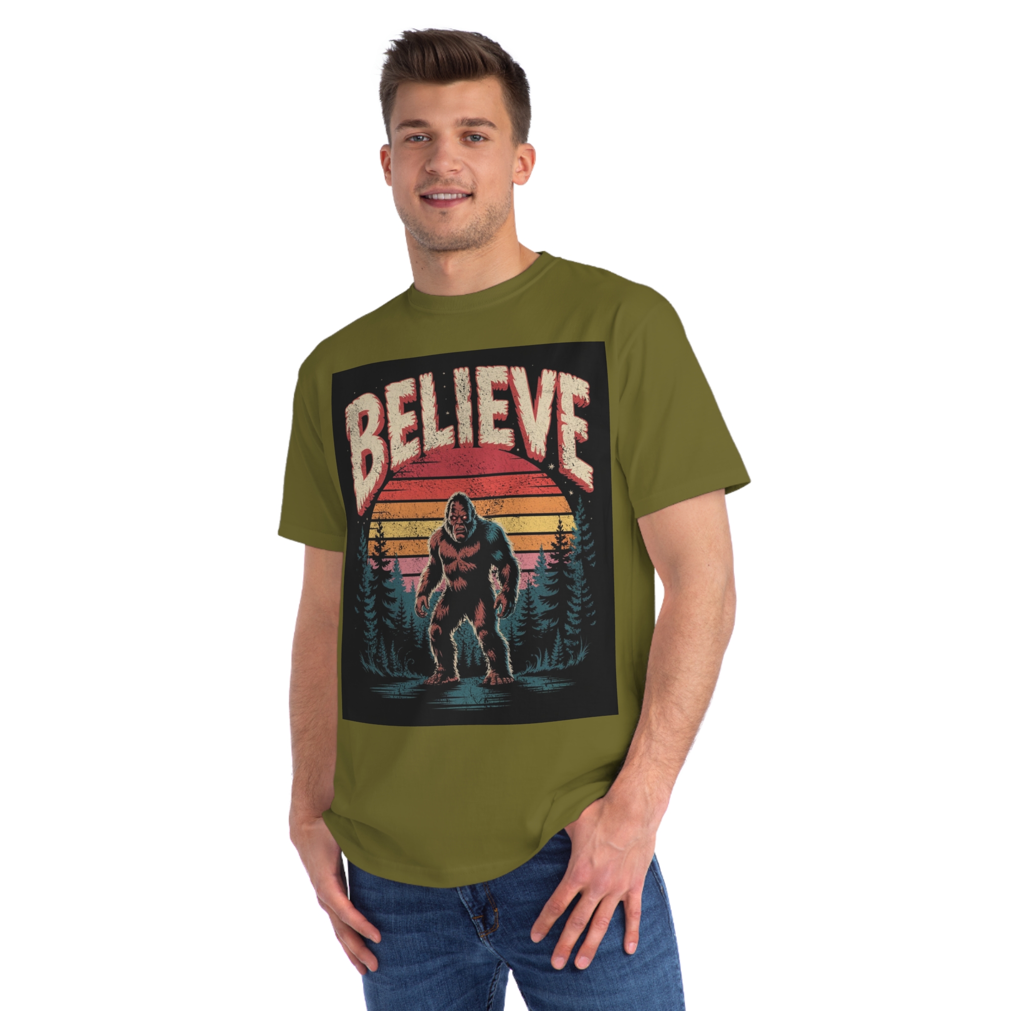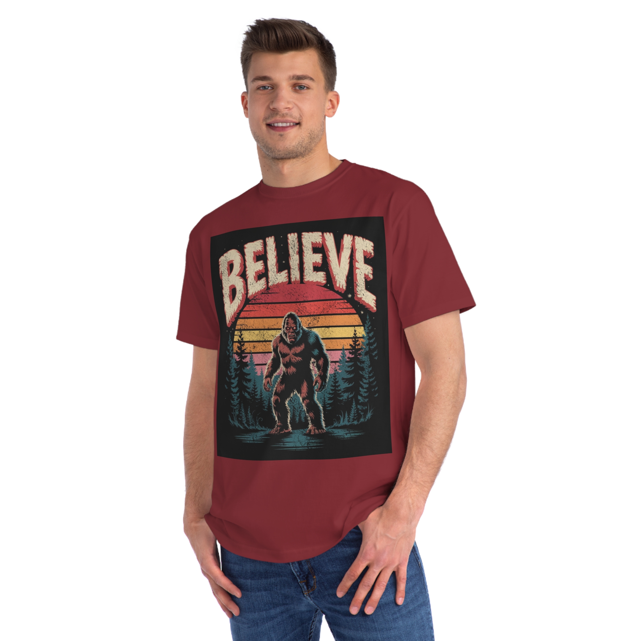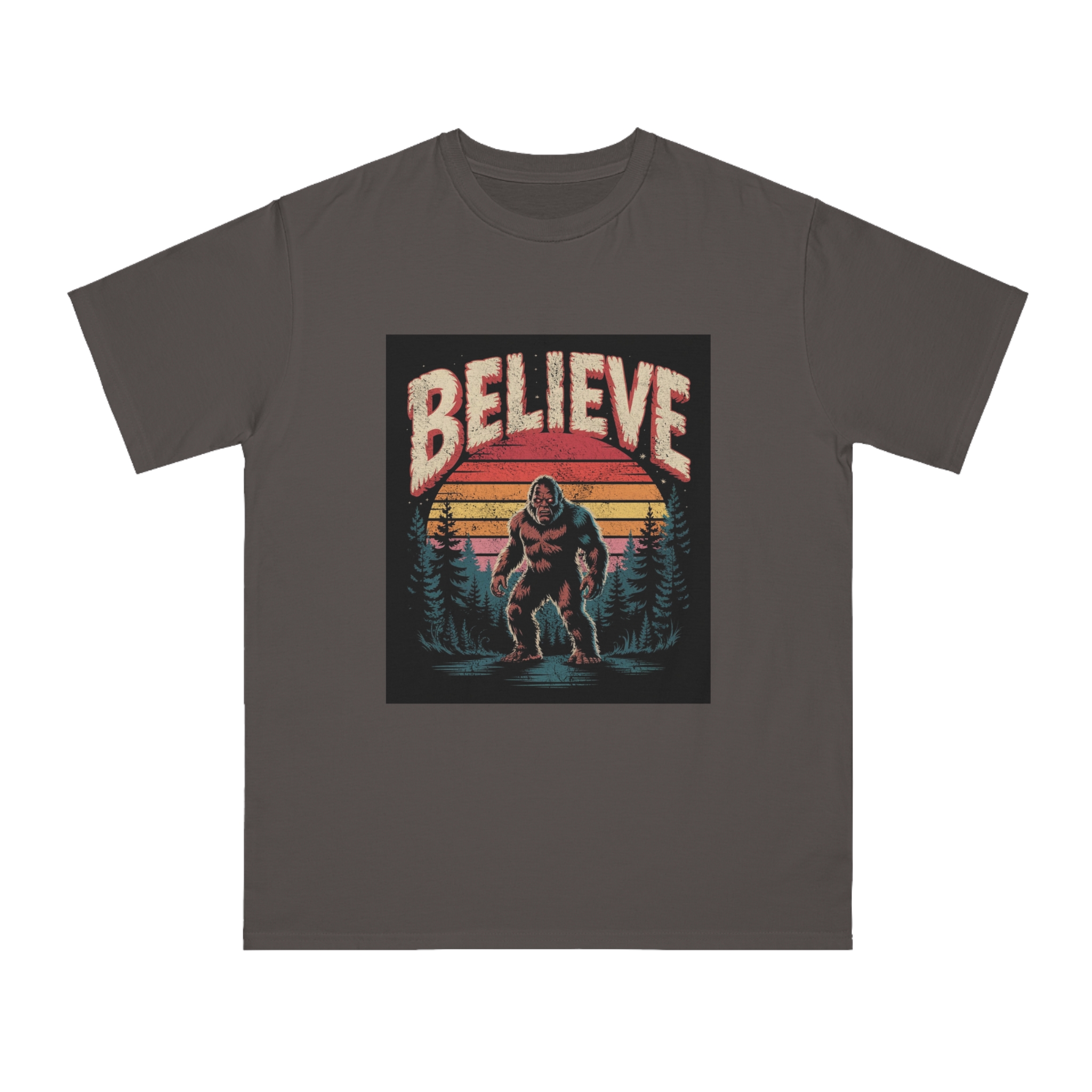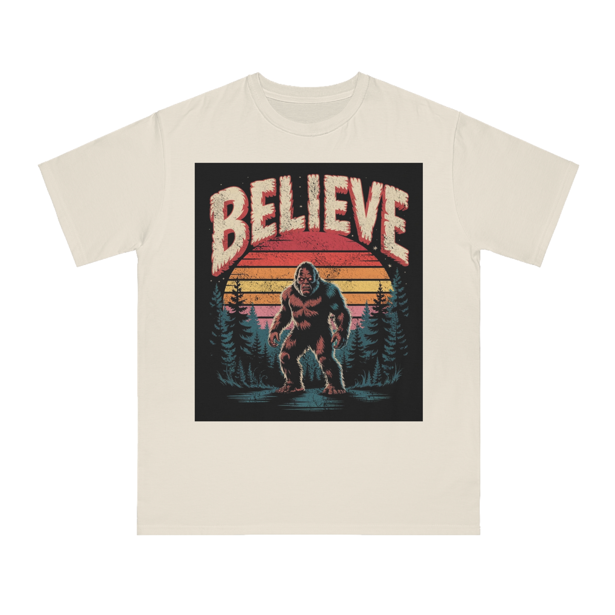 This vintage-style graphic design poster features a Bigfoot or Sasquatch creature standing in a misty forest landscape with a retro sunset backdrop. The word “BELIEVE” is prominently displayed at the top of the image in large, distressed lettering with a textured, weathered appearance. The cryptid is depicted in a menacing pose, standing in water with a reflection, surrounded by silhouetted pine trees against a gradient background of sunset colors ranging from deep red to orange and yellow. The image has a nostalgic, slightly grungy aesthetic reminiscent of 1970s and 80s graphic design and cryptozoology culture. Small white stars are scattered in the dark background, adding to the mysterious and mythical atmosphere of the illustration.