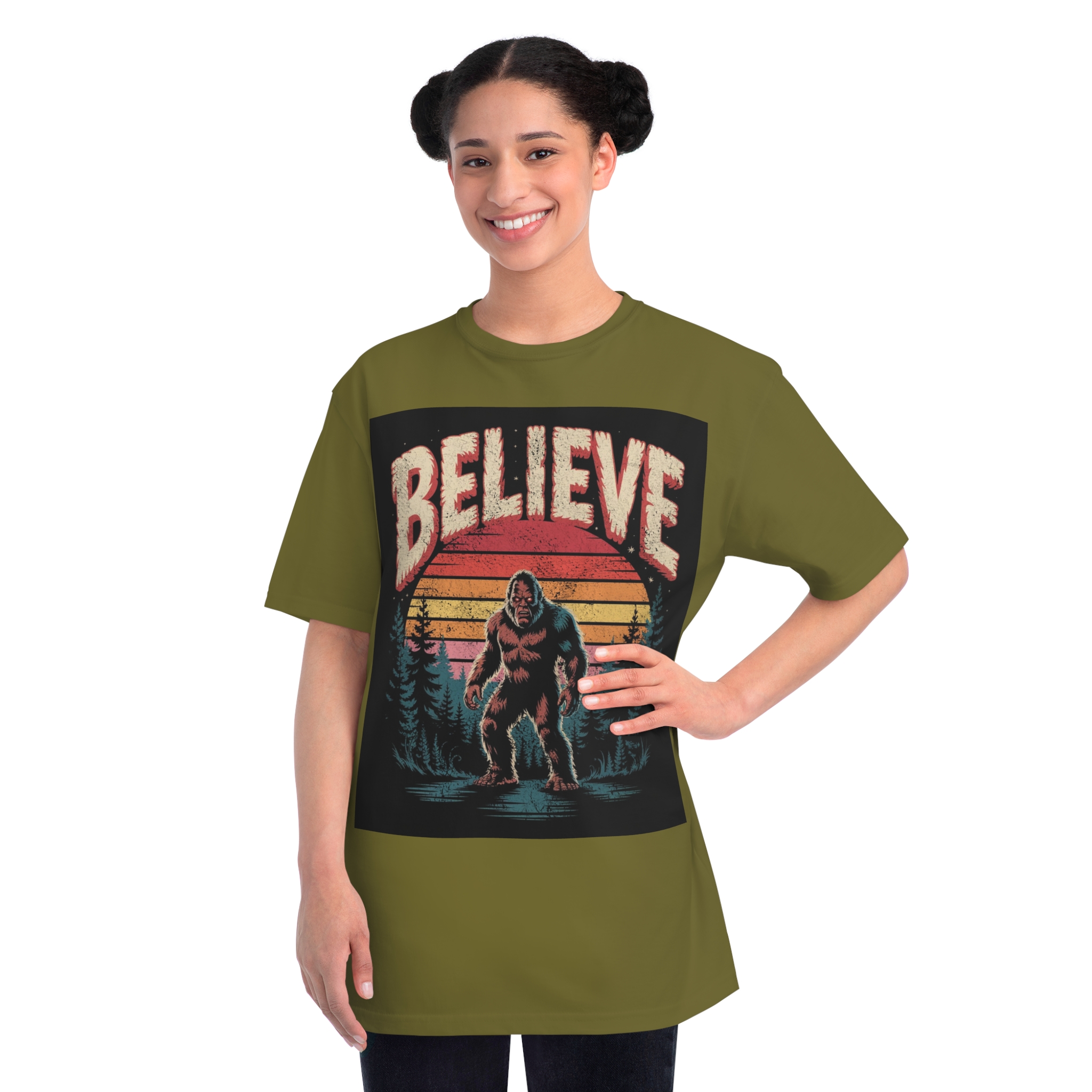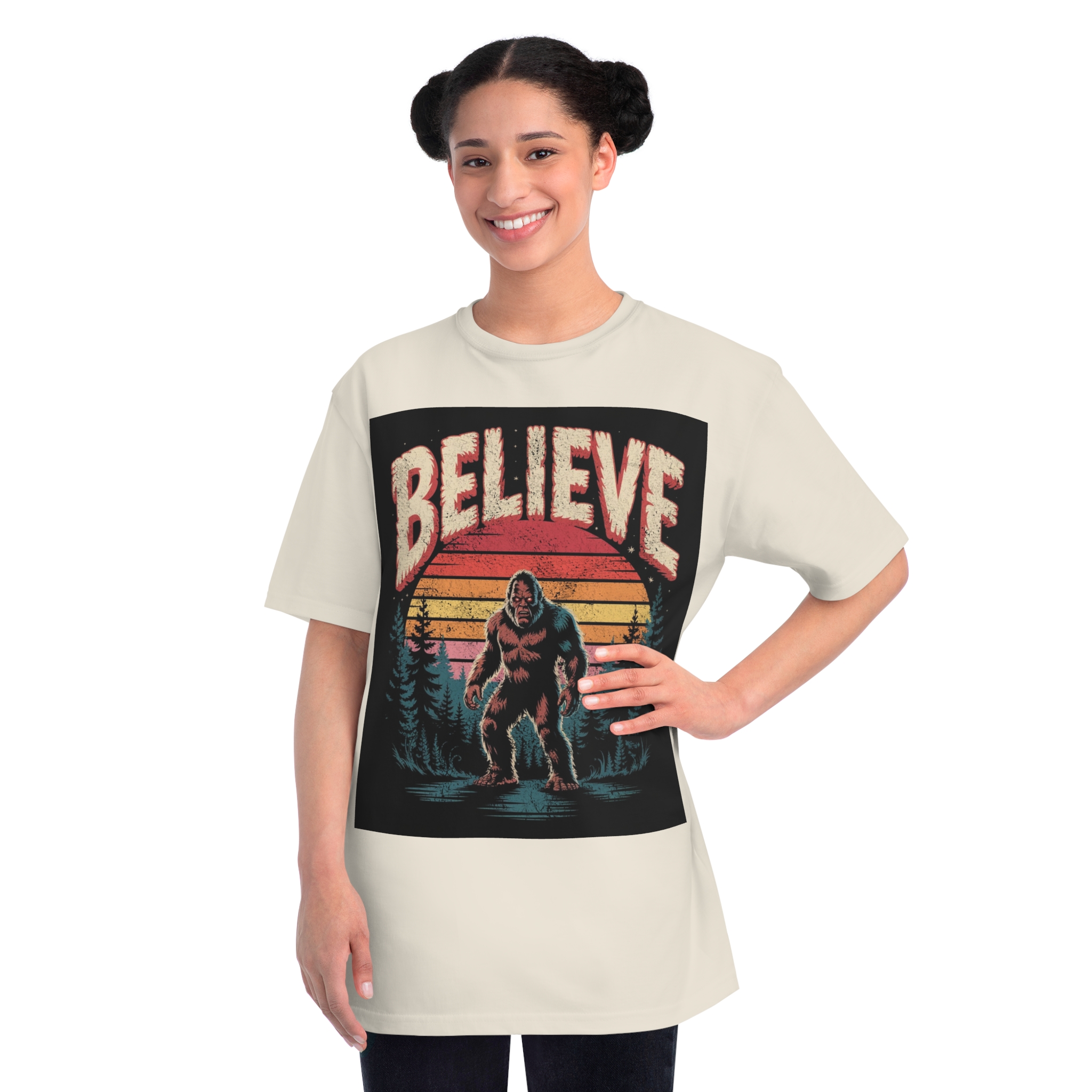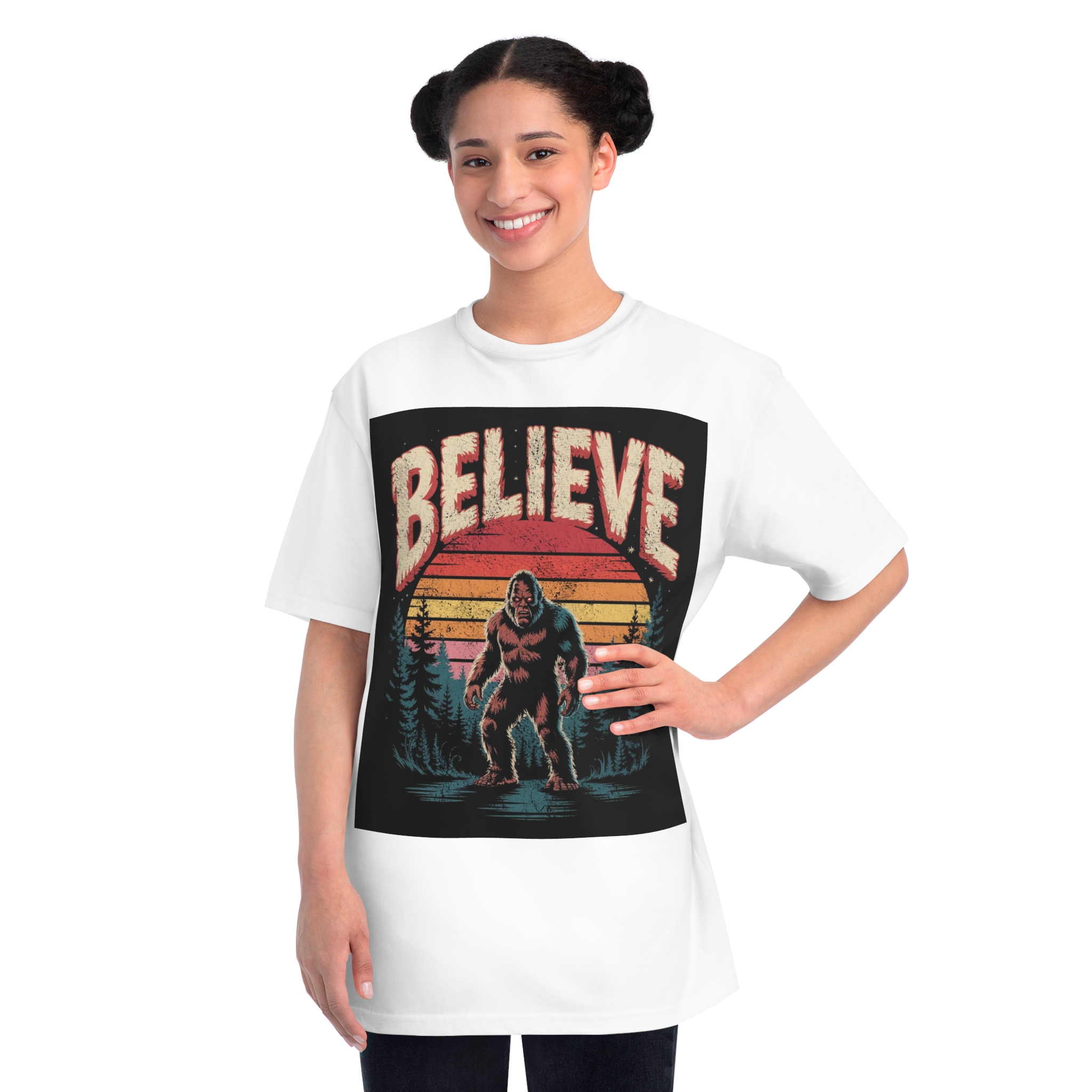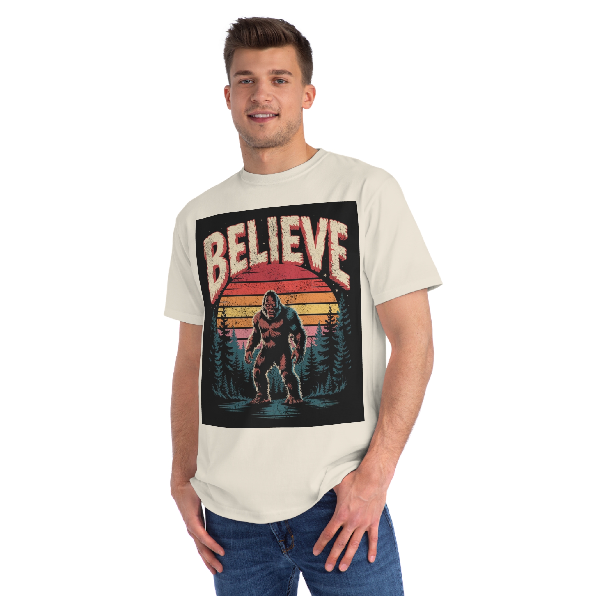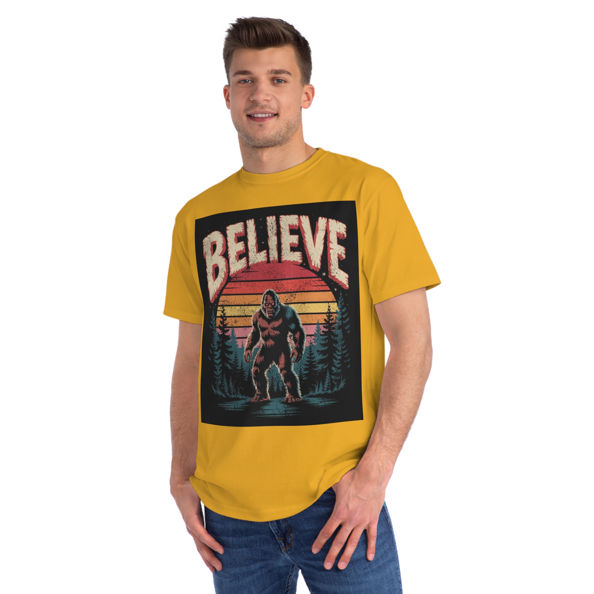 This vintage-style graphic design poster features a Bigfoot or Sasquatch creature standing in a misty forest landscape with a retro sunset backdrop. The word “BELIEVE” is prominently displayed at the top of the image in large, distressed lettering with a textured, weathered appearance. The cryptid is depicted in a menacing pose, standing in water with a reflection, surrounded by silhouetted pine trees against a gradient background of sunset colors ranging from deep red to orange and yellow. The image has a nostalgic, slightly grungy aesthetic reminiscent of 1970s and 80s graphic design and cryptozoology culture. Small white stars are scattered in the dark background, adding to the mysterious and mythical atmosphere of the illustration.