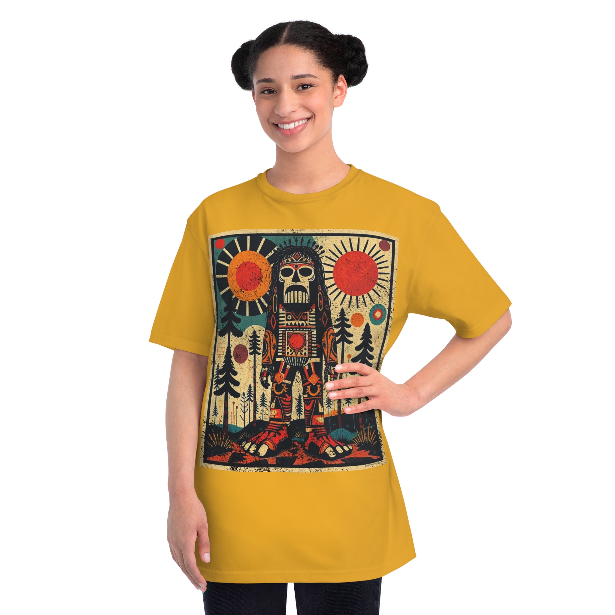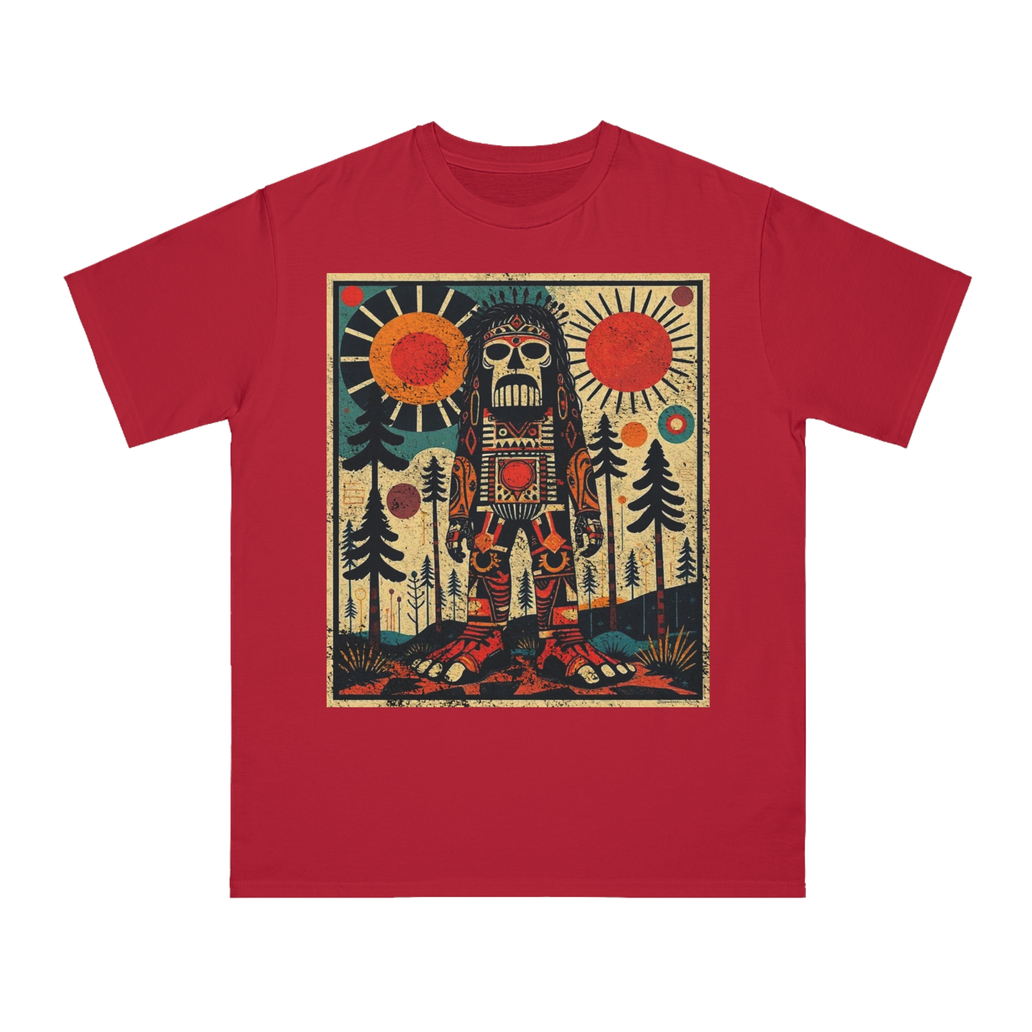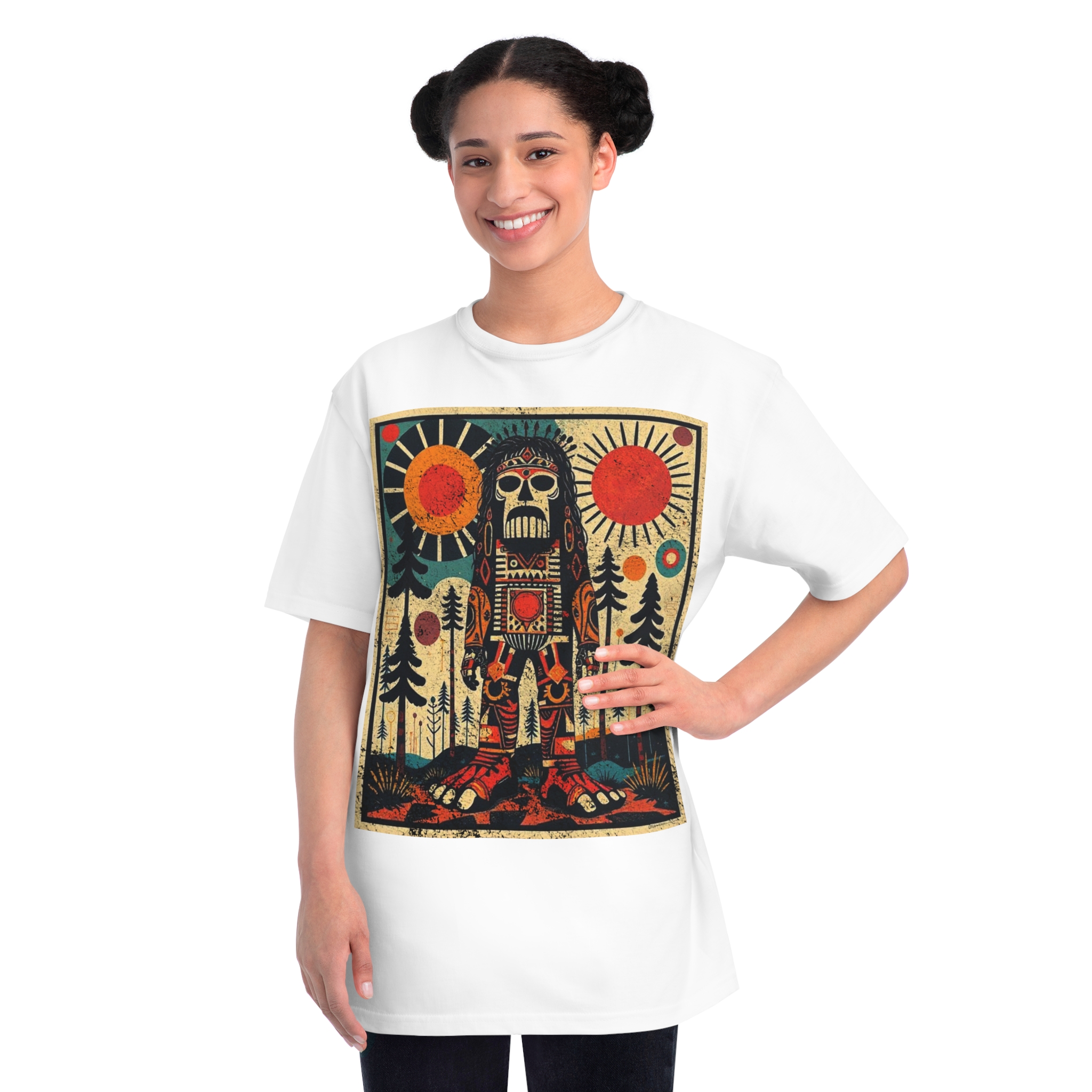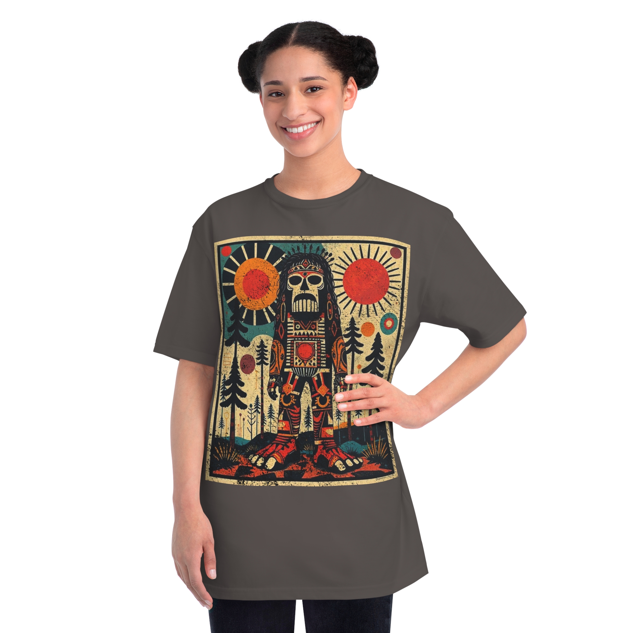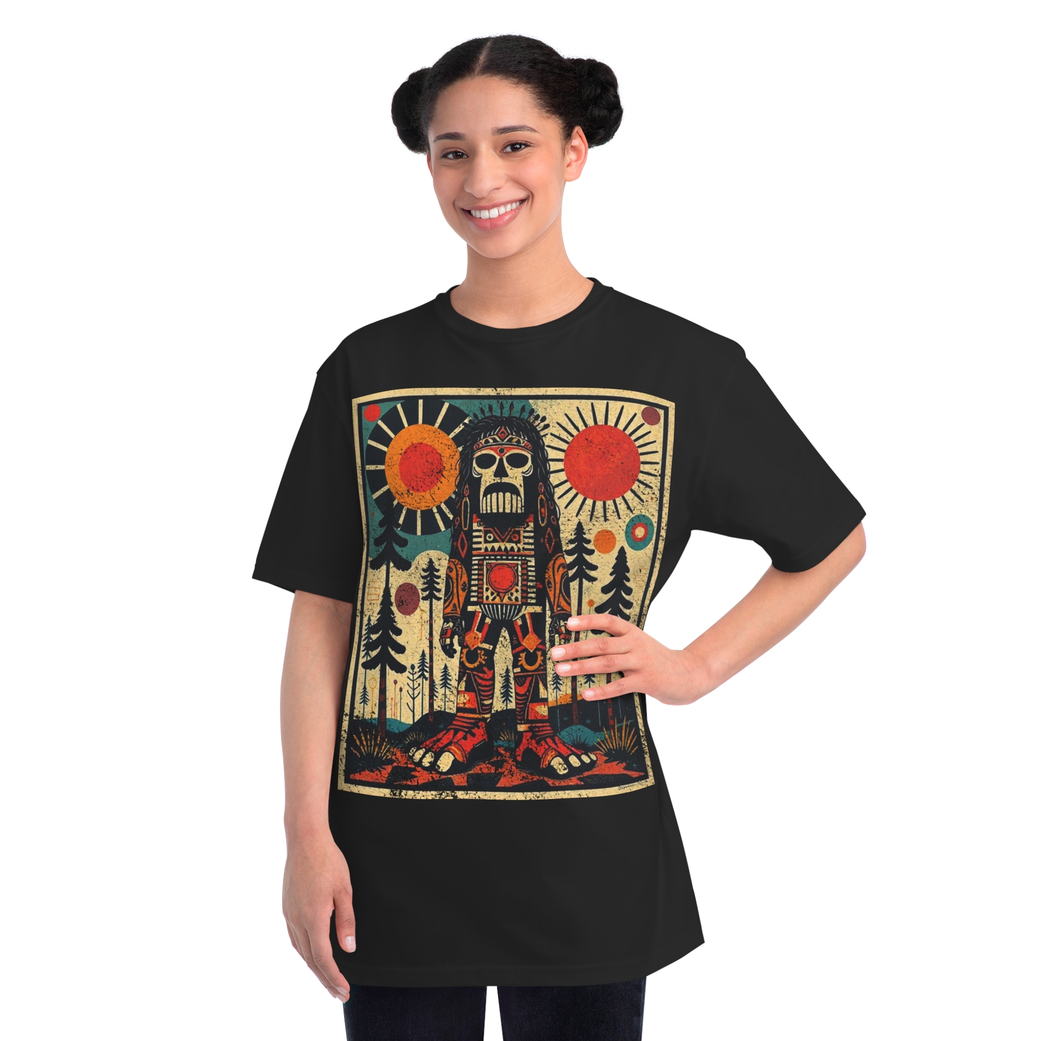 This striking illustration depicts a stylized skeletal figure in the midst of a forest landscape, rendered in a bold, graphic style reminiscent of indigenous or folk art. The central figure appears to be a skull-faced entity adorned with a headdress and intricate geometric patterns, standing tall among pine trees with two vibrant suns or moons framing its sides. The color palette is rich with warm oranges, deep reds, blacks, and teals, creating a dramatic and textured visual effect that suggests age and weathering. Circular elements of varying sizes are scattered throughout the composition, adding visual interest and a sense of cosmic symbolism. The artwork combines elements of traditional Native American or Mexican folk art with a modern, slightly grungy graphic design aesthetic, resulting in a powerful and mystical representation of a spiritual or mythological figure.