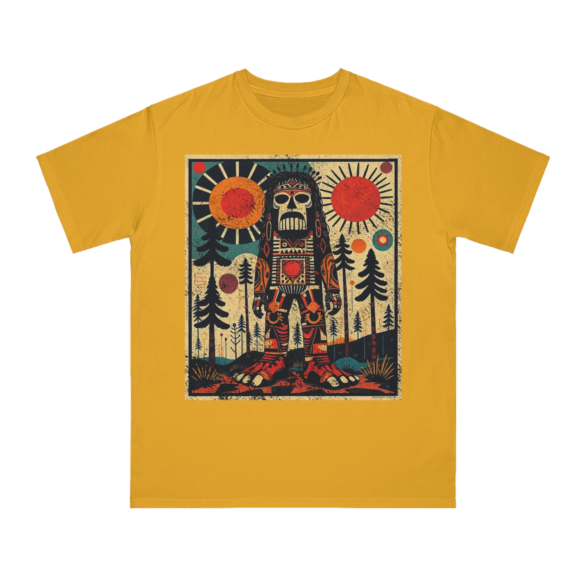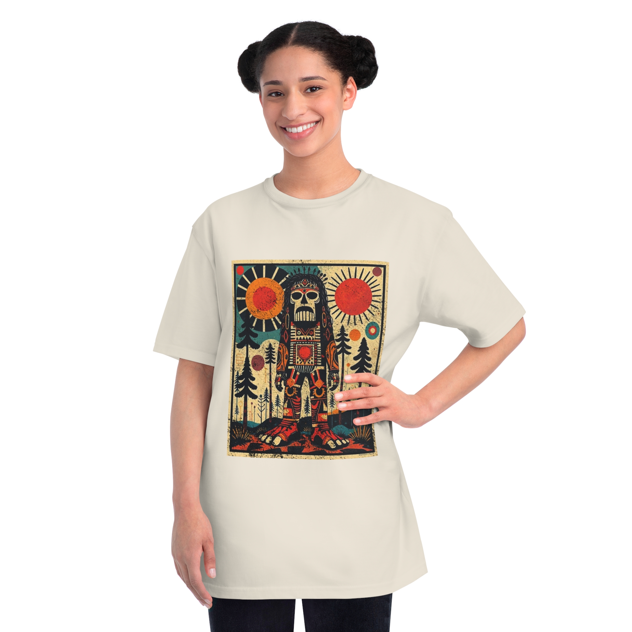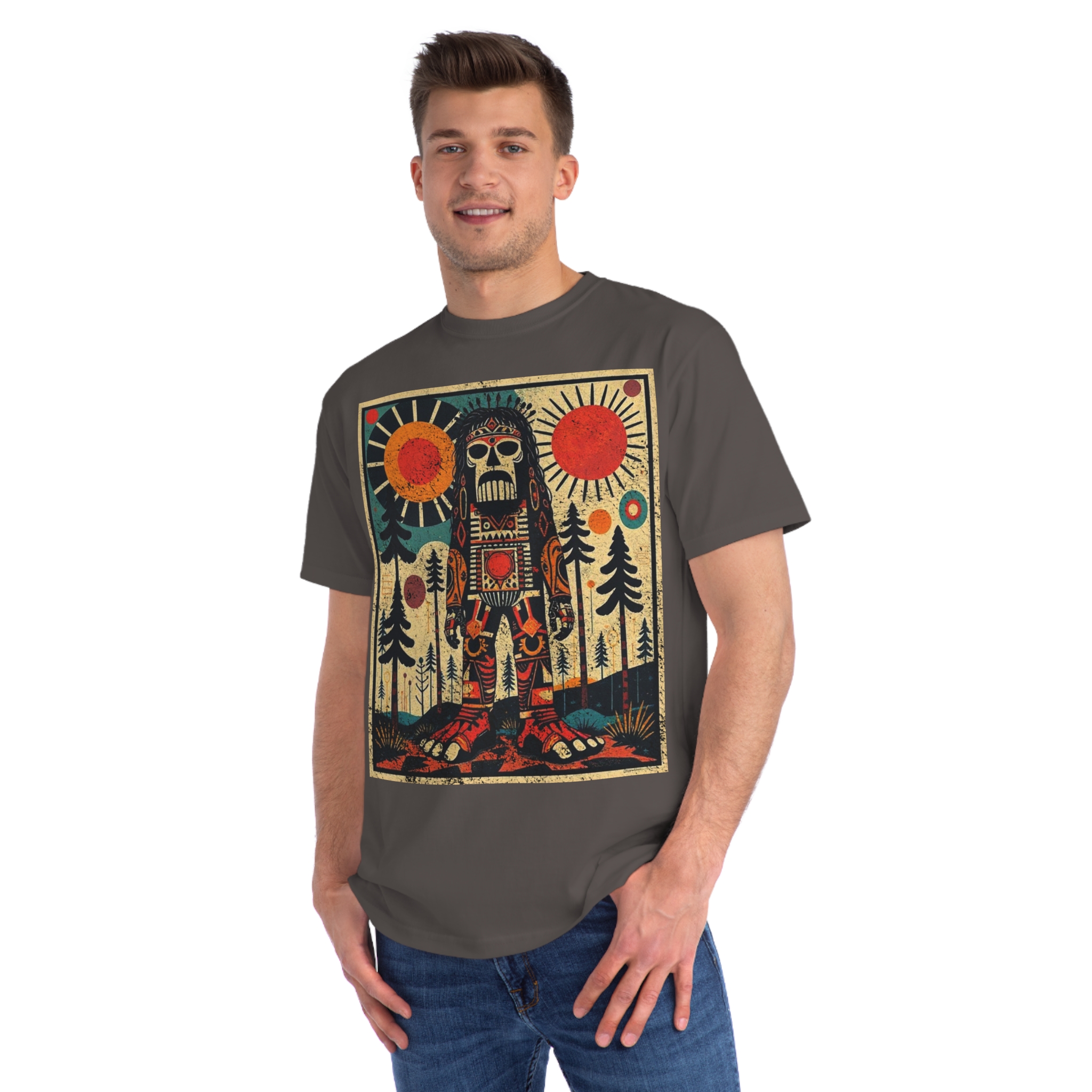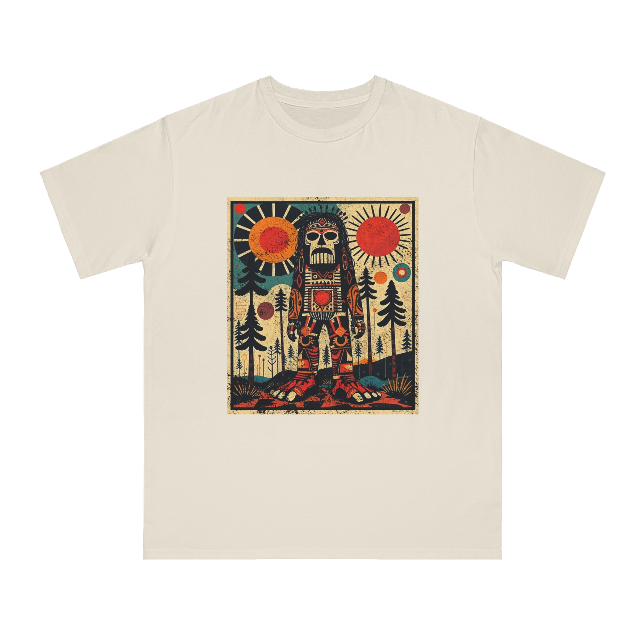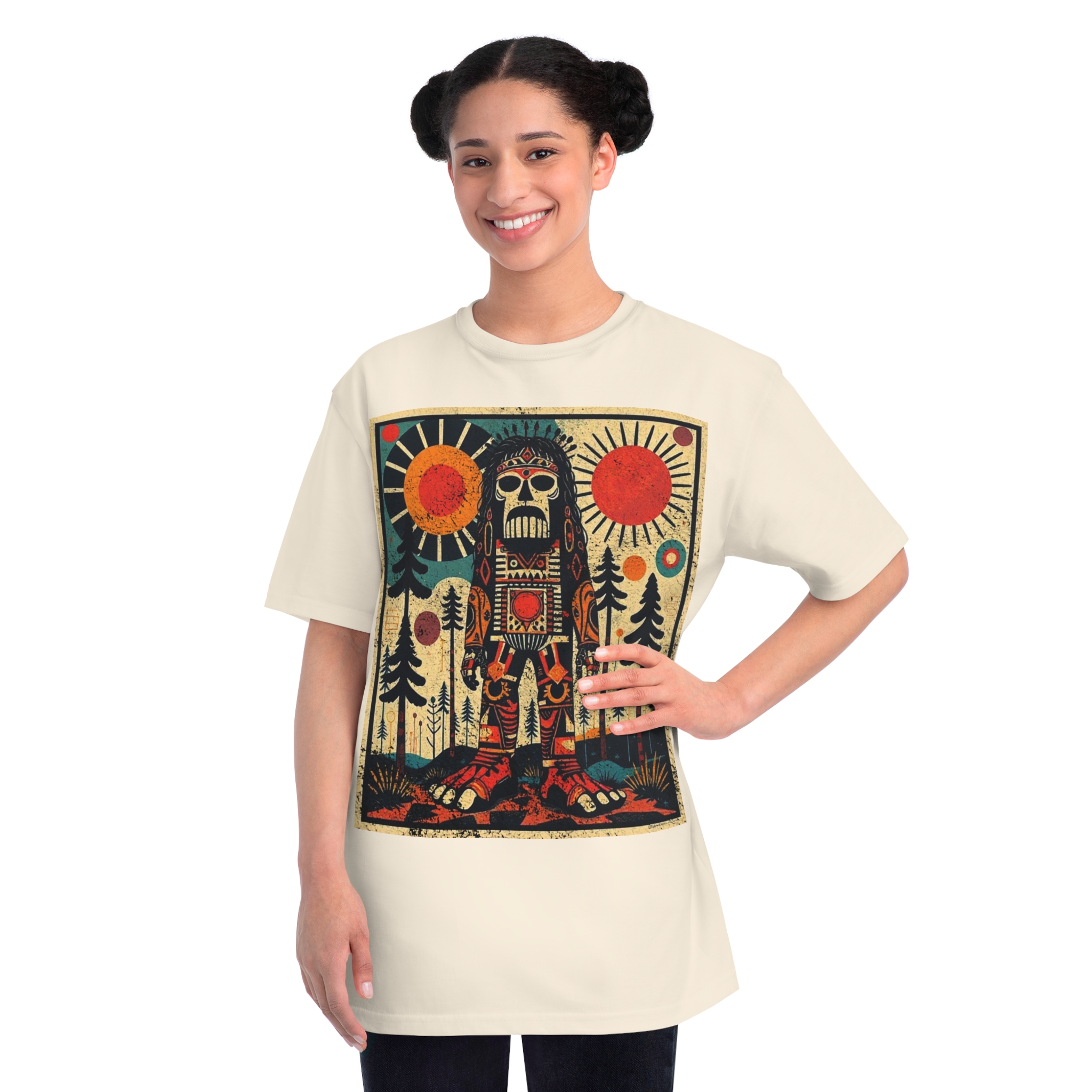 This striking illustration depicts a stylized skeletal figure in the midst of a forest landscape, rendered in a bold, graphic style reminiscent of indigenous or folk art. The central figure appears to be a skull-faced entity adorned with a headdress and intricate geometric patterns, standing tall among pine trees with two vibrant suns or moons framing its sides. The color palette is rich with warm oranges, deep reds, blacks, and teals, creating a dramatic and textured visual effect that suggests age and weathering. Circular elements of varying sizes are scattered throughout the composition, adding visual interest and a sense of cosmic symbolism. The artwork combines elements of traditional Native American or Mexican folk art with a modern, slightly grungy graphic design aesthetic, resulting in a powerful and mystical representation of a spiritual or mythological figure.