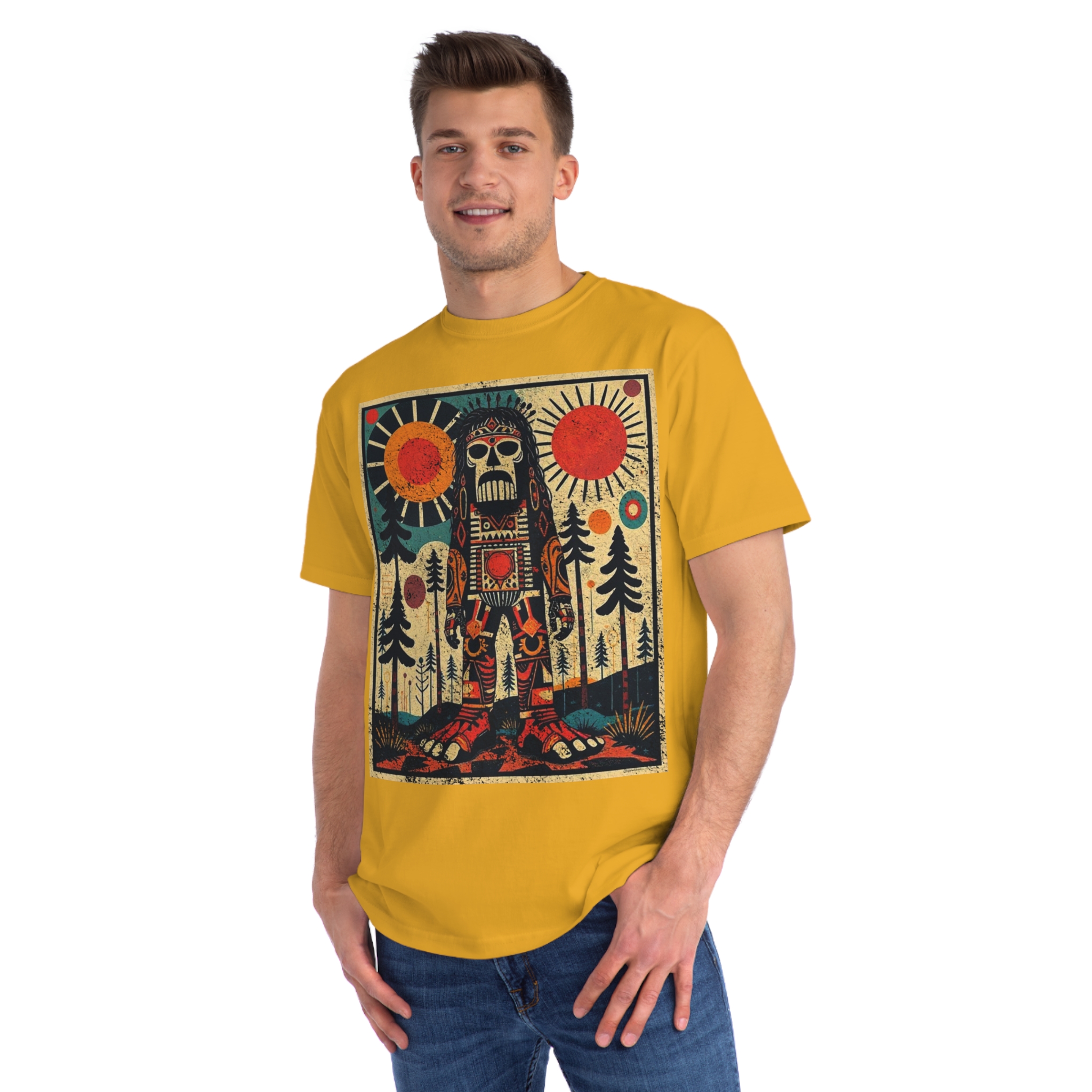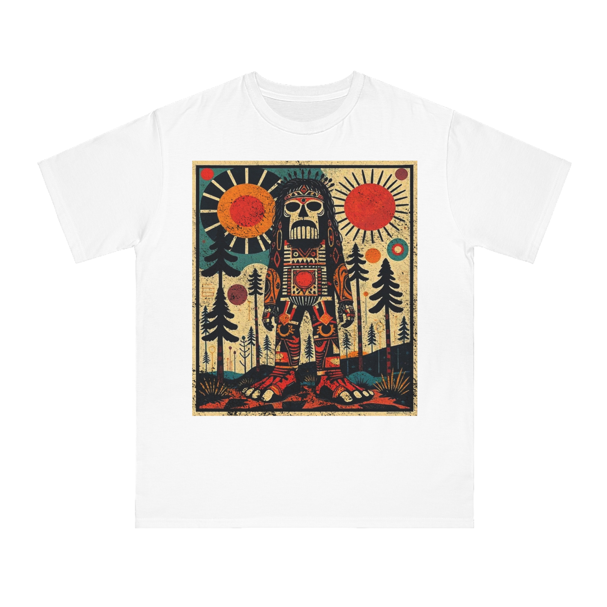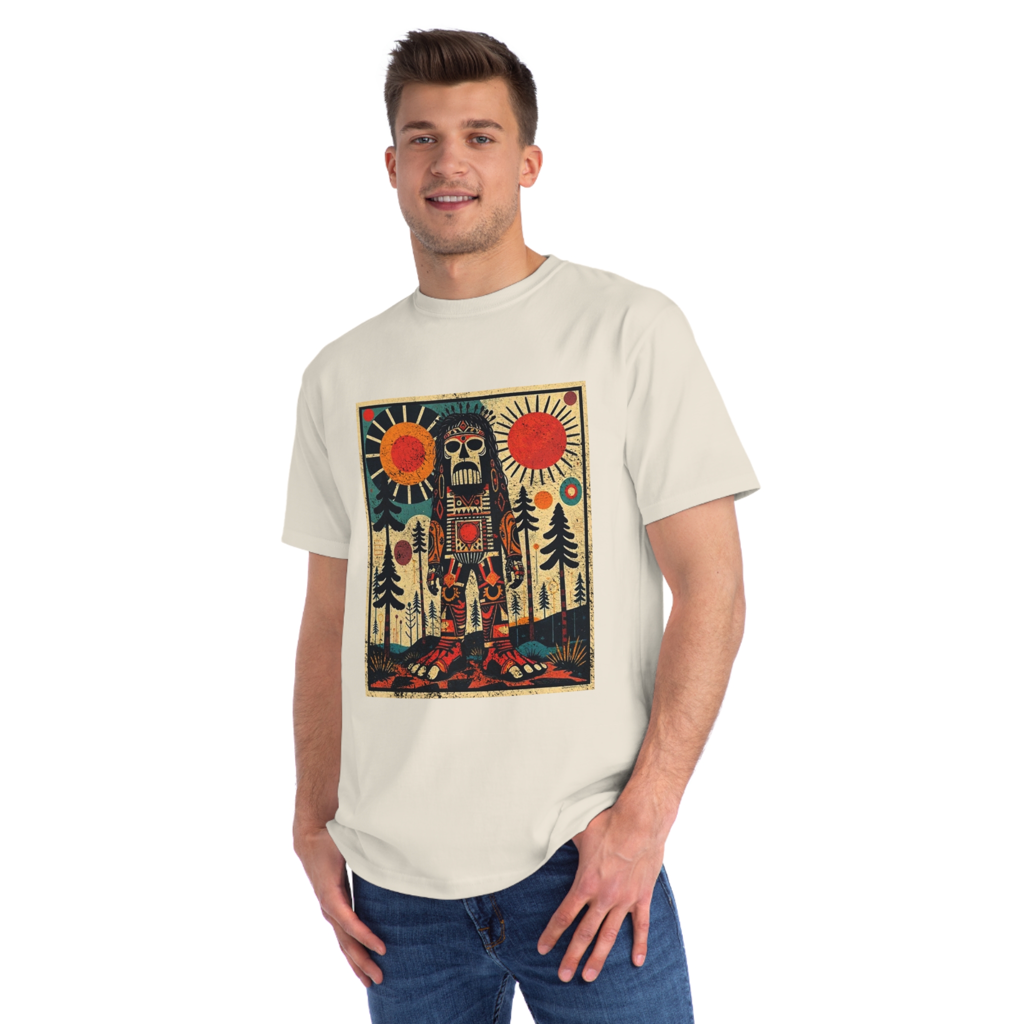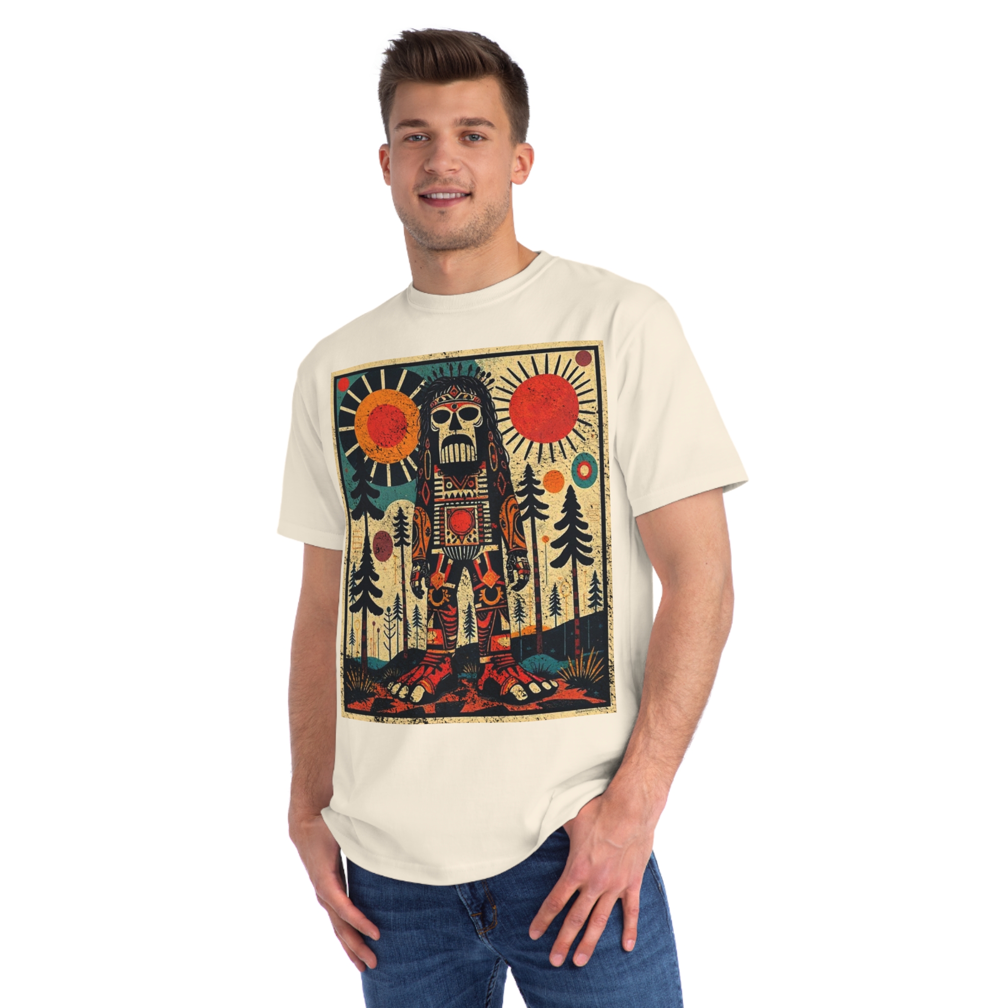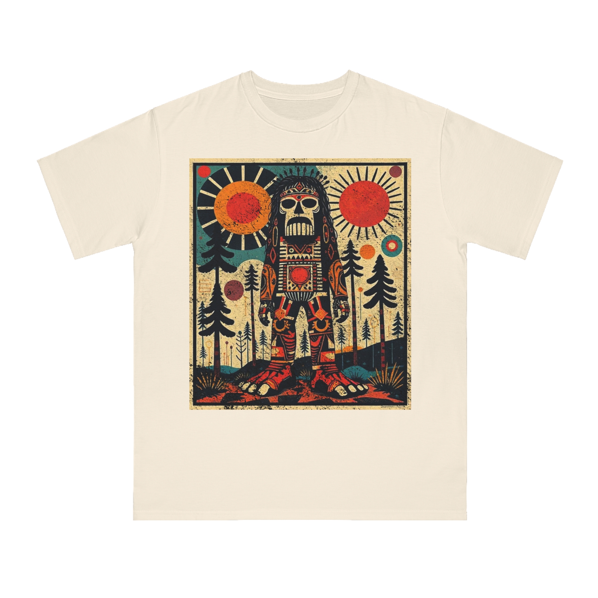 This striking illustration depicts a stylized skeletal figure in the midst of a forest landscape, rendered in a bold, graphic style reminiscent of indigenous or folk art. The central figure appears to be a skull-faced entity adorned with a headdress and intricate geometric patterns, standing tall among pine trees with two vibrant suns or moons framing its sides. The color palette is rich with warm oranges, deep reds, blacks, and teals, creating a dramatic and textured visual effect that suggests age and weathering. Circular elements of varying sizes are scattered throughout the composition, adding visual interest and a sense of cosmic symbolism. The artwork combines elements of traditional Native American or Mexican folk art with a modern, slightly grungy graphic design aesthetic, resulting in a powerful and mystical representation of a spiritual or mythological figure.