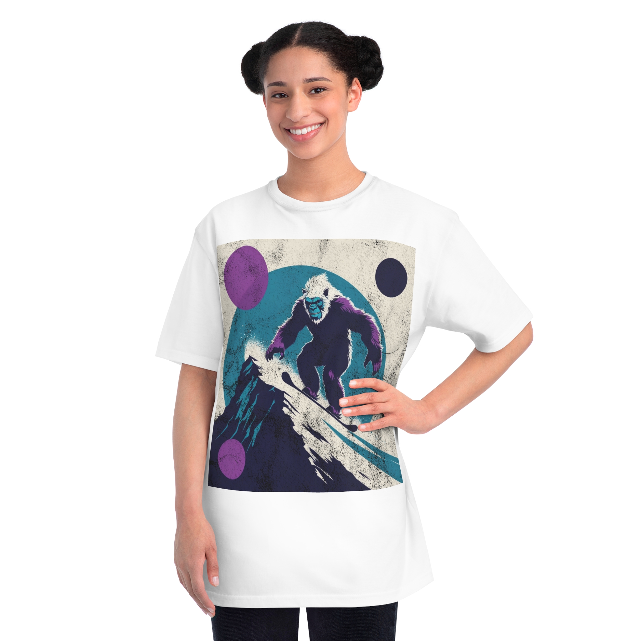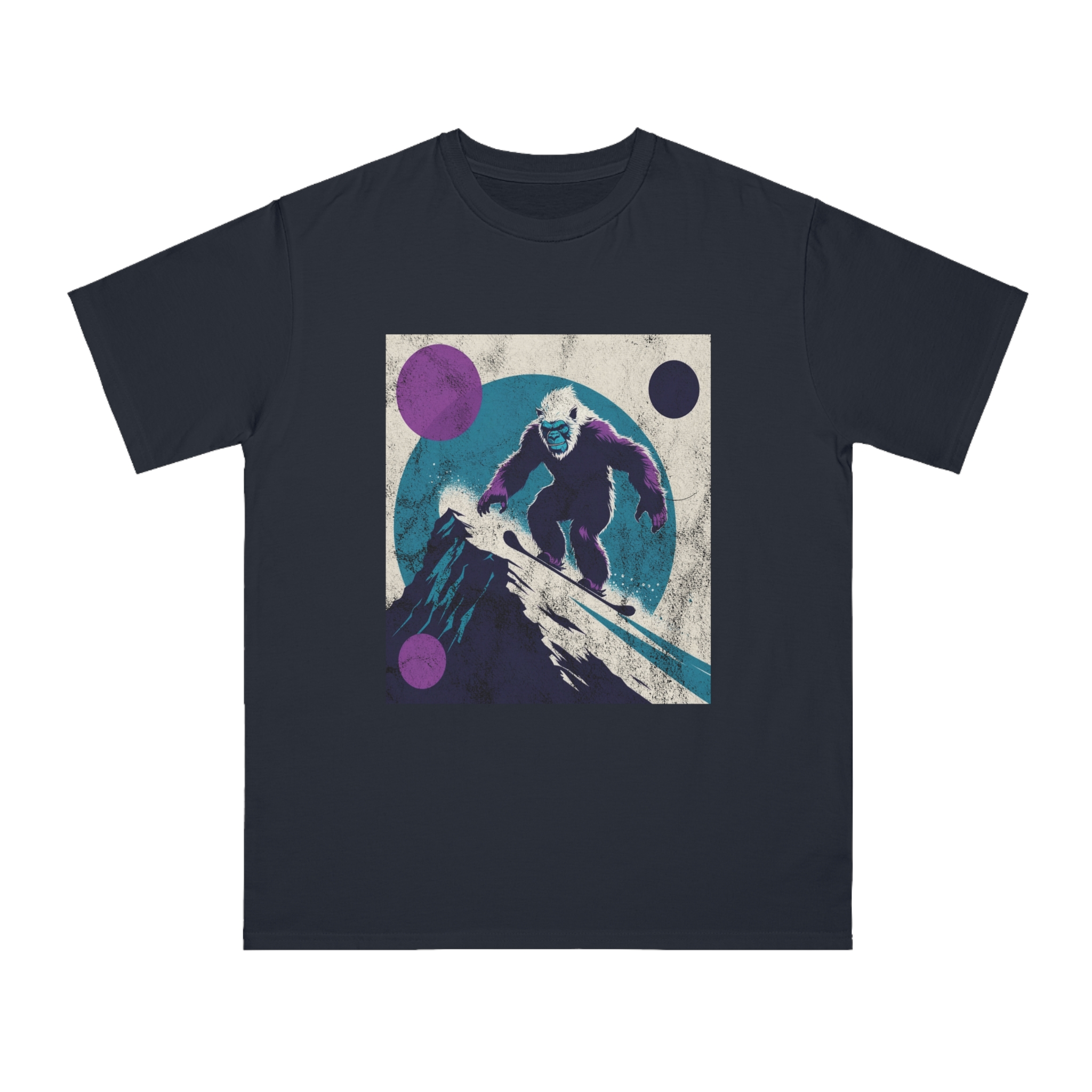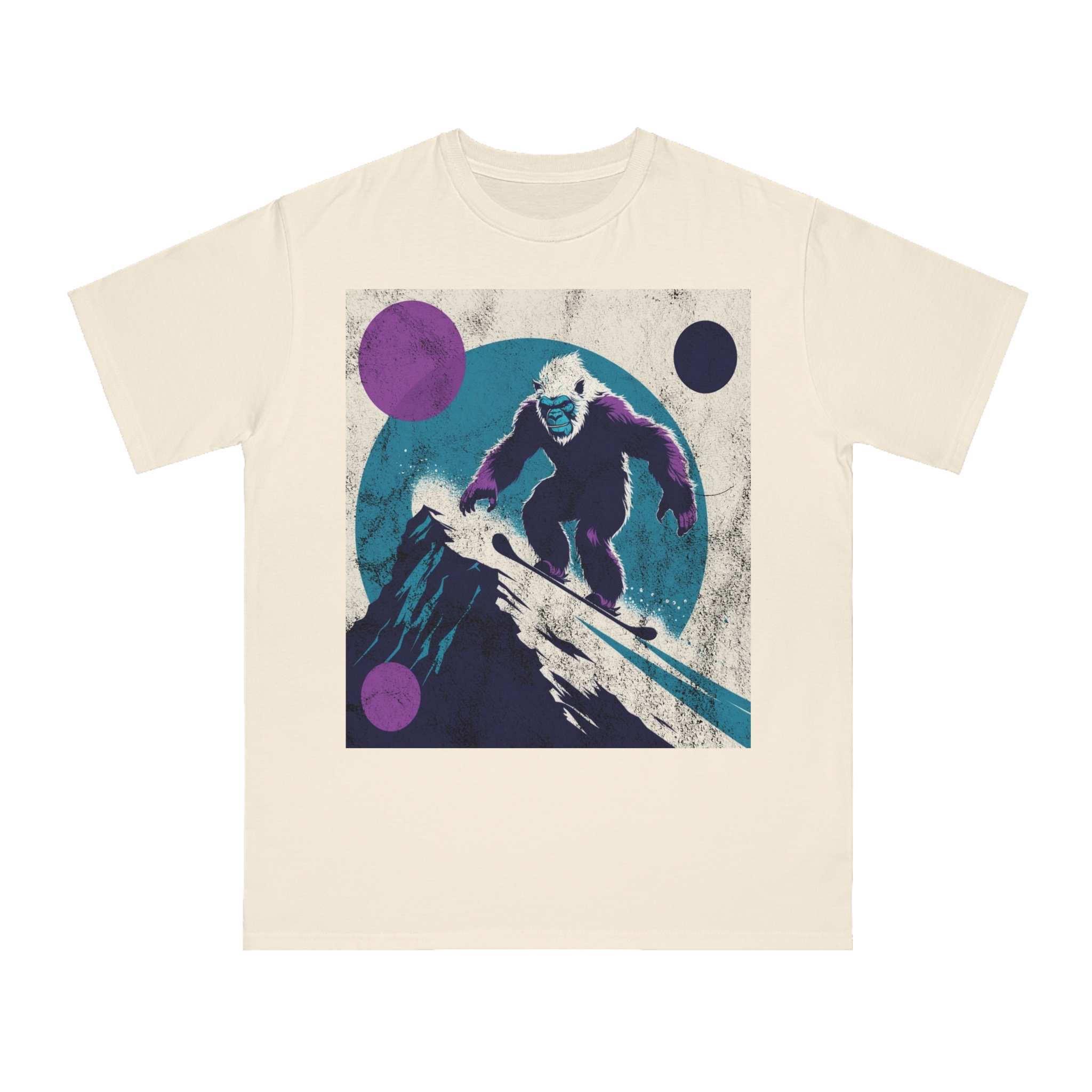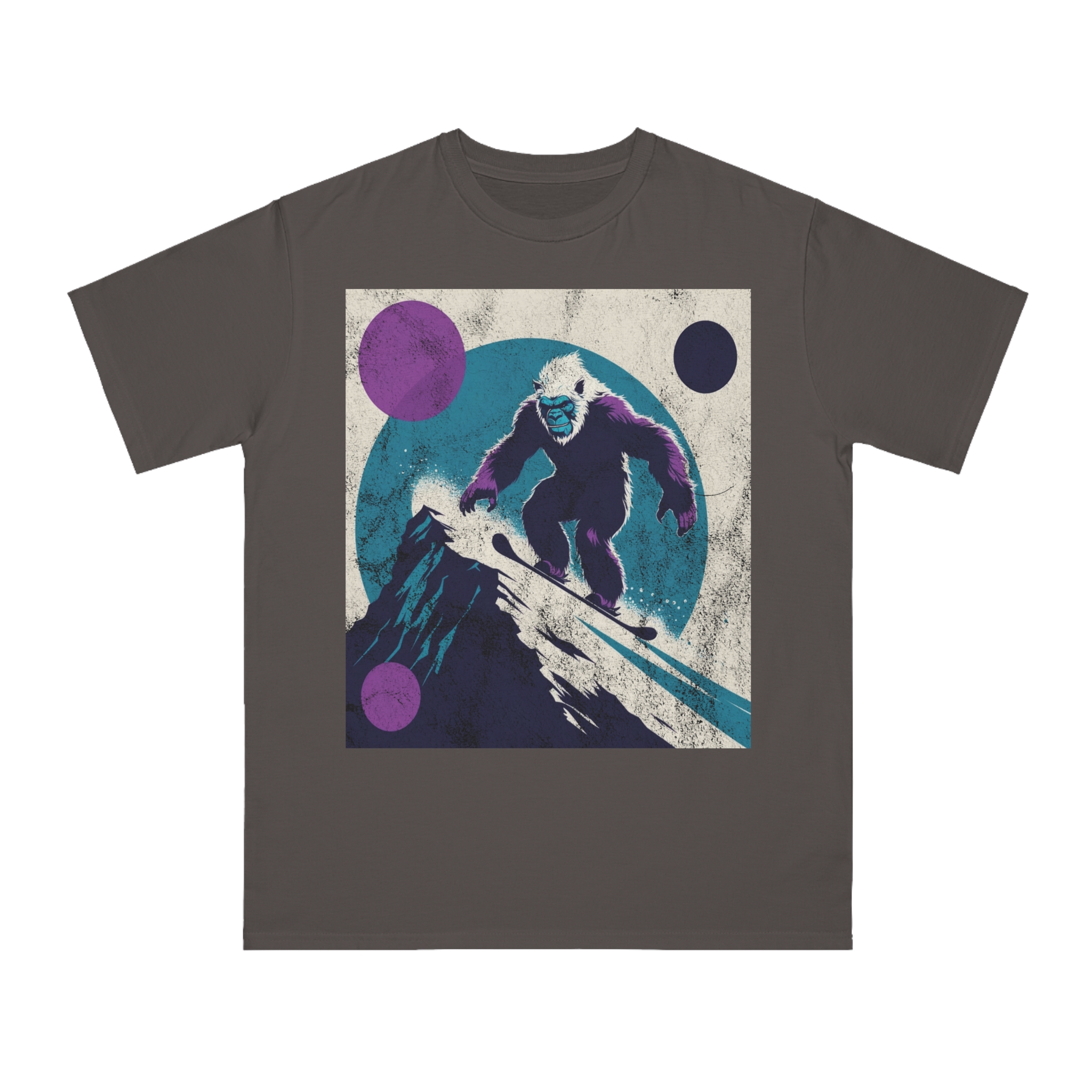 This vibrant graphic art illustration depicts a stylized yeti or abominable snowman skiing down a steep mountain slope. The creature is rendered in shades of purple and dark blue, set against a teal blue circular background with textured, grainy overlay. Geometric purple circles are strategically placed around the image, creating a dynamic compositional balance. The ski slopes appear angular and sharp, adding a sense of speed and movement to the artwork. The illustration employs a bold, graphic design style with a retro-modern aesthetic, utilizing a limited color palette and rough, textured effects that give the image a striking visual impact.