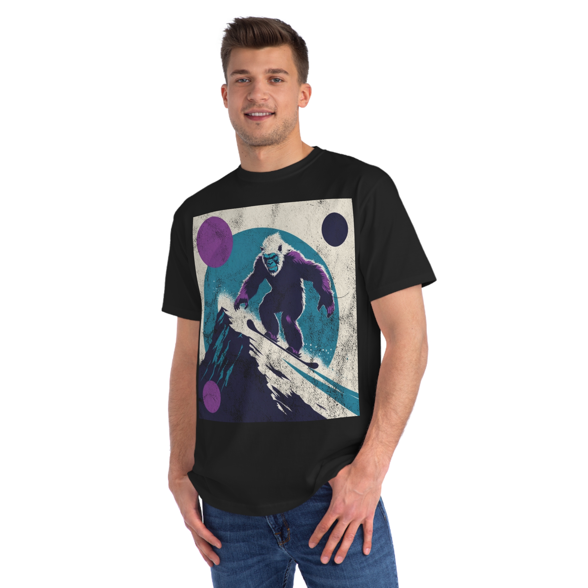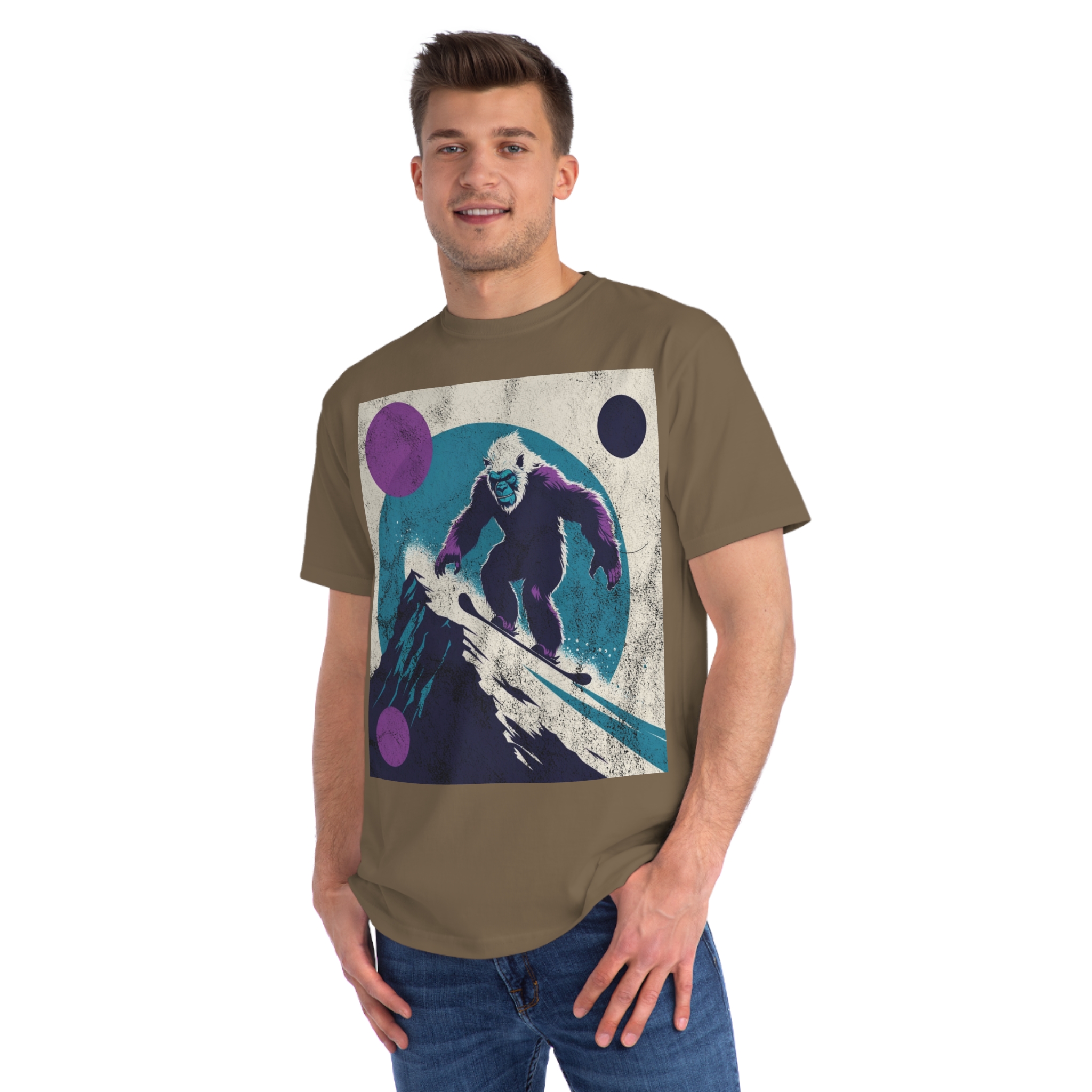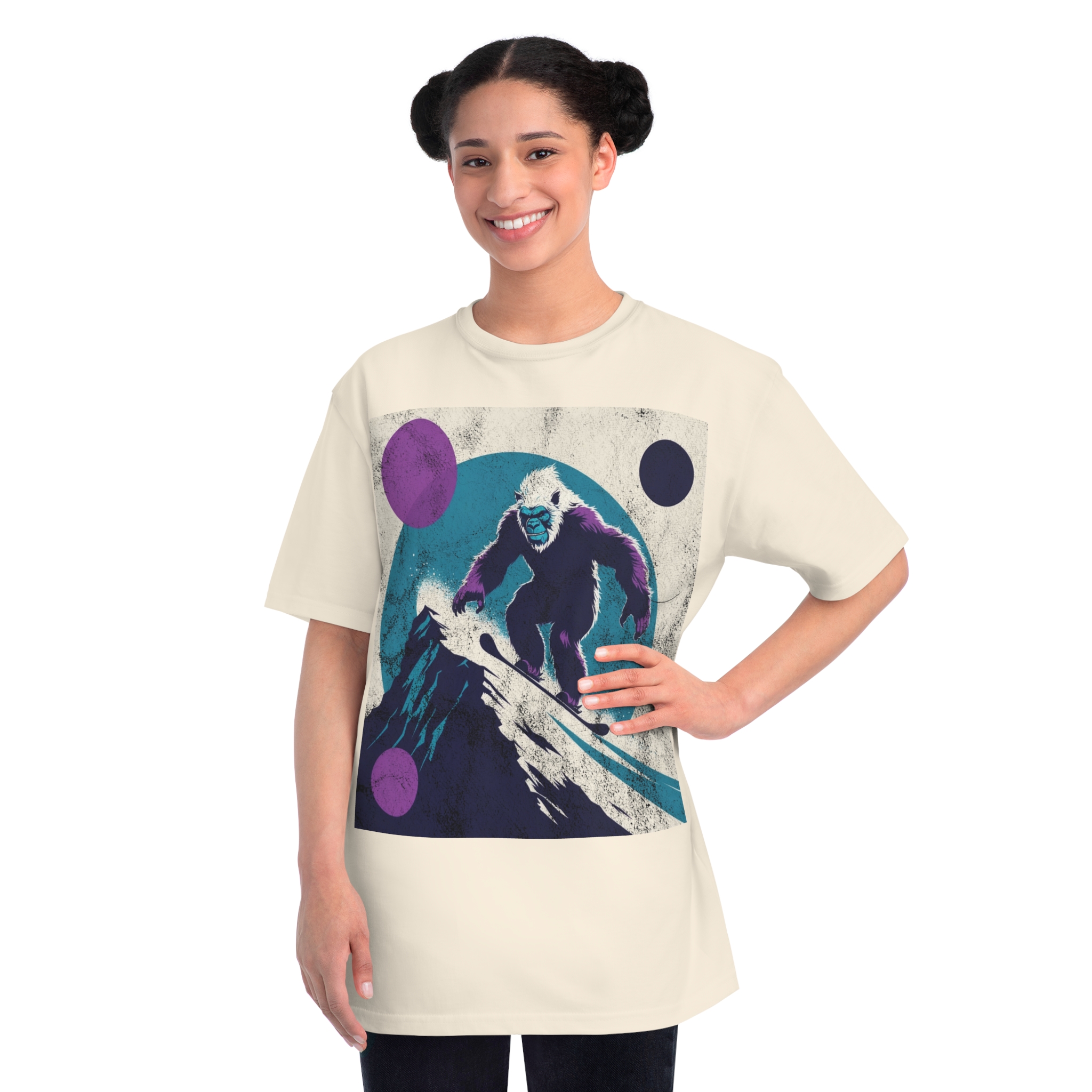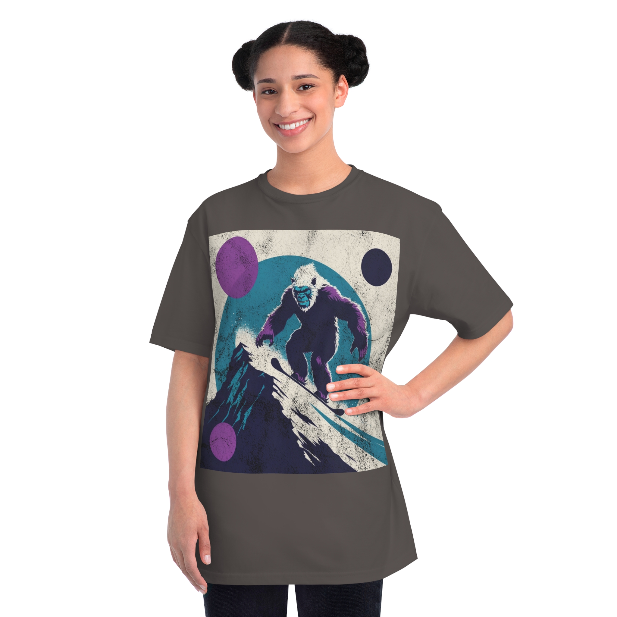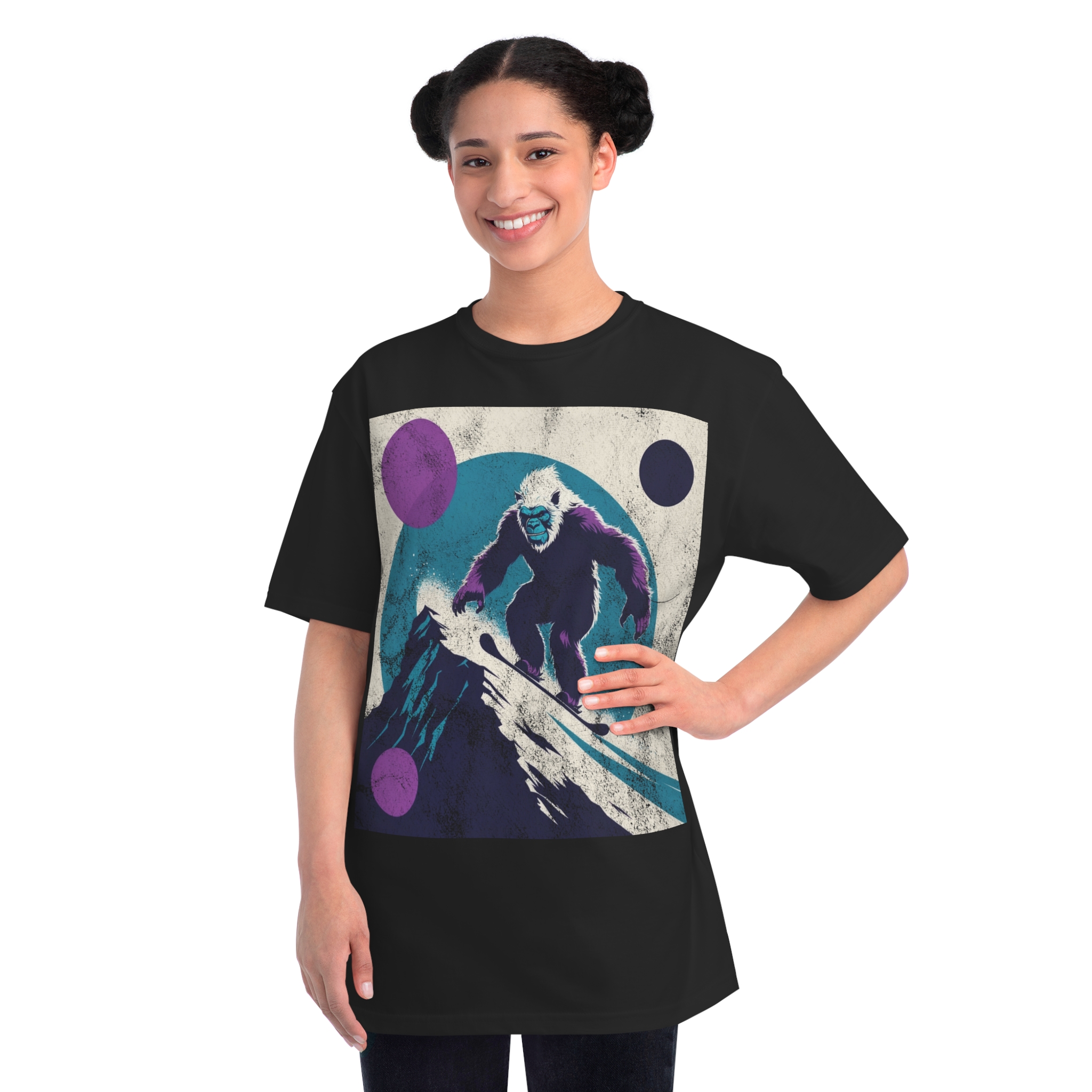 This vibrant graphic art illustration depicts a stylized yeti or abominable snowman skiing down a steep mountain slope. The creature is rendered in shades of purple and dark blue, set against a teal blue circular background with textured, grainy overlay. Geometric purple circles are strategically placed around the image, creating a dynamic compositional balance. The ski slopes appear angular and sharp, adding a sense of speed and movement to the artwork. The illustration employs a bold, graphic design style with a retro-modern aesthetic, utilizing a limited color palette and rough, textured effects that give the image a striking visual impact.