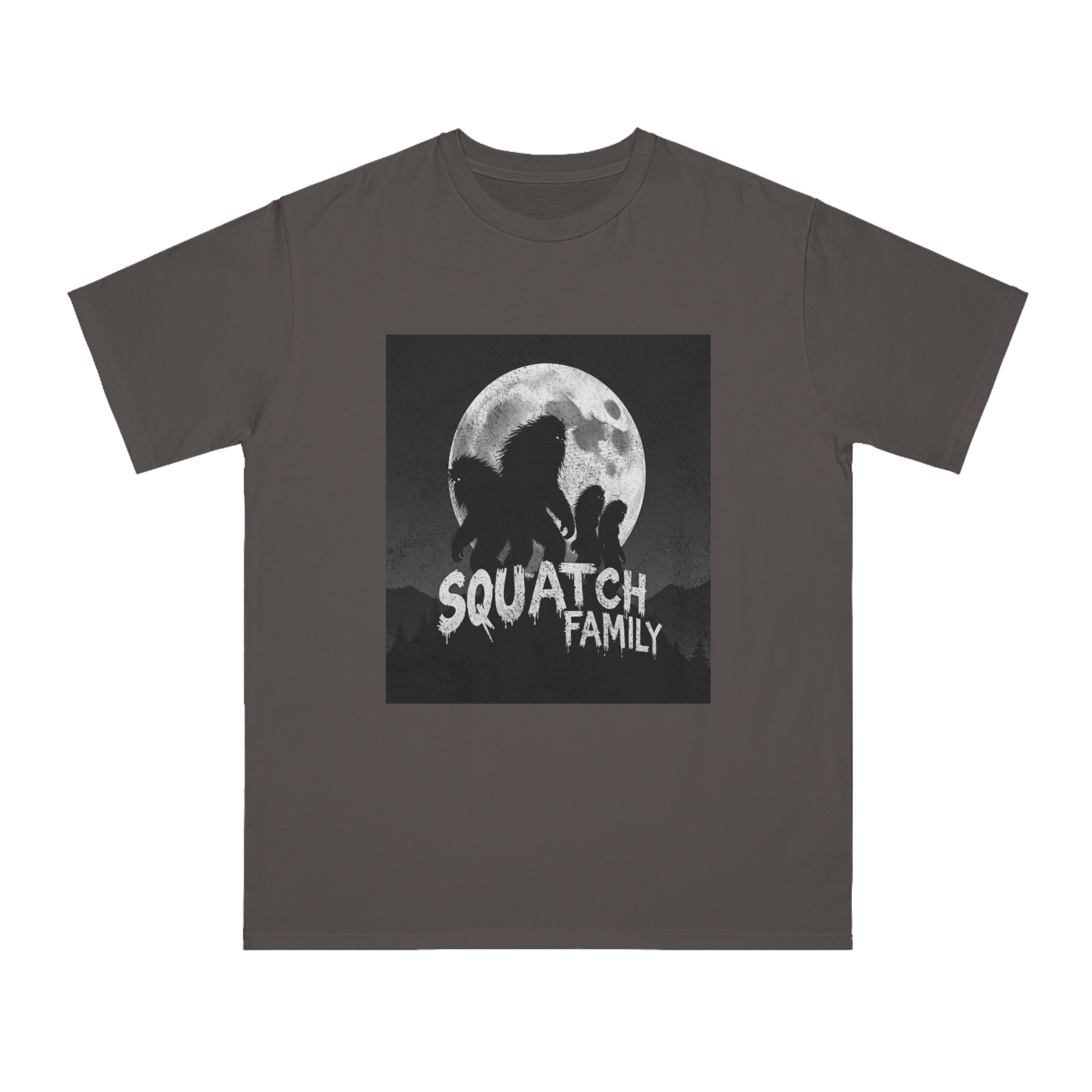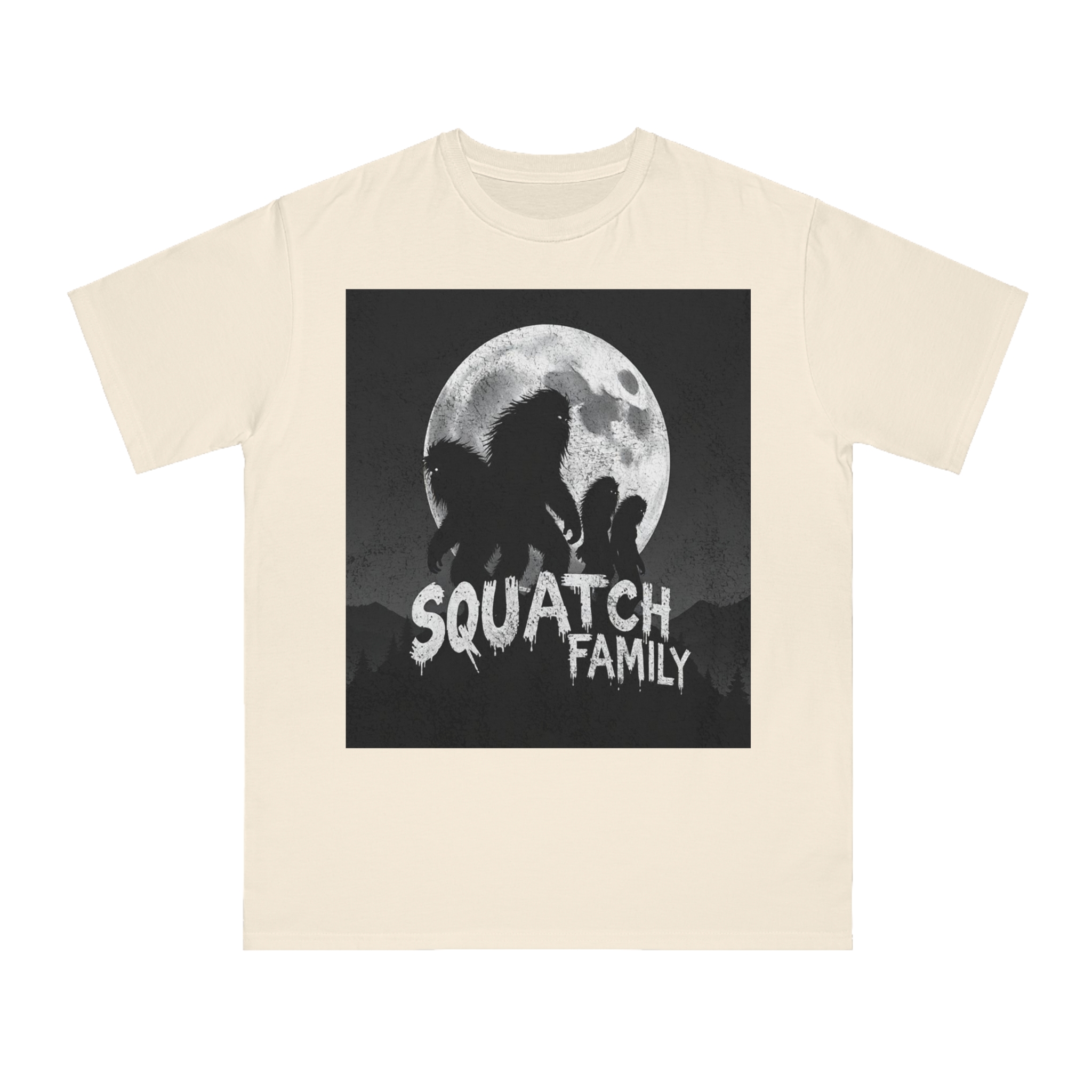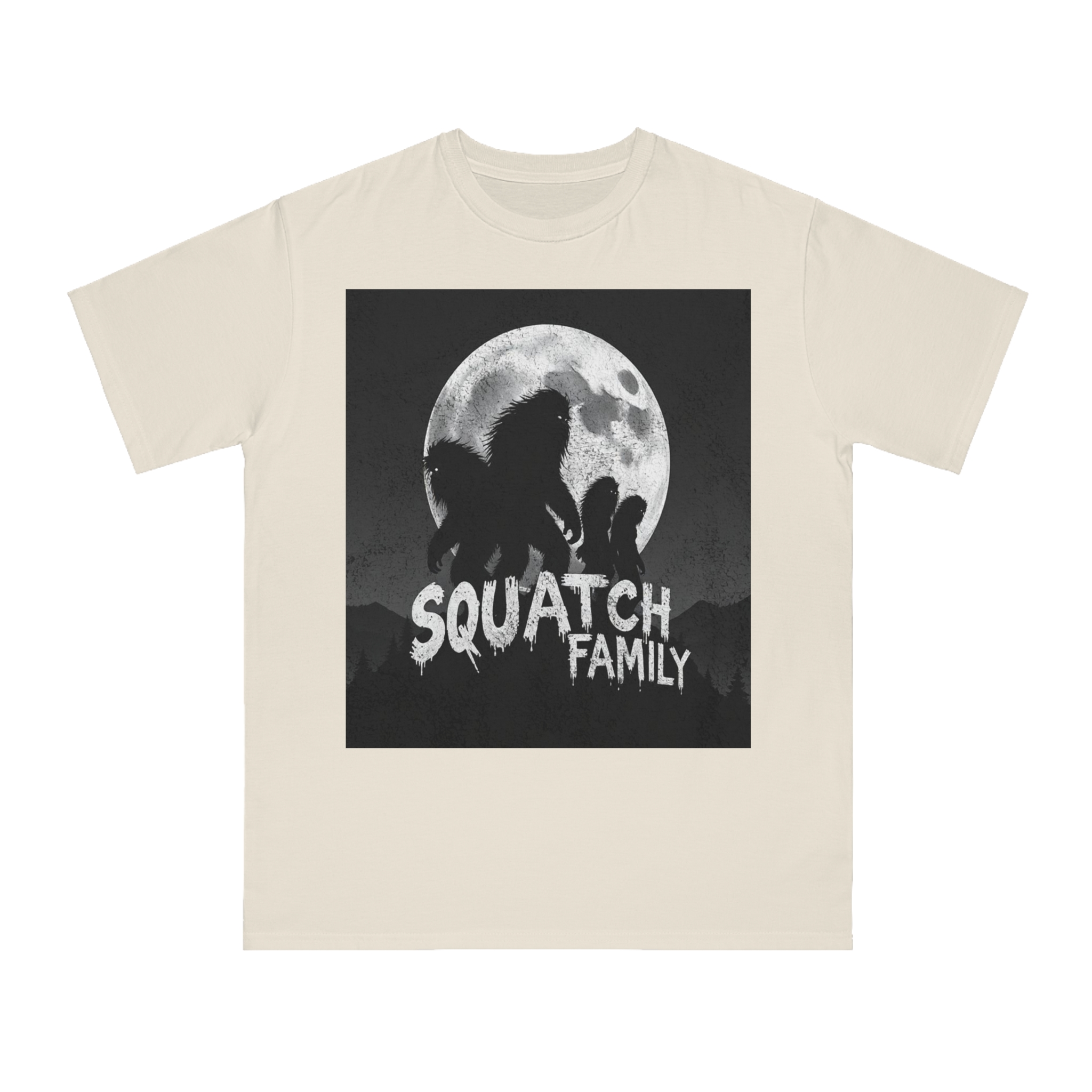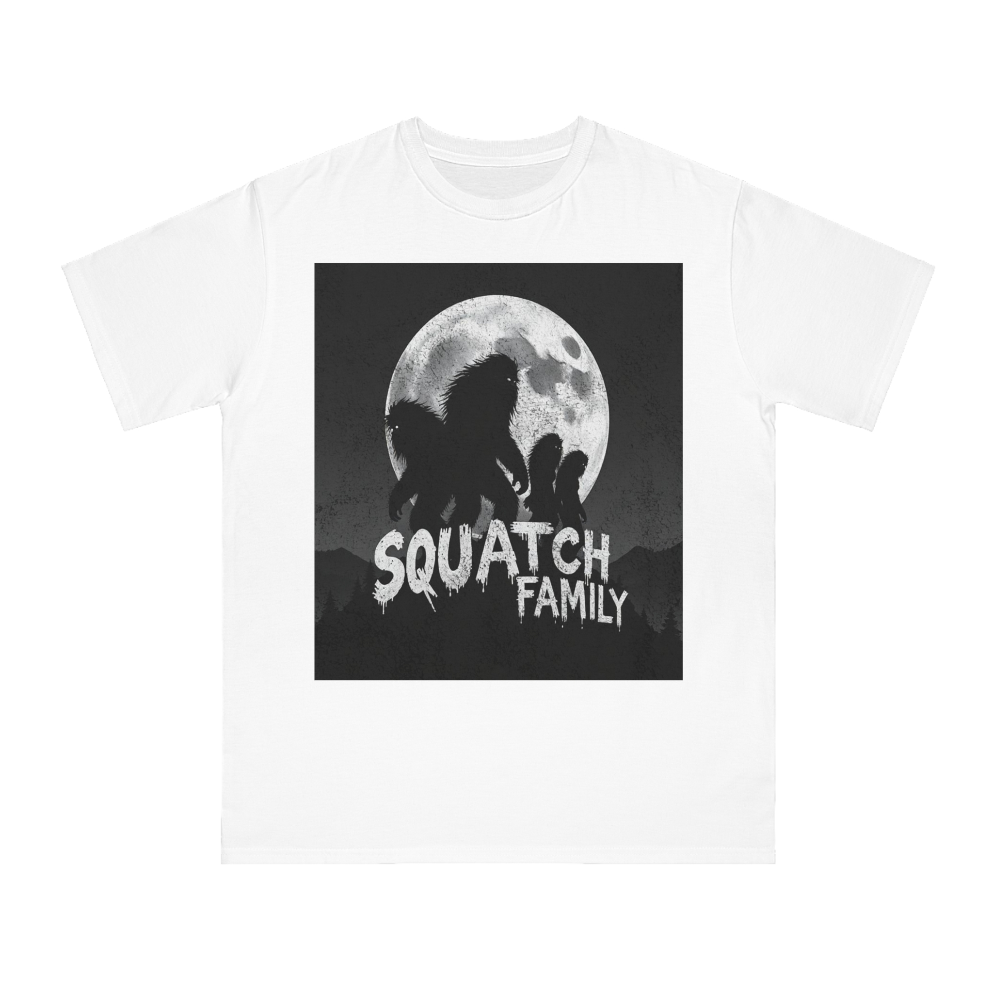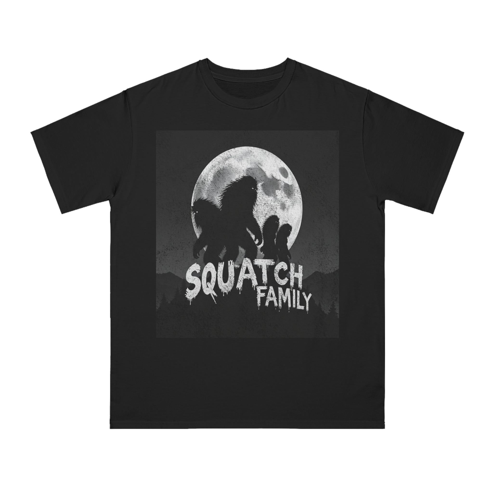 This striking black and white graphic depicts a group of Sasquatch-like creatures silhouetted against a large, textured full moon. The image features four furry, humanoid figures of varying sizes, suggesting a family unit, positioned against a dark, mountainous forest backdrop. The text “SQUATCH FAMILY” appears in bold, dripping letters at the bottom of the composition, reinforcing the Bigfoot theme. The artwork has a gritty, vintage poster-like quality with a textured background that adds depth and atmosphere to the design. The glowing eyes of the creatures and the dramatic moonlit scene create an eerie, mysterious mood that captures the legendary folklore surrounding Bigfoot.