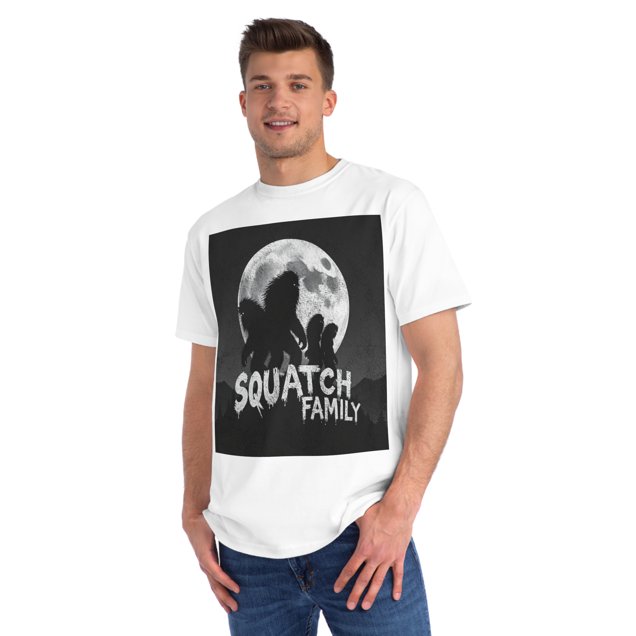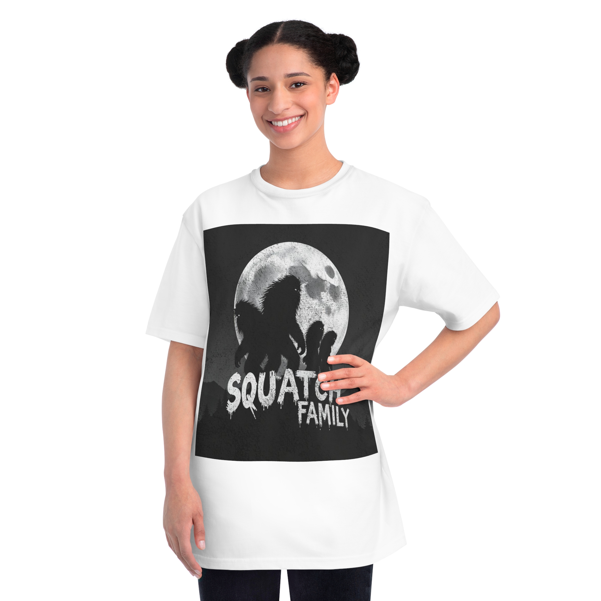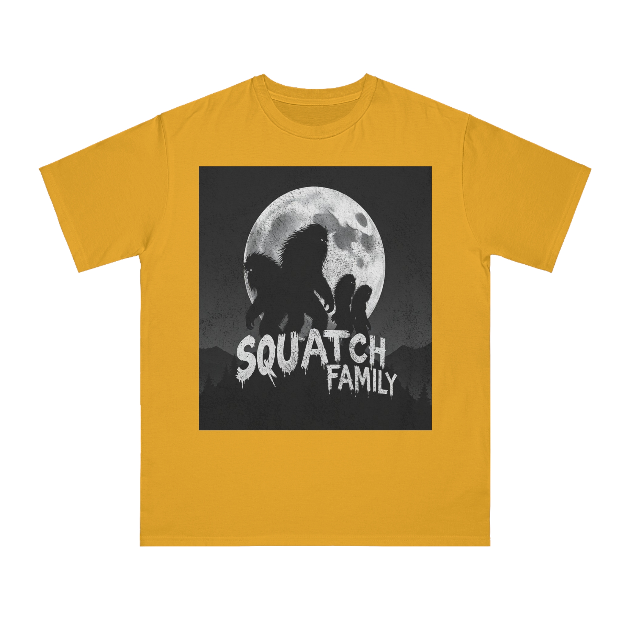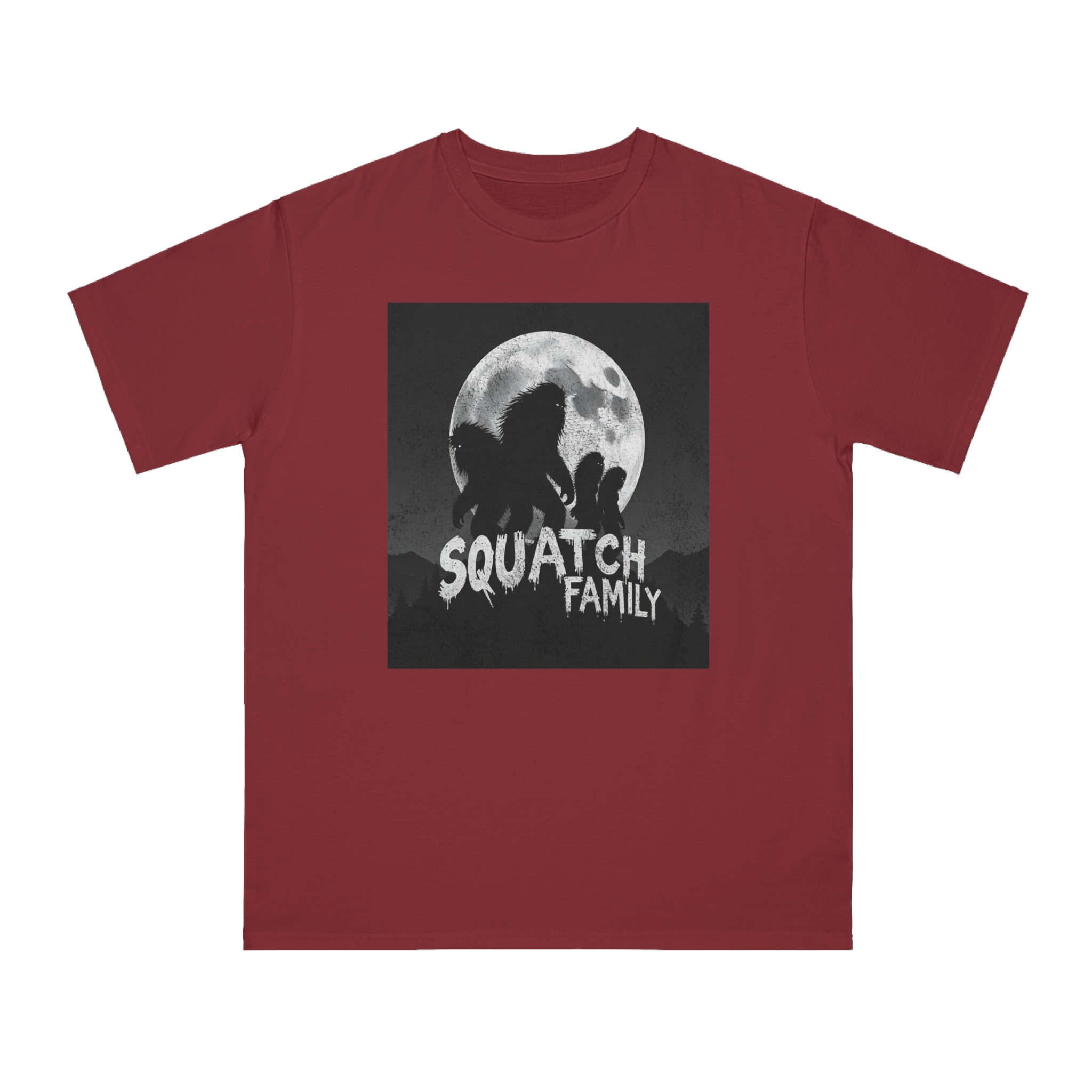 This striking black and white graphic depicts a group of Sasquatch-like creatures silhouetted against a large, textured full moon. The image features four furry, humanoid figures of varying sizes, suggesting a family unit, positioned against a dark, mountainous forest backdrop. The text “SQUATCH FAMILY” appears in bold, dripping letters at the bottom of the composition, reinforcing the Bigfoot theme. The artwork has a gritty, vintage poster-like quality with a textured background that adds depth and atmosphere to the design. The glowing eyes of the creatures and the dramatic moonlit scene create an eerie, mysterious mood that captures the legendary folklore surrounding Bigfoot.