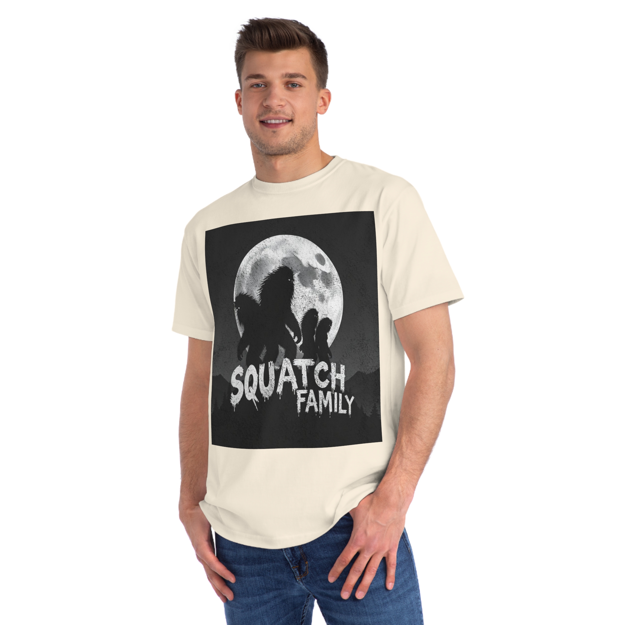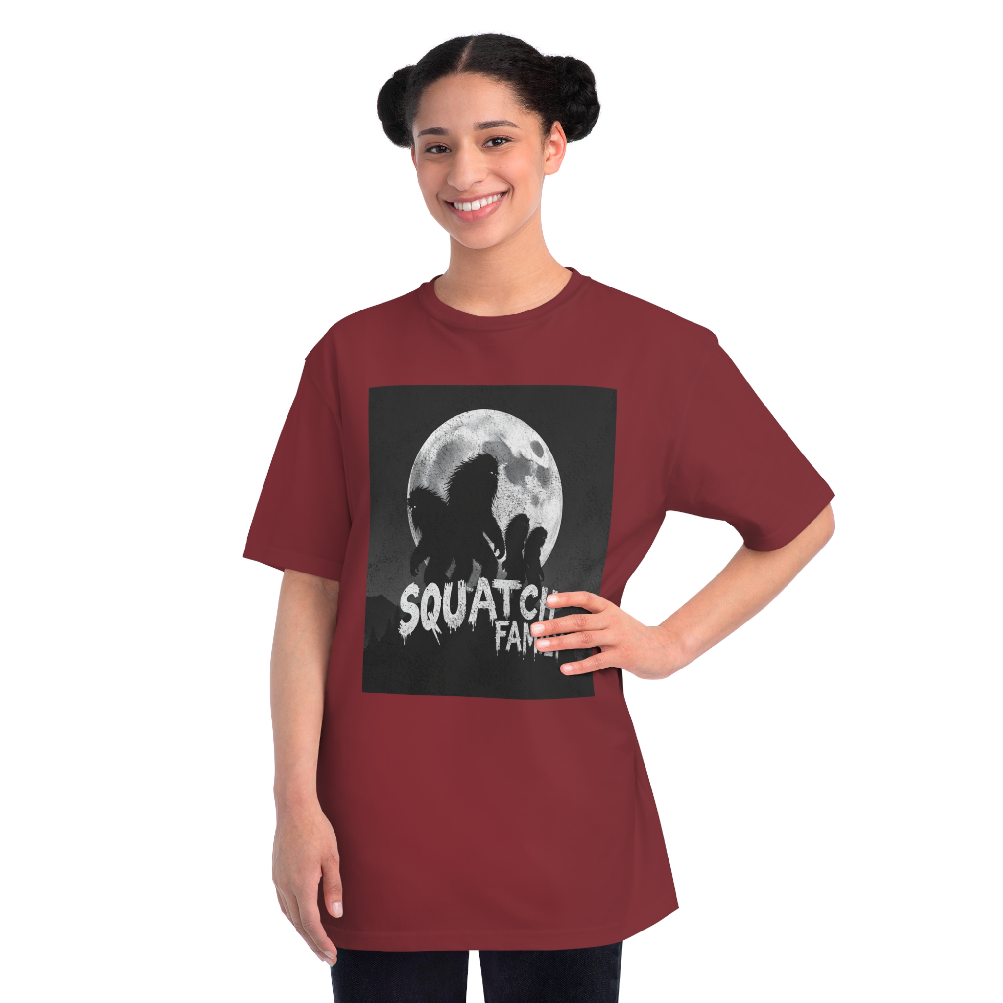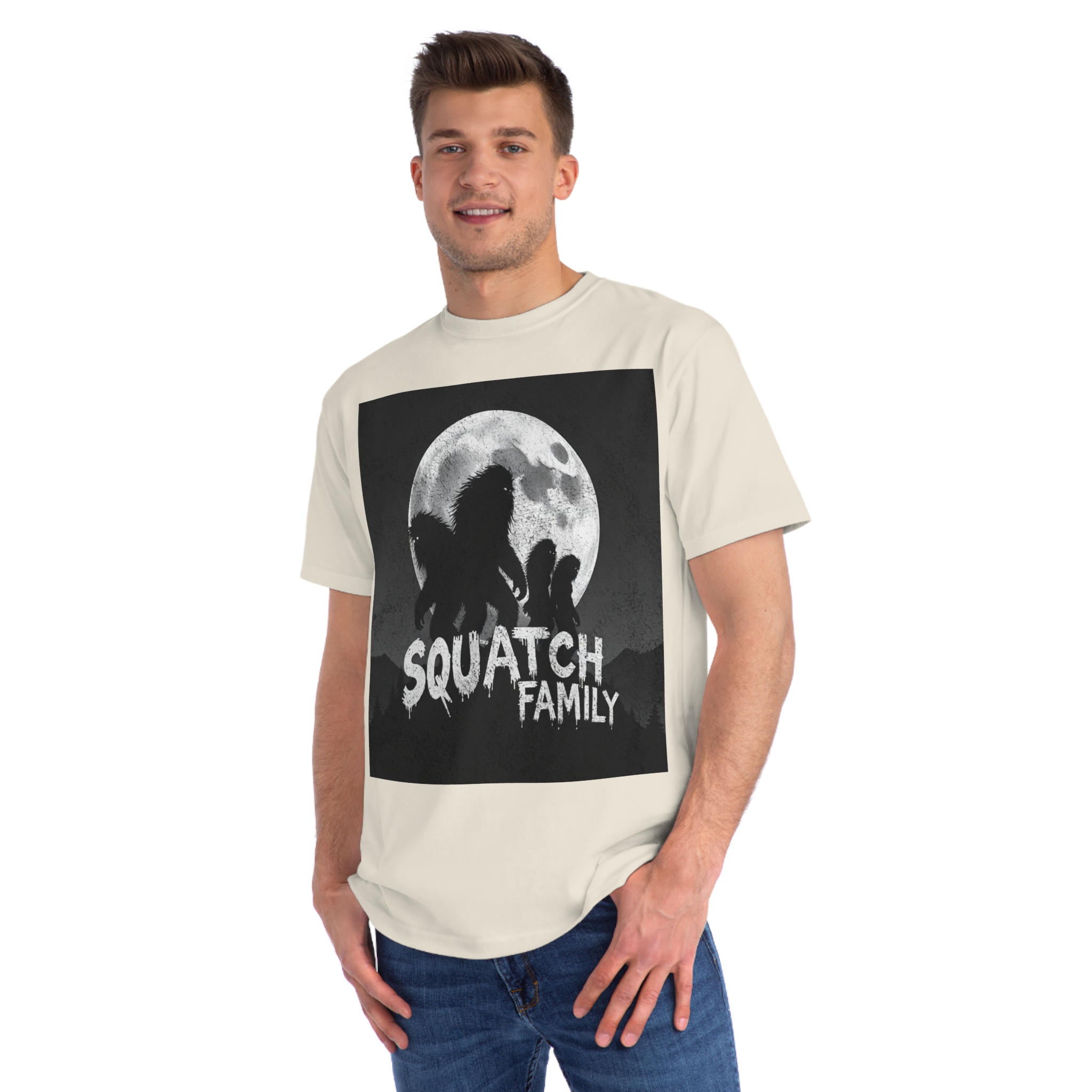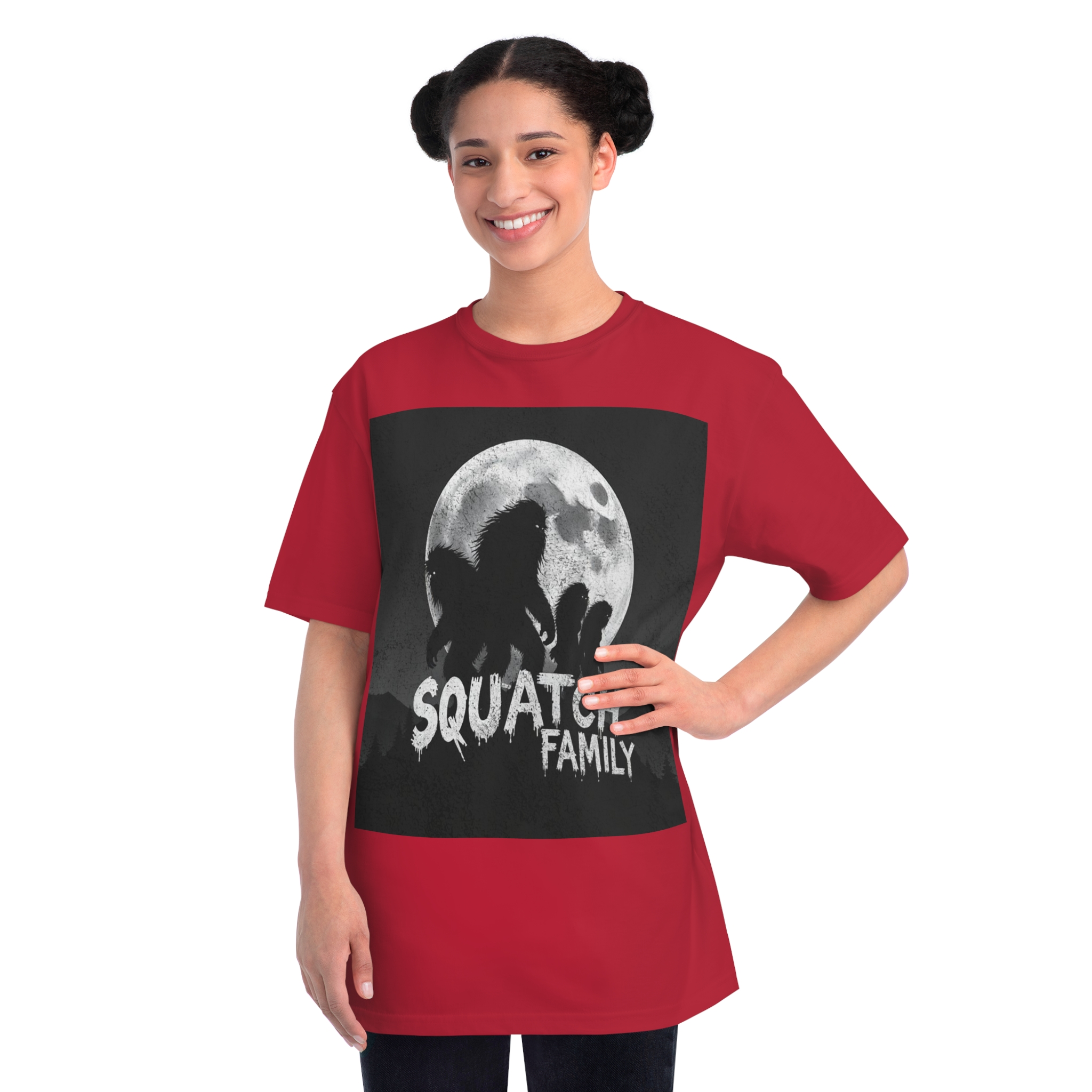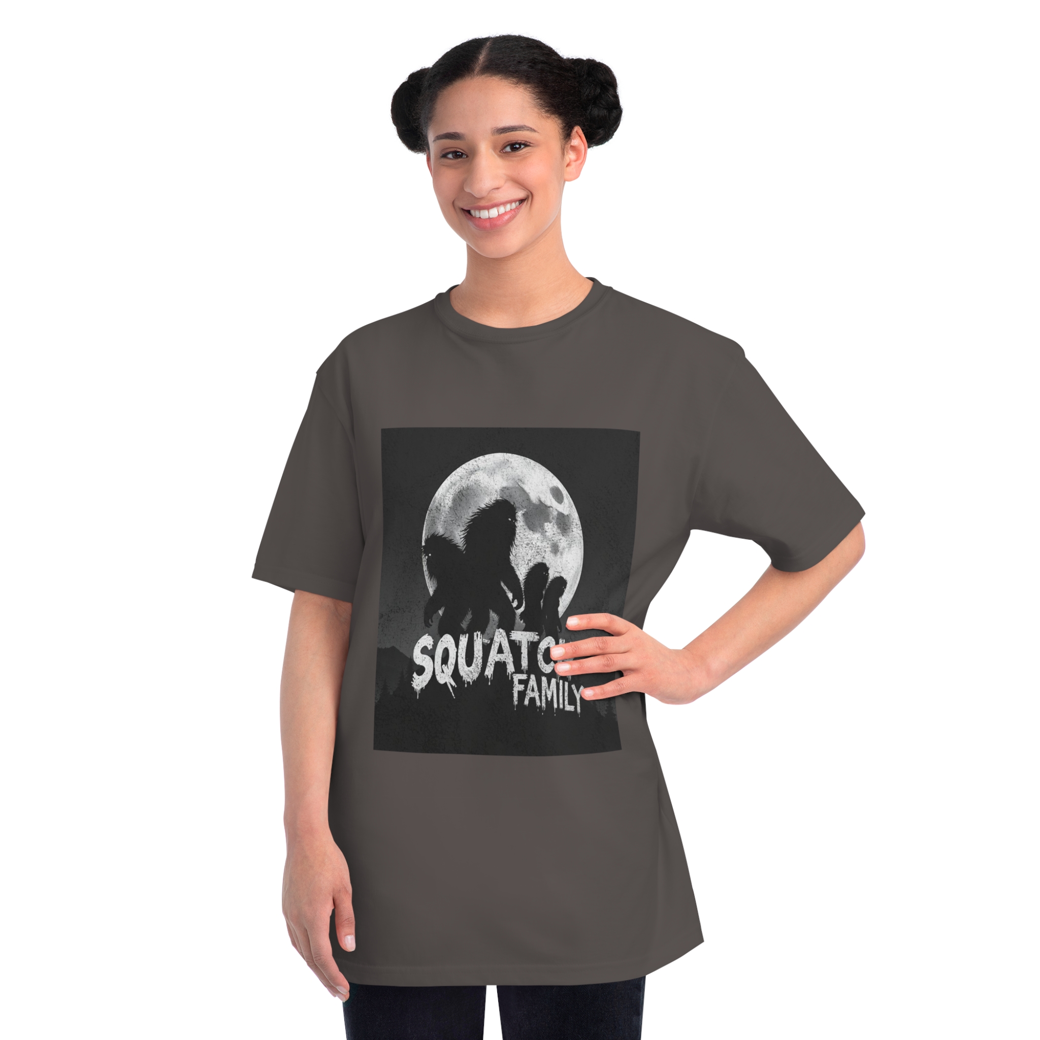 This striking black and white graphic depicts a group of Sasquatch-like creatures silhouetted against a large, textured full moon. The image features four furry, humanoid figures of varying sizes, suggesting a family unit, positioned against a dark, mountainous forest backdrop. The text “SQUATCH FAMILY” appears in bold, dripping letters at the bottom of the composition, reinforcing the Bigfoot theme. The artwork has a gritty, vintage poster-like quality with a textured background that adds depth and atmosphere to the design. The glowing eyes of the creatures and the dramatic moonlit scene create an eerie, mysterious mood that captures the legendary folklore surrounding Bigfoot.