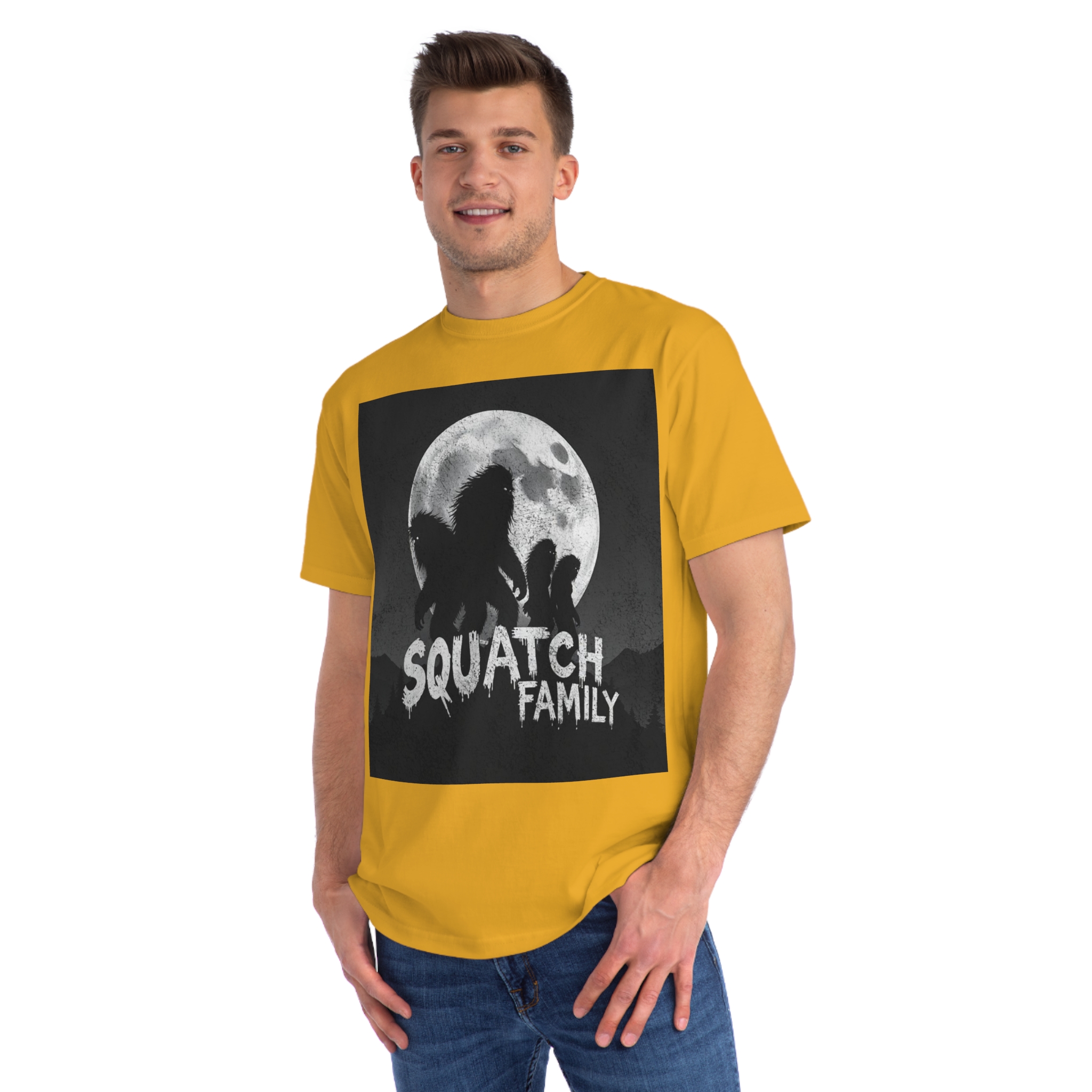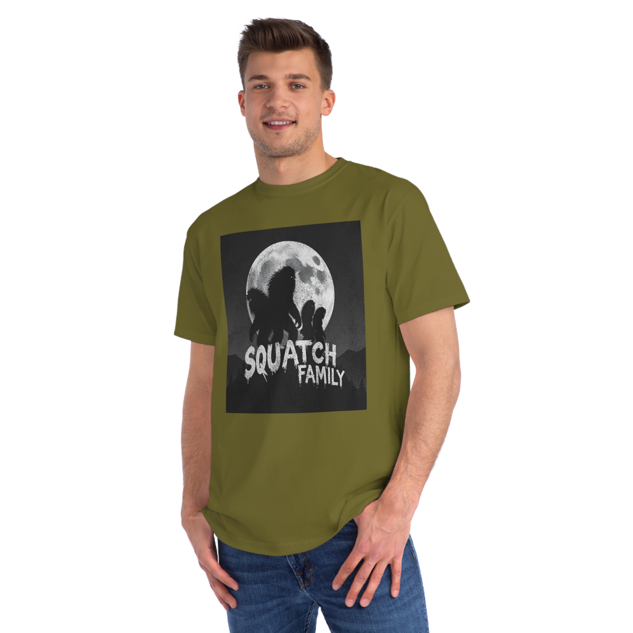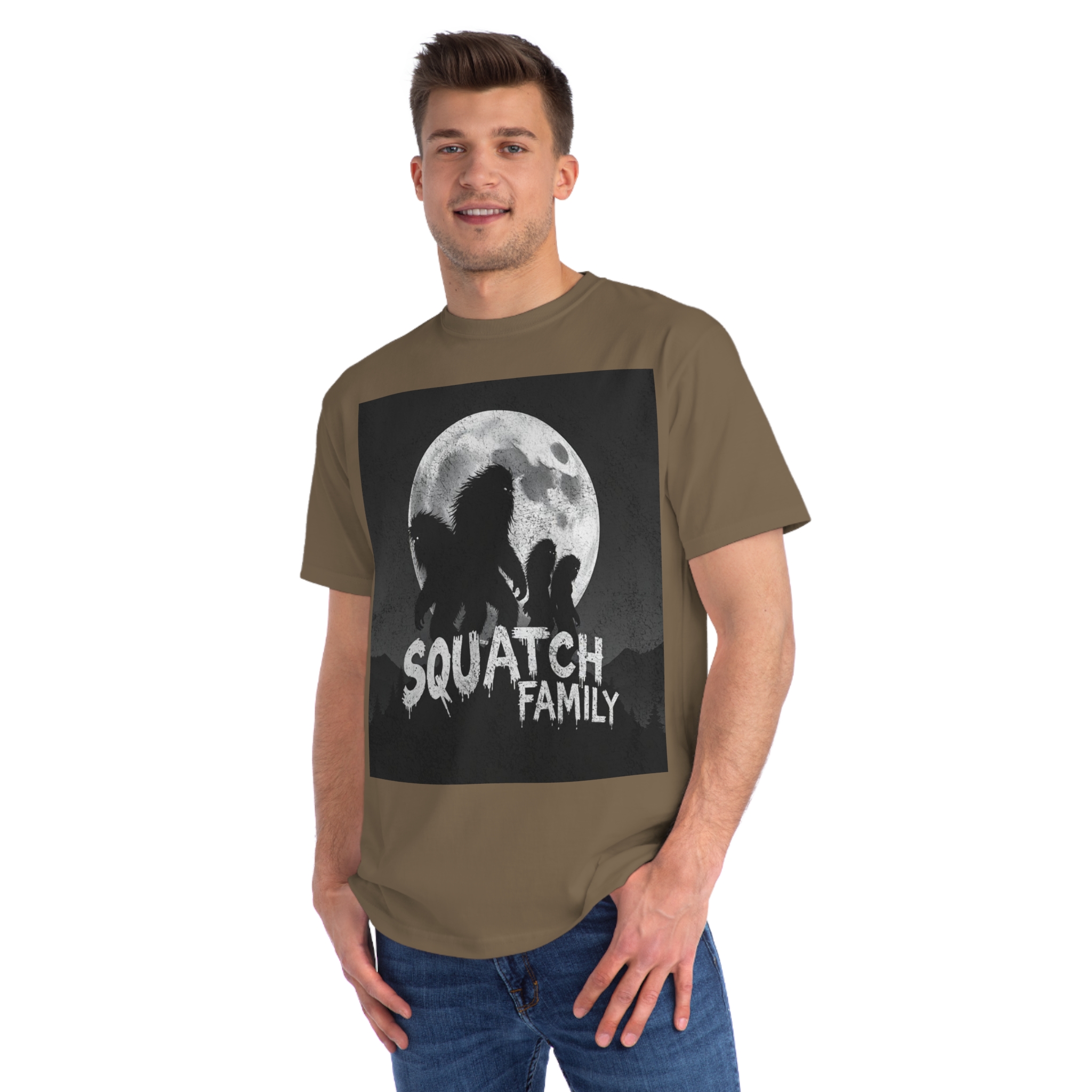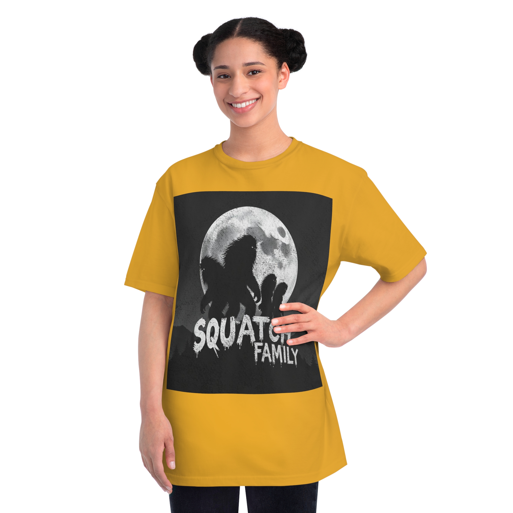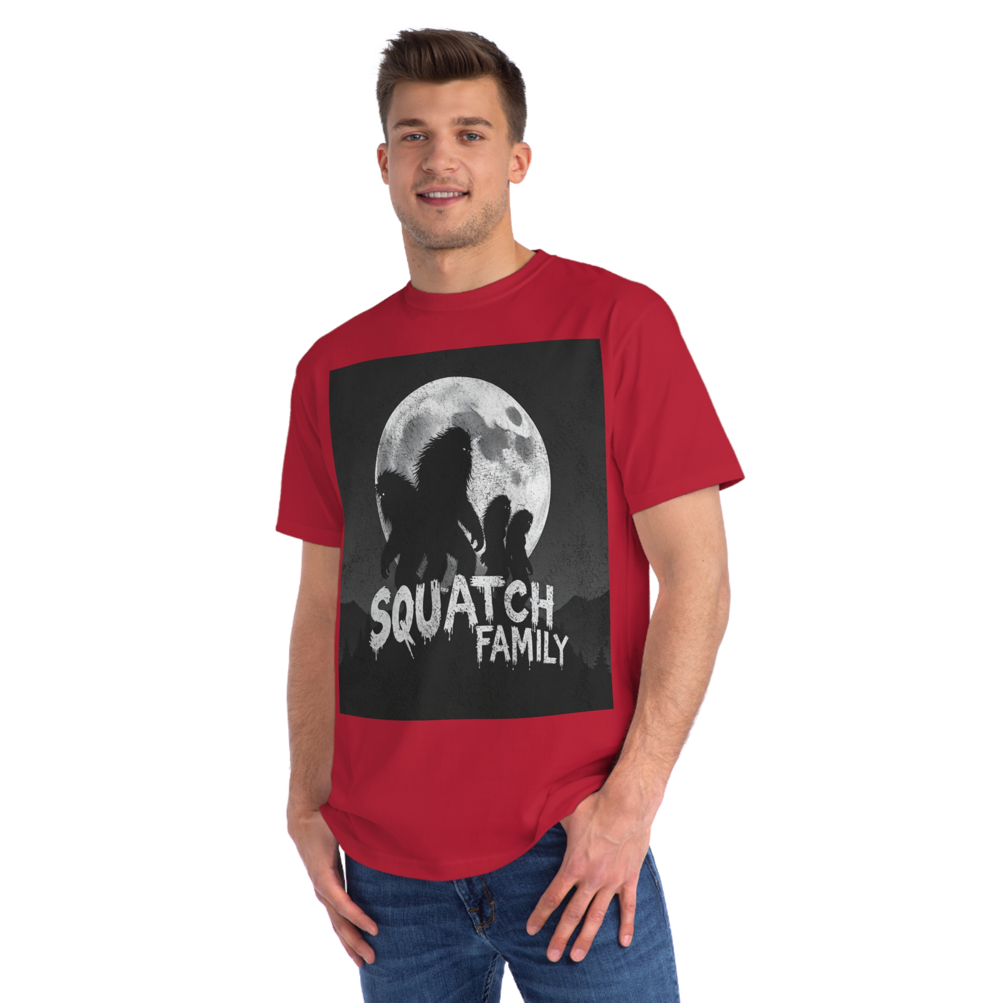 This striking black and white graphic depicts a group of Sasquatch-like creatures silhouetted against a large, textured full moon. The image features four furry, humanoid figures of varying sizes, suggesting a family unit, positioned against a dark, mountainous forest backdrop. The text “SQUATCH FAMILY” appears in bold, dripping letters at the bottom of the composition, reinforcing the Bigfoot theme. The artwork has a gritty, vintage poster-like quality with a textured background that adds depth and atmosphere to the design. The glowing eyes of the creatures and the dramatic moonlit scene create an eerie, mysterious mood that captures the legendary folklore surrounding Bigfoot.