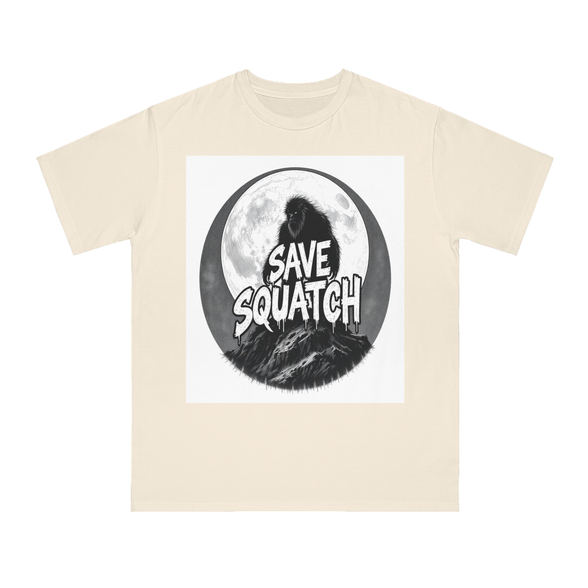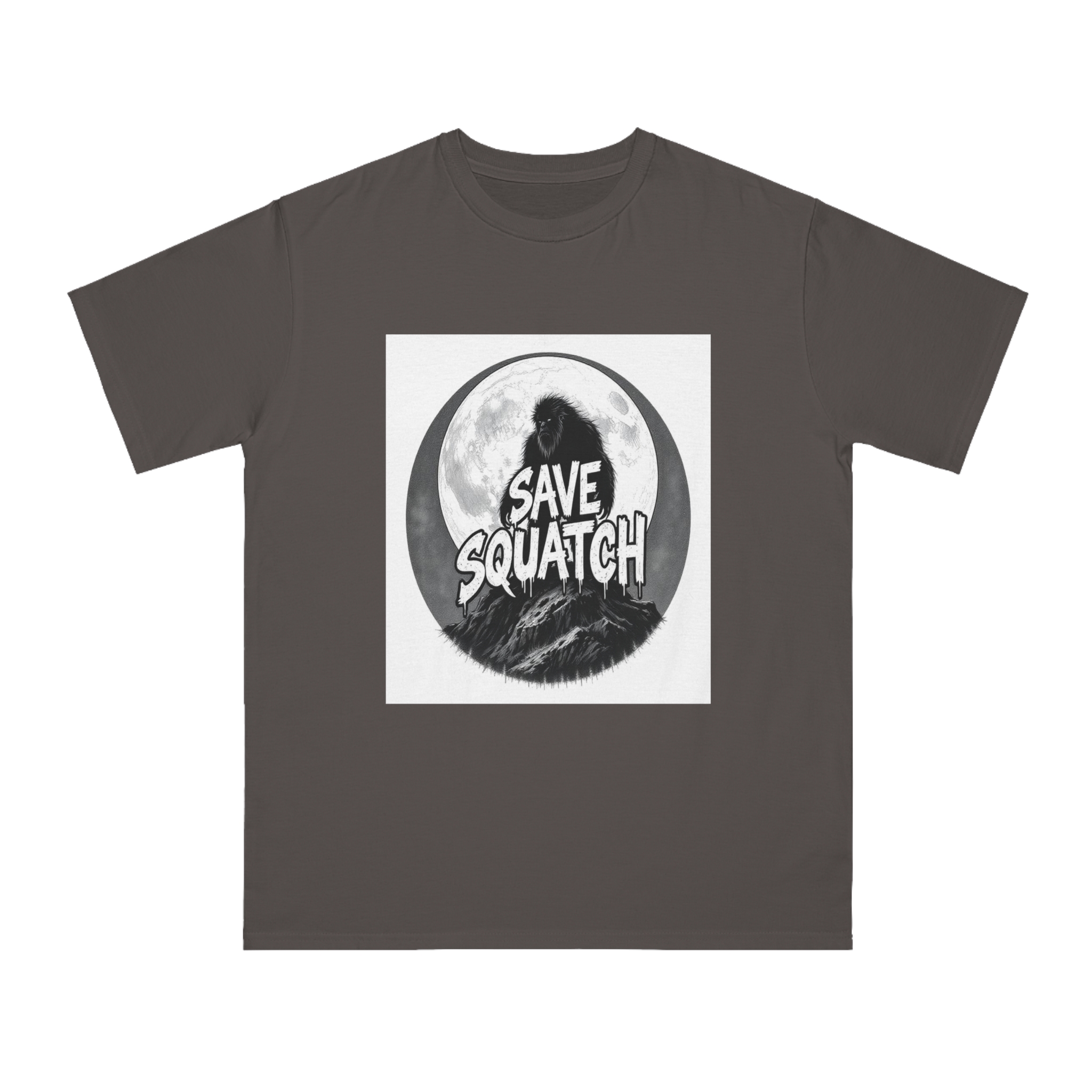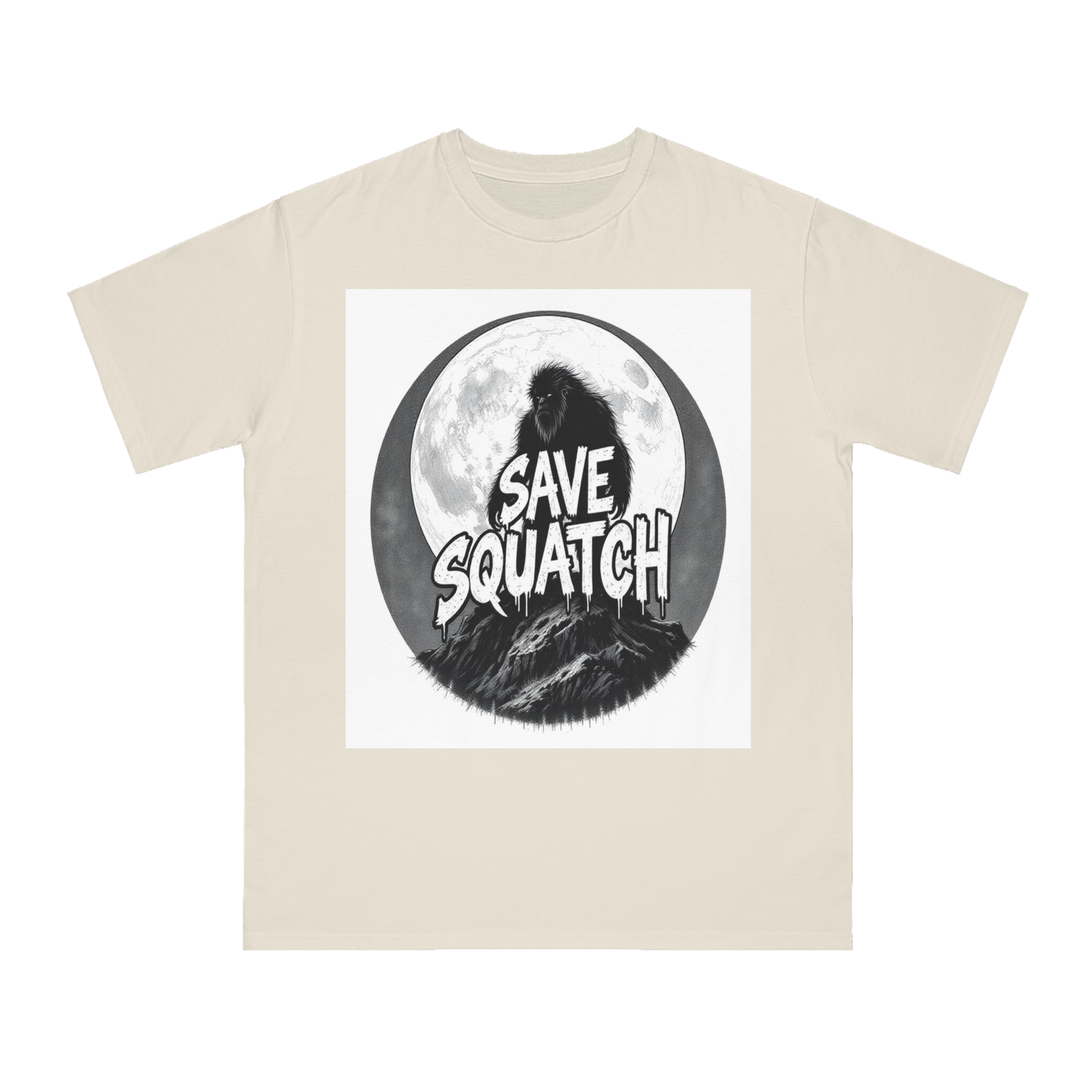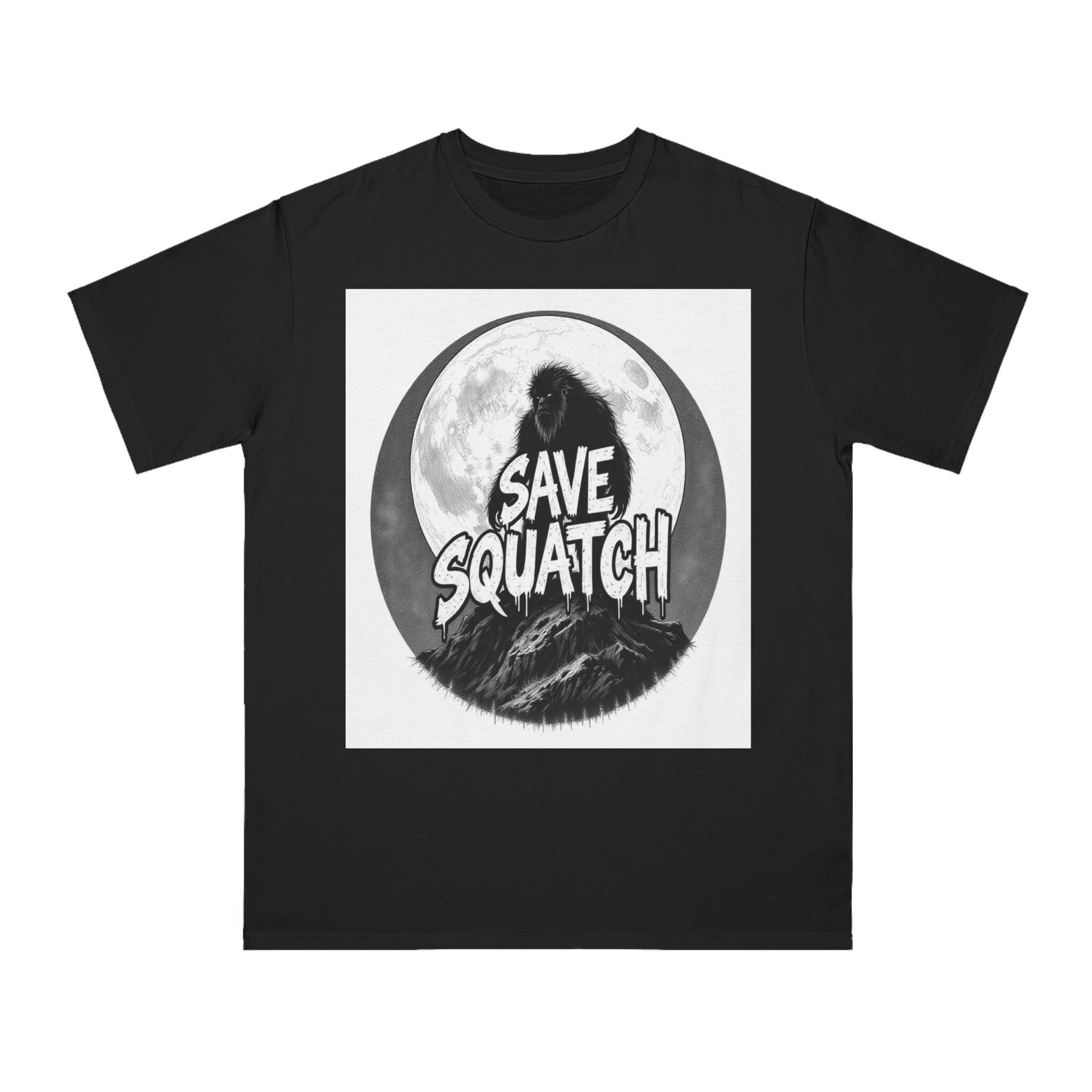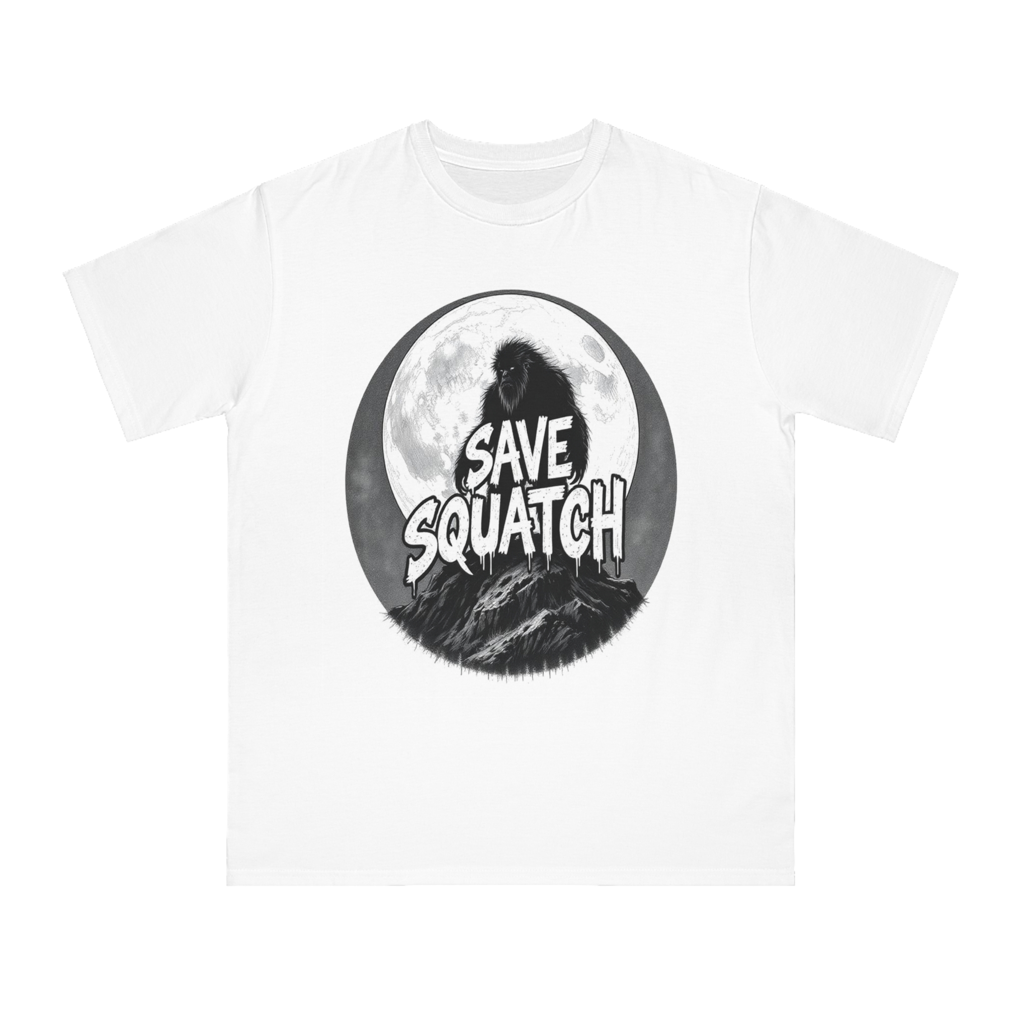 This black and white graphic design features a large, hairy cryptid silhouetted against a full moon, standing atop a rocky mountain landscape. The text “SAVE SQUATCH” is prominently displayed in bold, dripping letters across the center of the image, with the creature positioned behind and around the text. The artwork has a moody, high-contrast style with detailed shading and a circular composition that draws the eye to the central message. The Sasquatch or Bigfoot figure appears shaggy and imposing, embodying the mysterious and legendary nature of the creature. The image combines elements of folklore, conservation messaging, and graphic design to create a striking visual representation of the mythical forest-dwelling being.