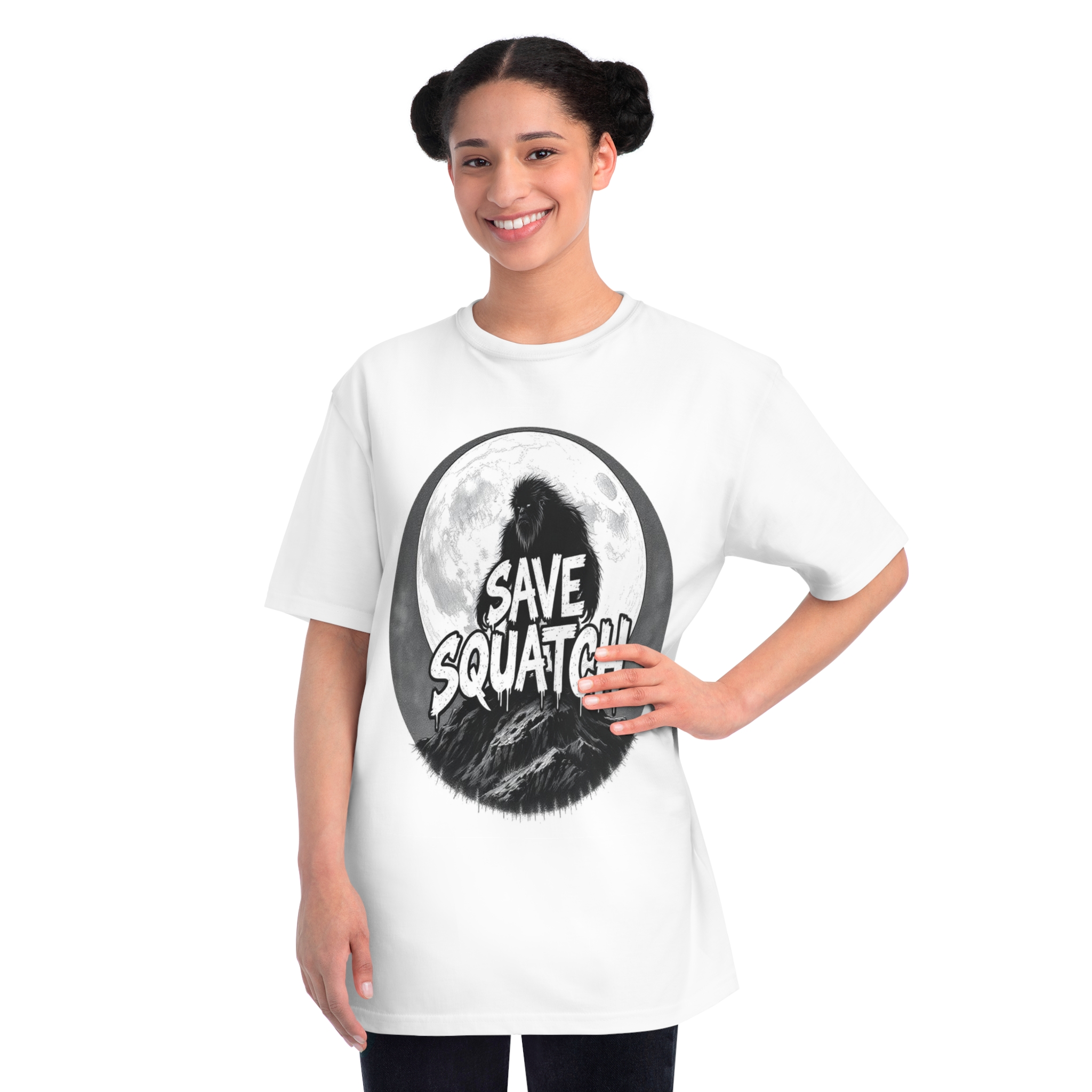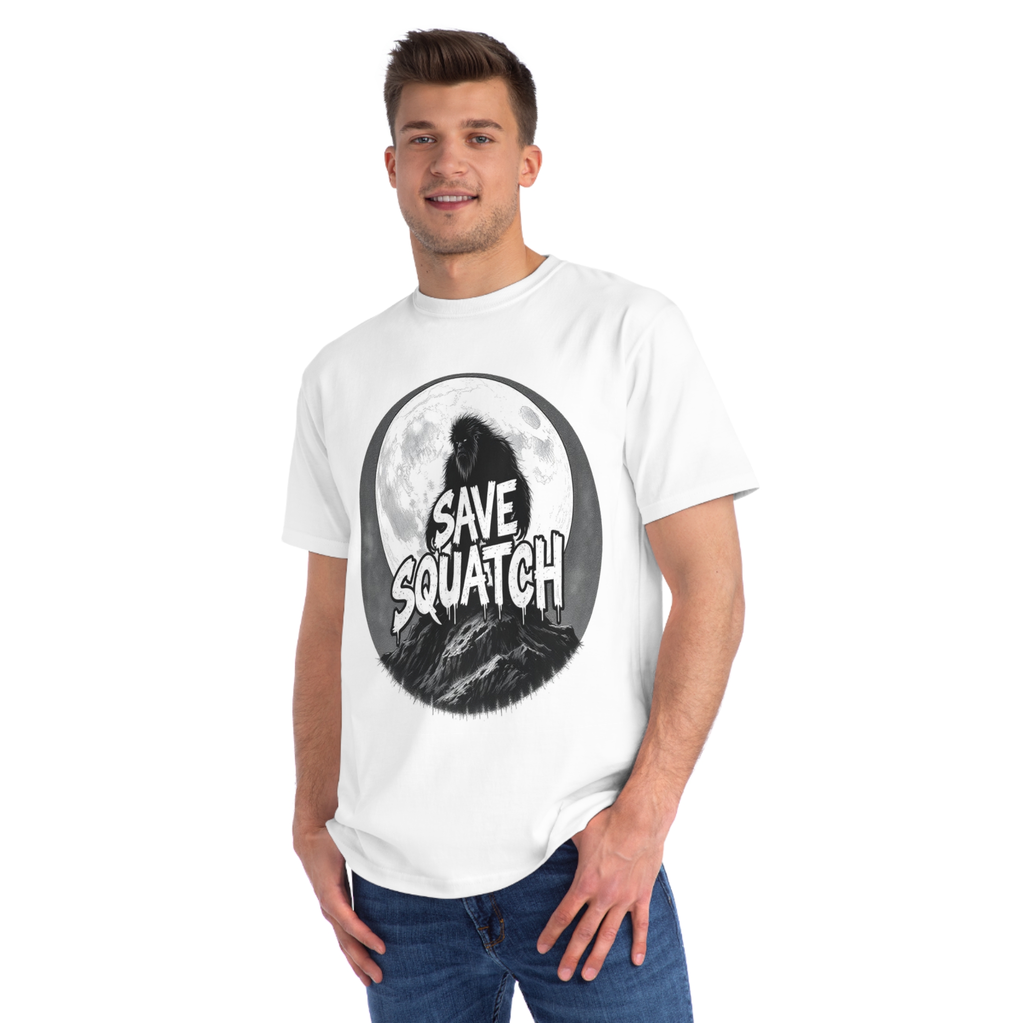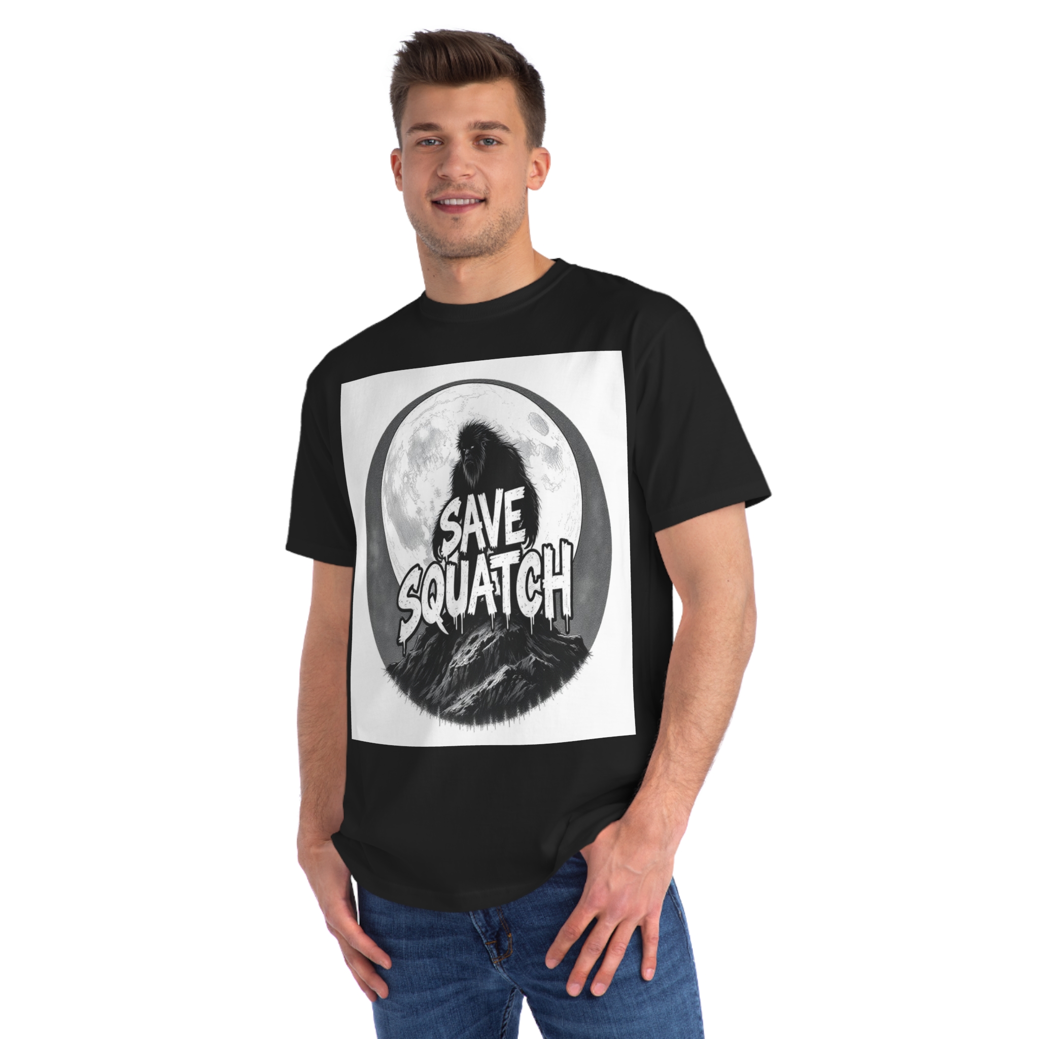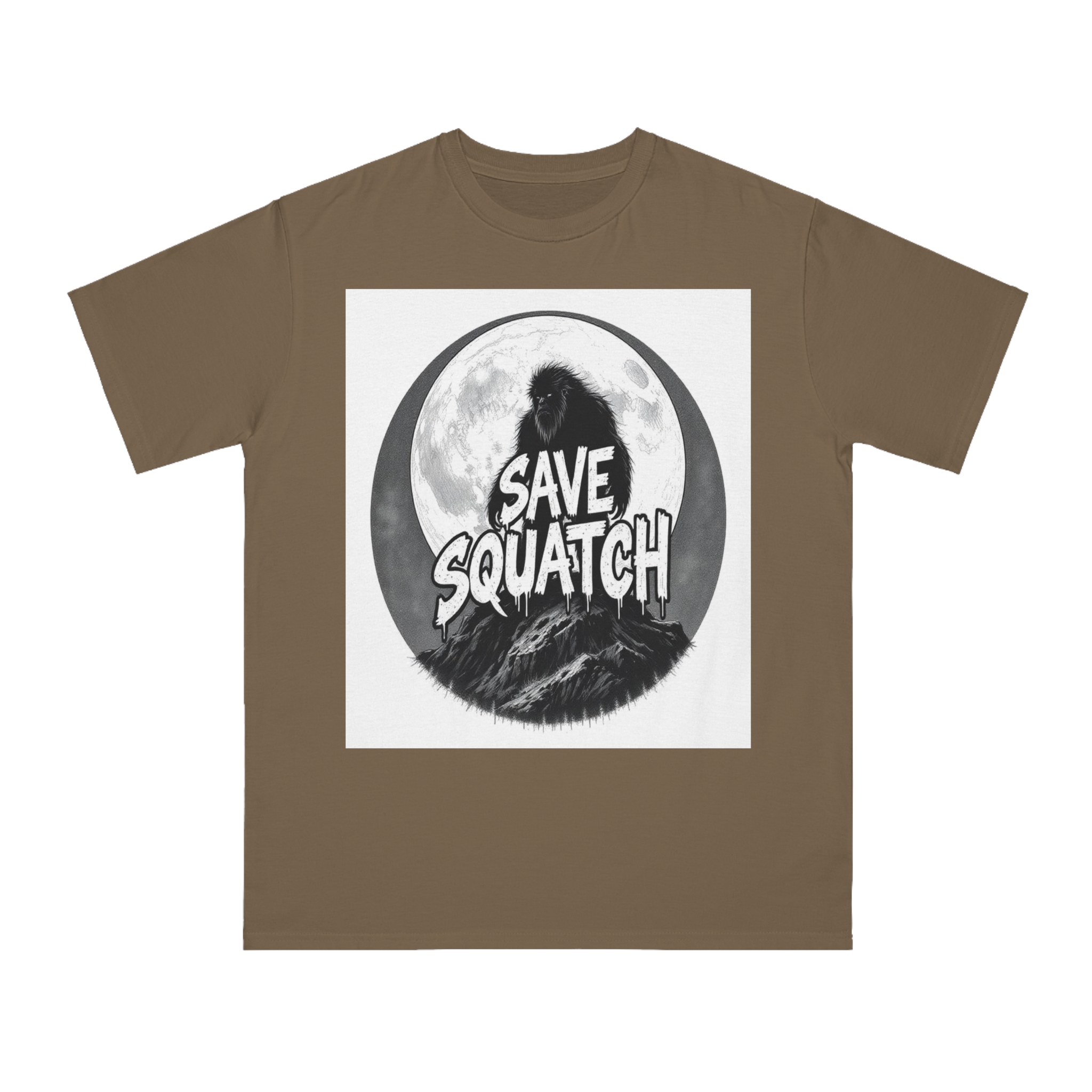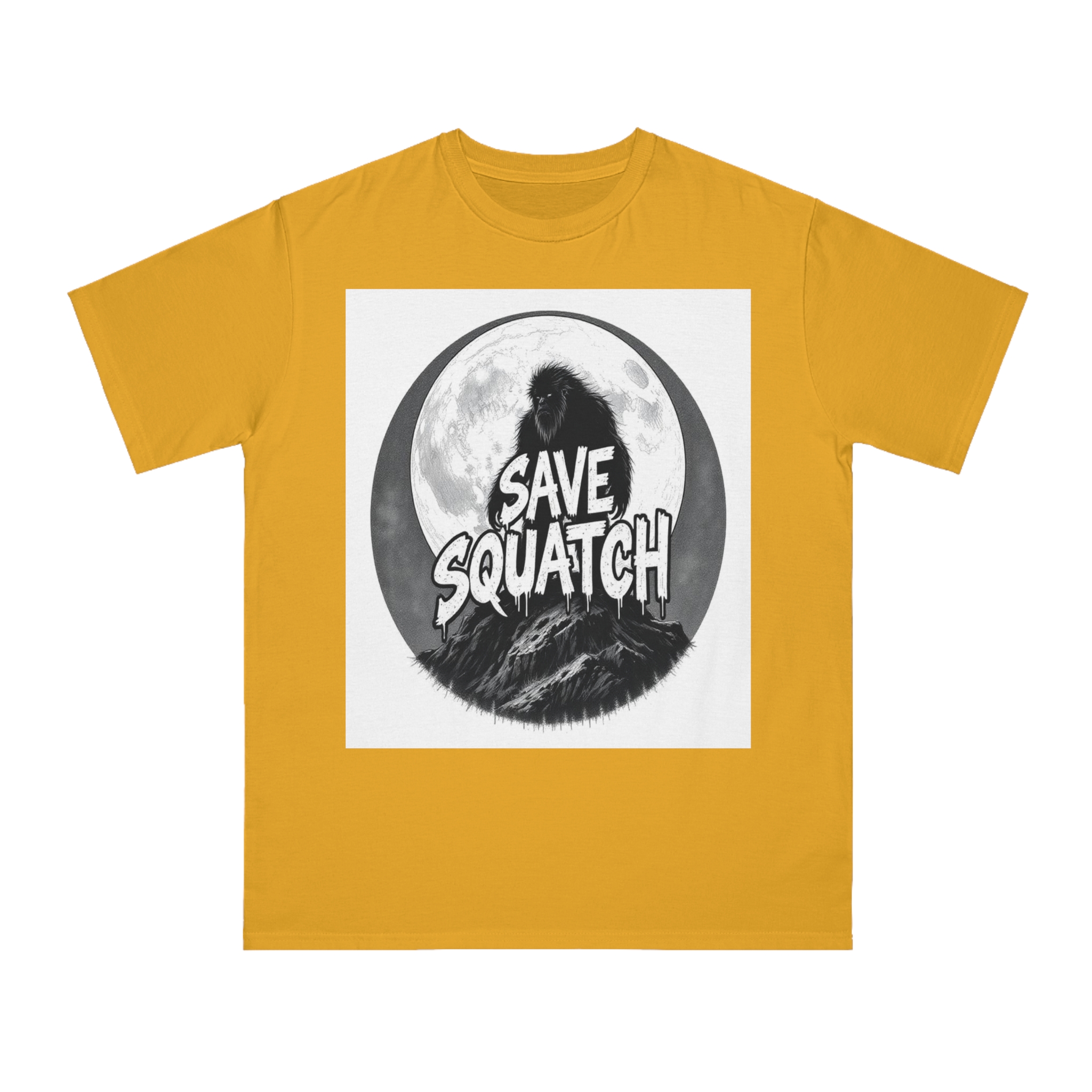 This black and white graphic design features a large, hairy cryptid silhouetted against a full moon, standing atop a rocky mountain landscape. The text “SAVE SQUATCH” is prominently displayed in bold, dripping letters across the center of the image, with the creature positioned behind and around the text. The artwork has a moody, high-contrast style with detailed shading and a circular composition that draws the eye to the central message. The Sasquatch or Bigfoot figure appears shaggy and imposing, embodying the mysterious and legendary nature of the creature. The image combines elements of folklore, conservation messaging, and graphic design to create a striking visual representation of the mythical forest-dwelling being.