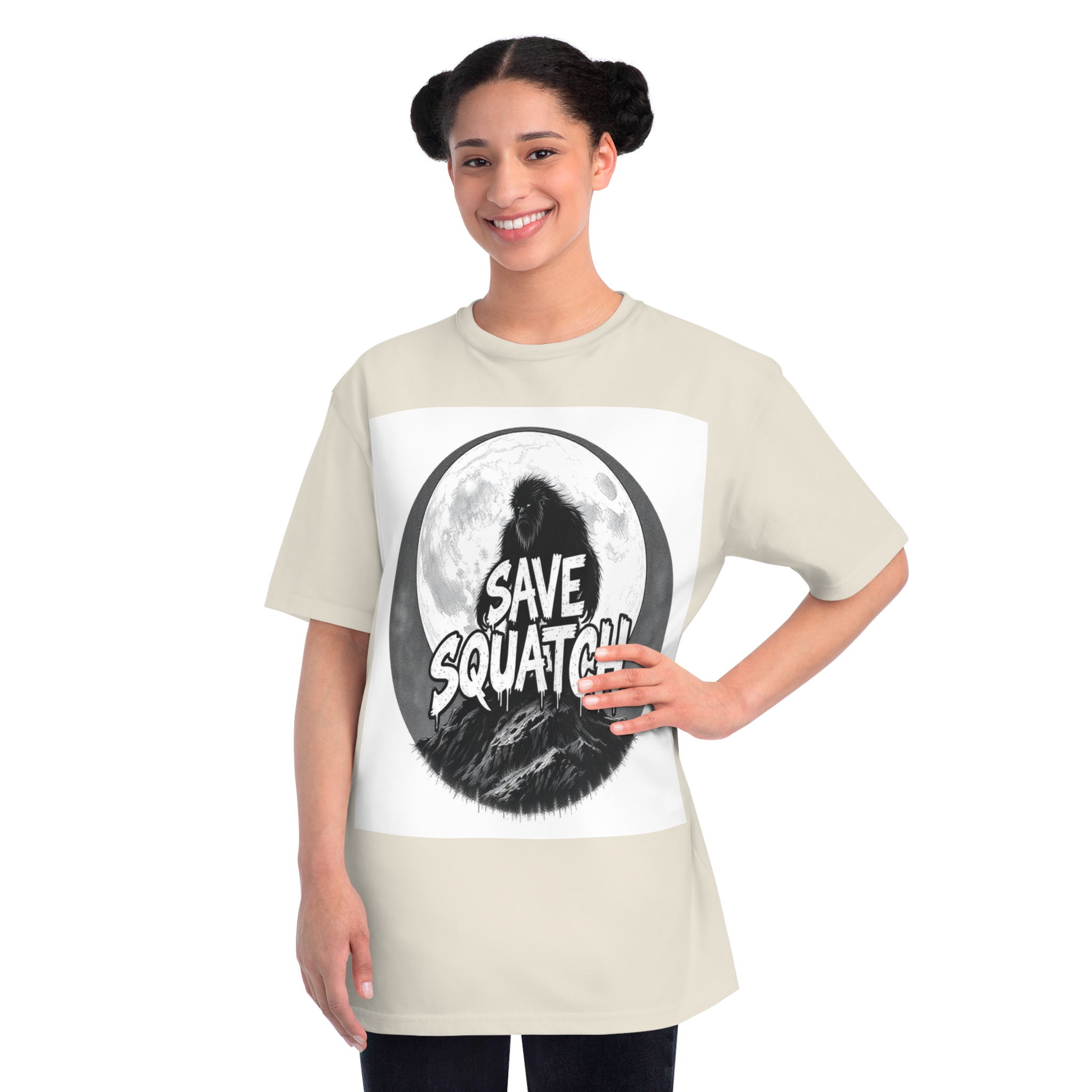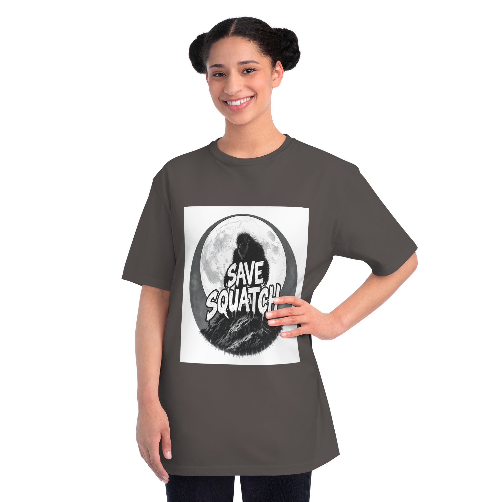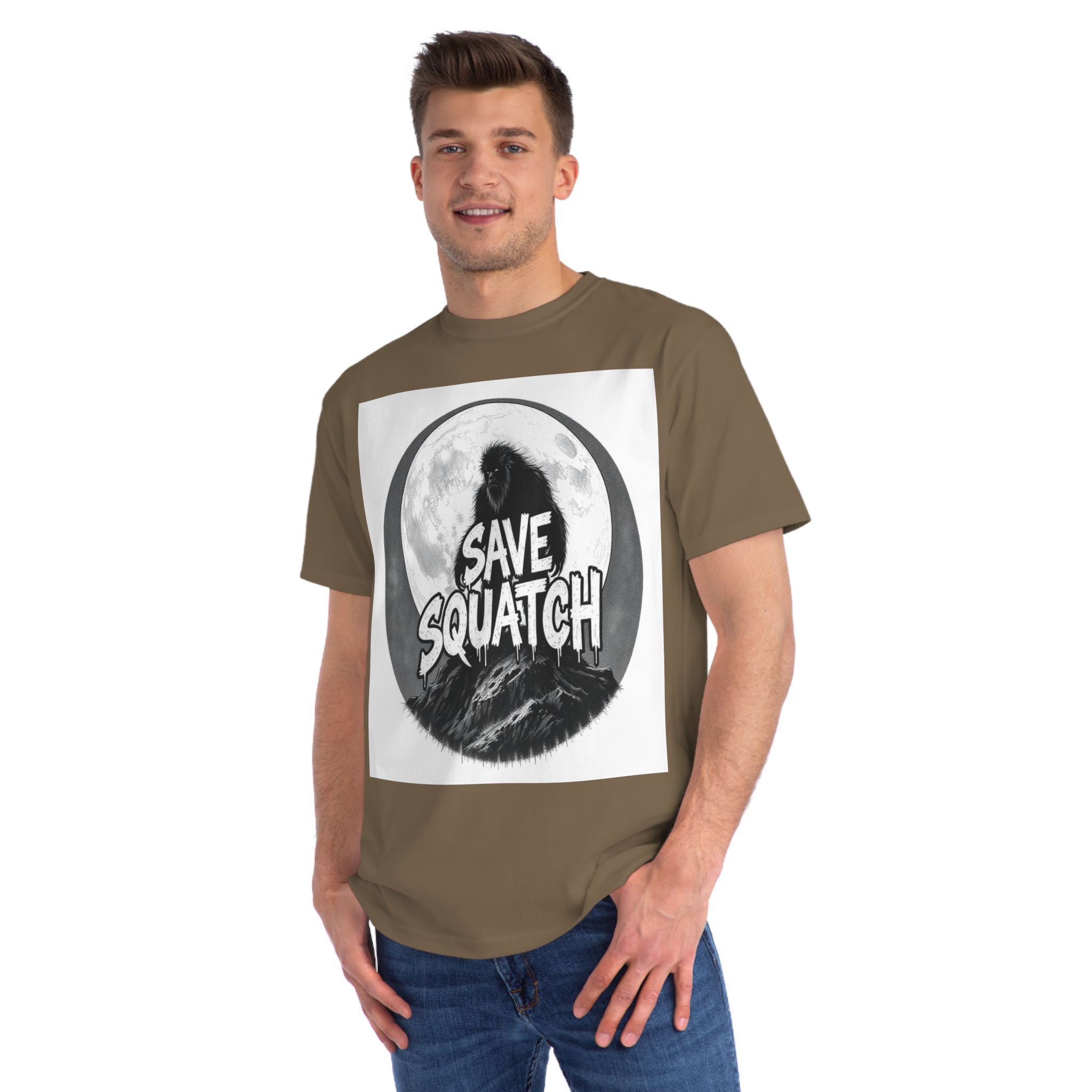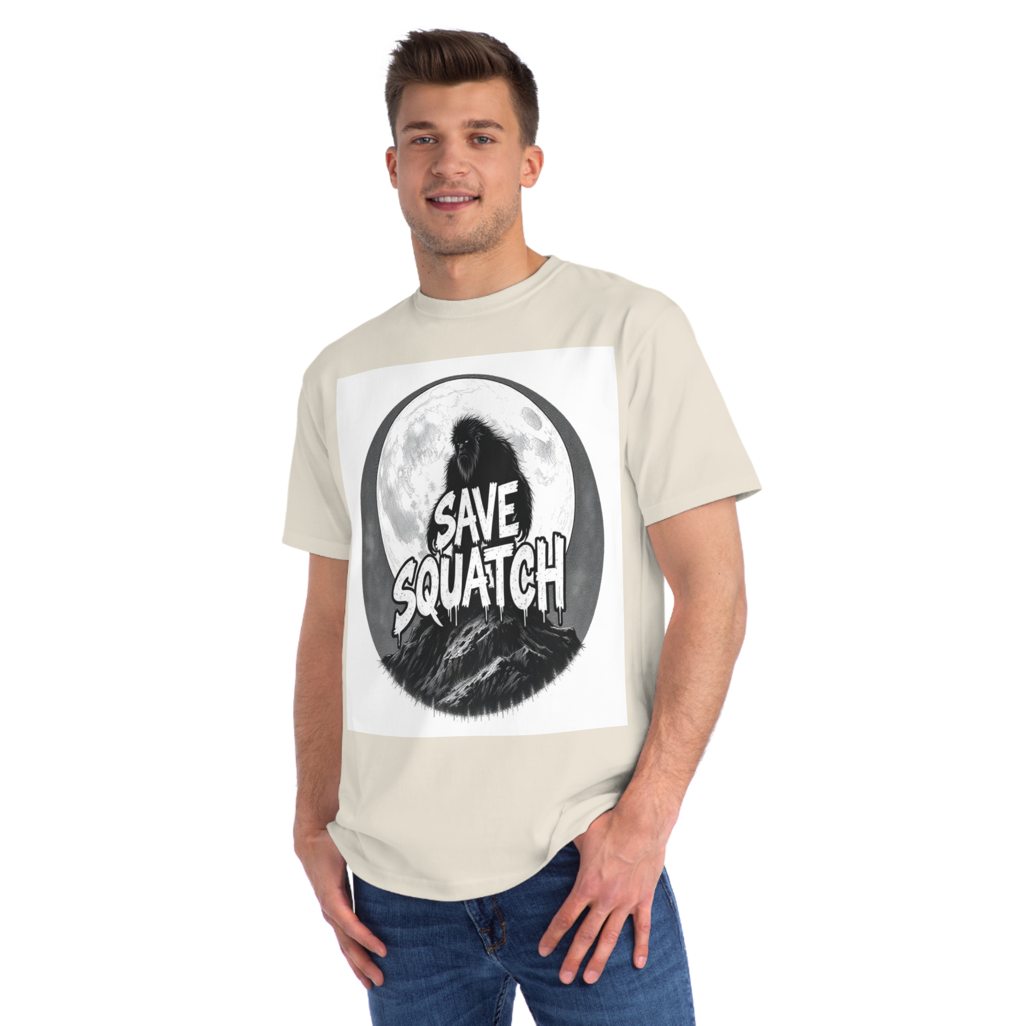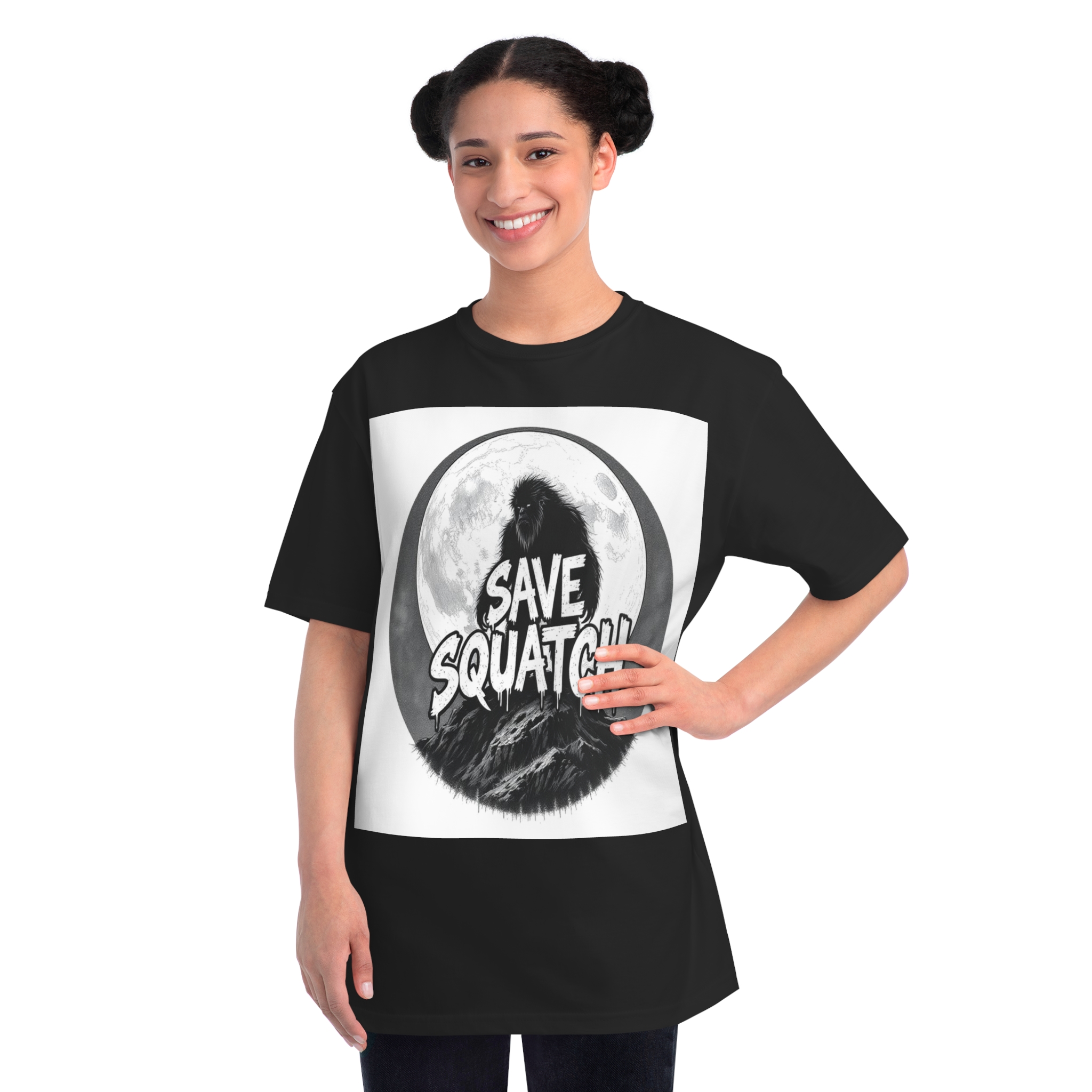 This black and white graphic design features a large, hairy cryptid silhouetted against a full moon, standing atop a rocky mountain landscape. The text “SAVE SQUATCH” is prominently displayed in bold, dripping letters across the center of the image, with the creature positioned behind and around the text. The artwork has a moody, high-contrast style with detailed shading and a circular composition that draws the eye to the central message. The Sasquatch or Bigfoot figure appears shaggy and imposing, embodying the mysterious and legendary nature of the creature. The image combines elements of folklore, conservation messaging, and graphic design to create a striking visual representation of the mythical forest-dwelling being.