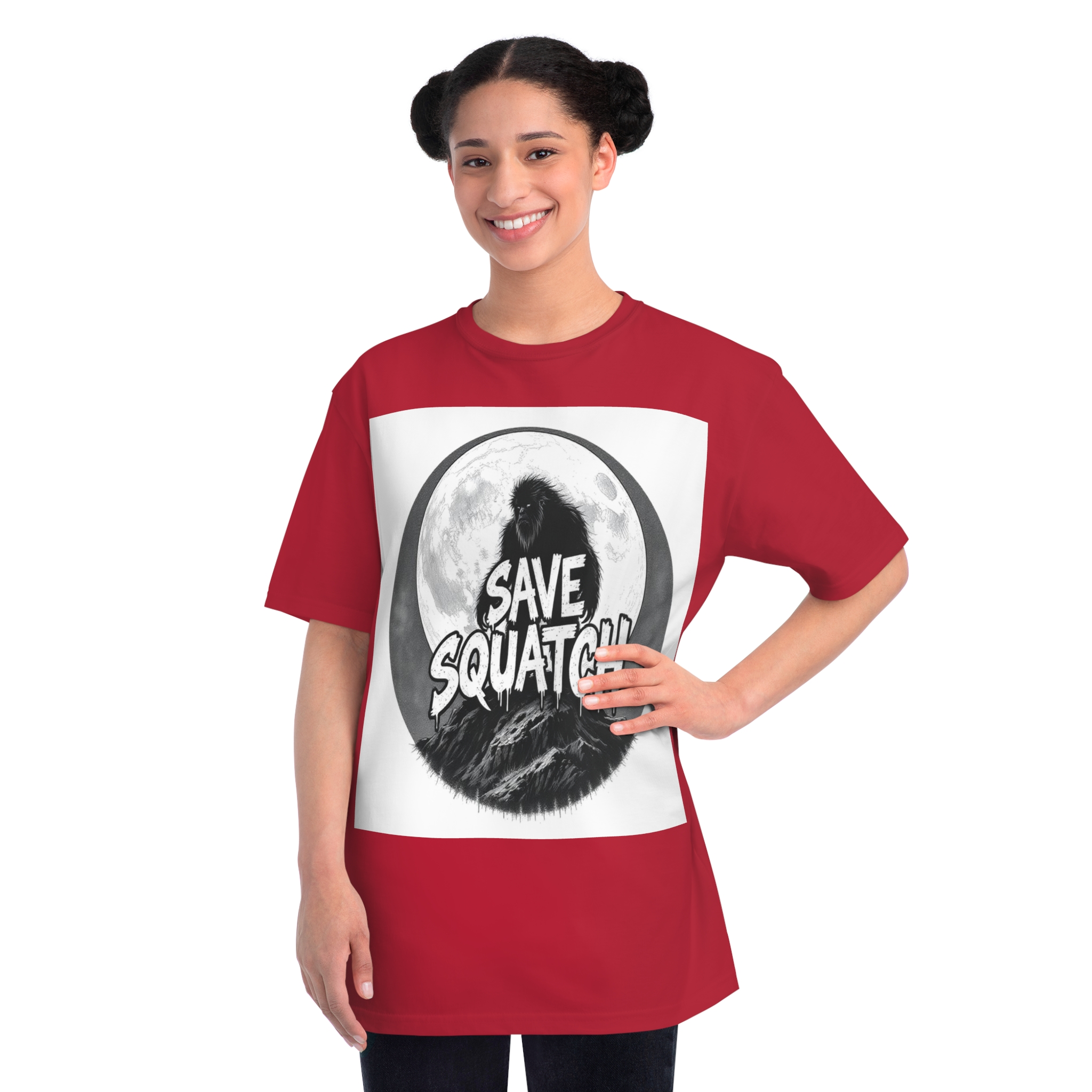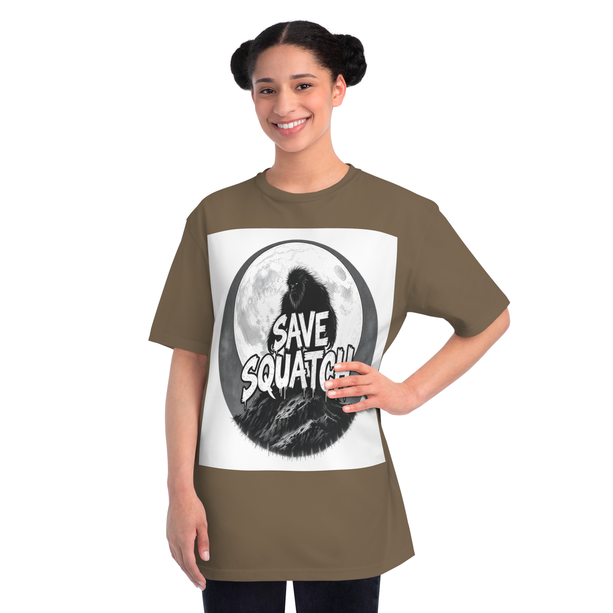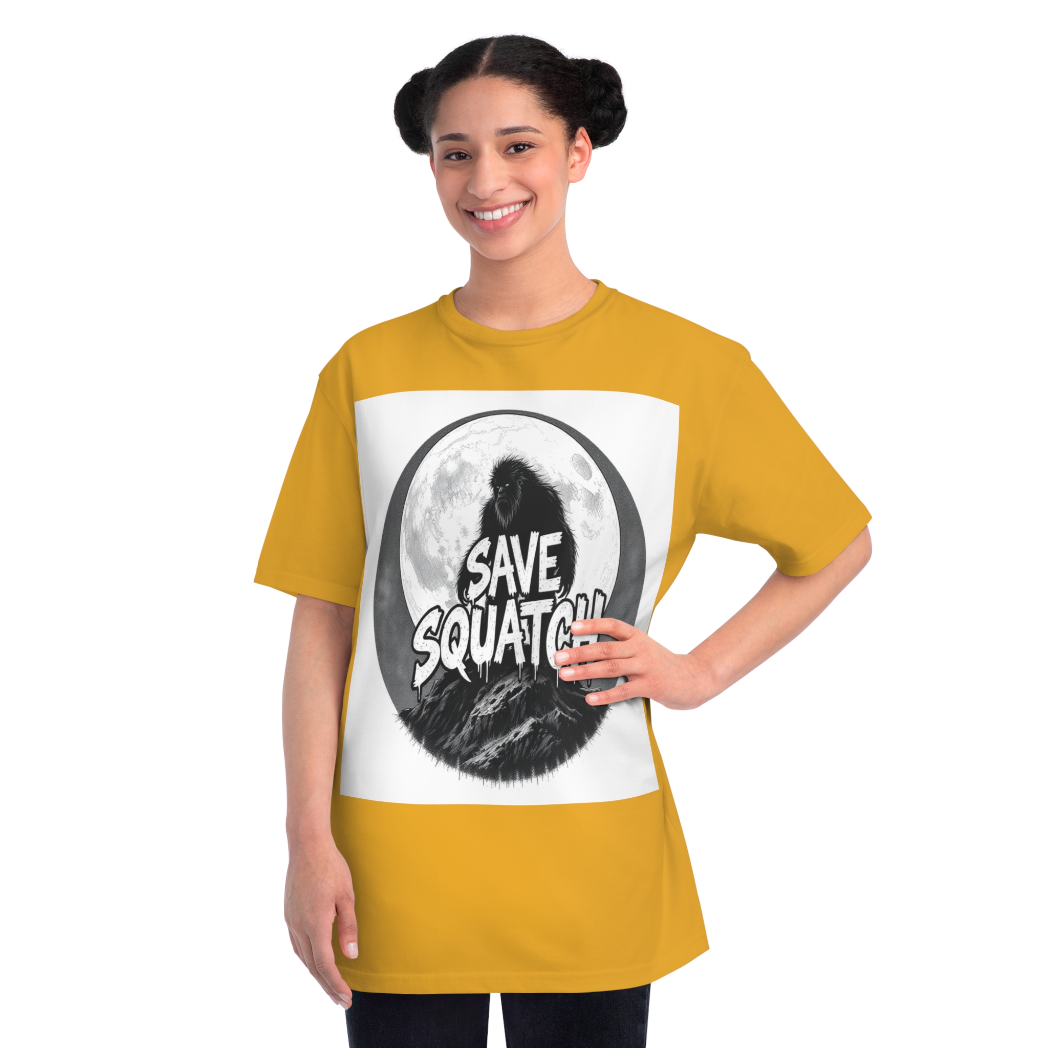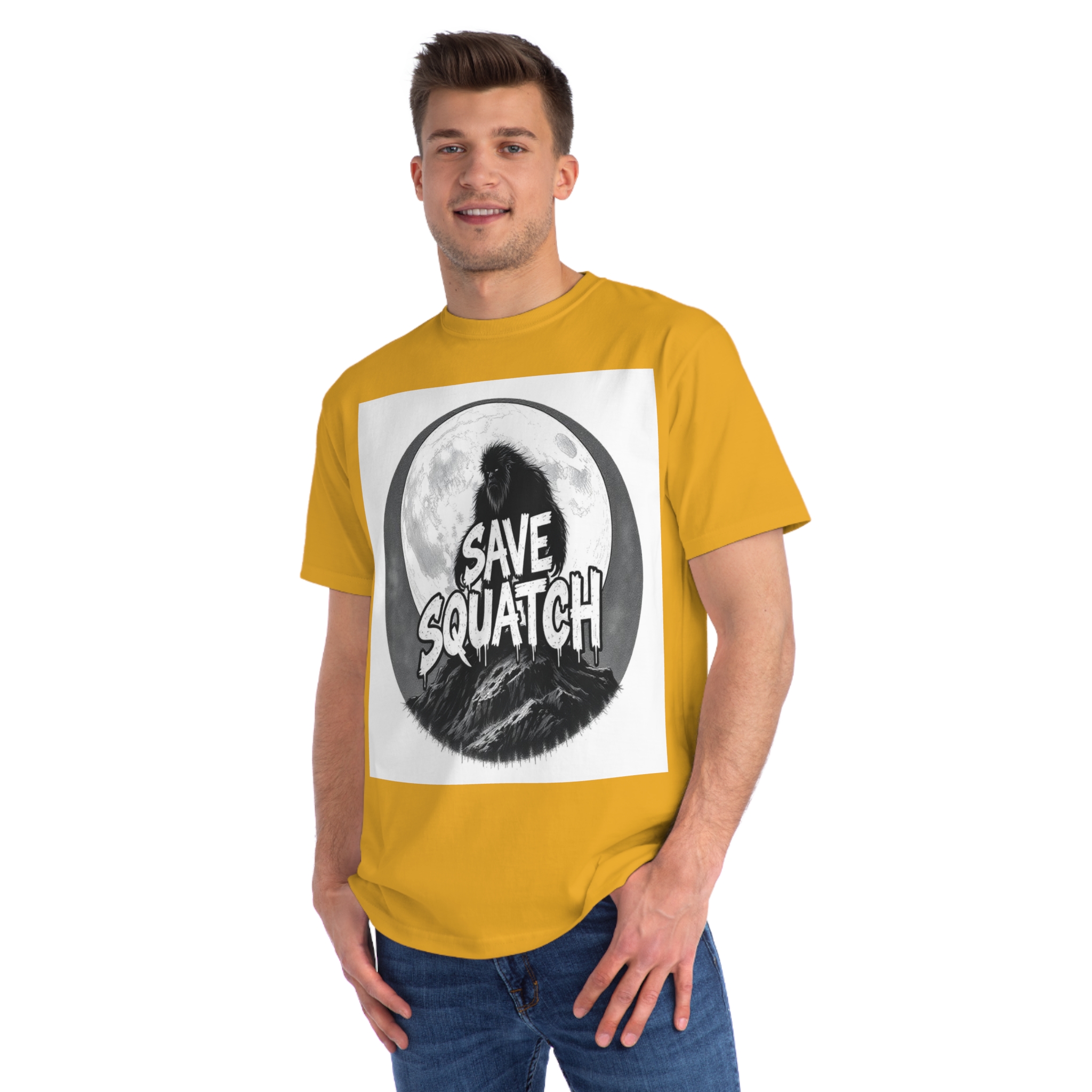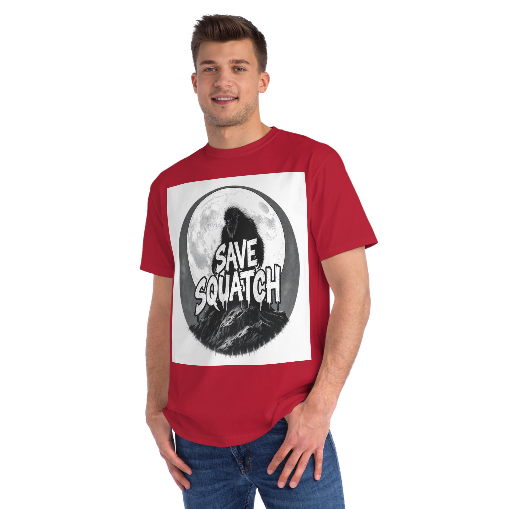 This black and white graphic design features a large, hairy cryptid silhouetted against a full moon, standing atop a rocky mountain landscape. The text “SAVE SQUATCH” is prominently displayed in bold, dripping letters across the center of the image, with the creature positioned behind and around the text. The artwork has a moody, high-contrast style with detailed shading and a circular composition that draws the eye to the central message. The Sasquatch or Bigfoot figure appears shaggy and imposing, embodying the mysterious and legendary nature of the creature. The image combines elements of folklore, conservation messaging, and graphic design to create a striking visual representation of the mythical forest-dwelling being.