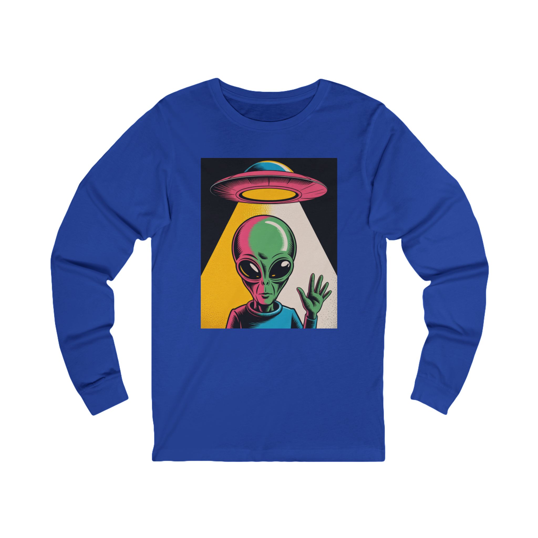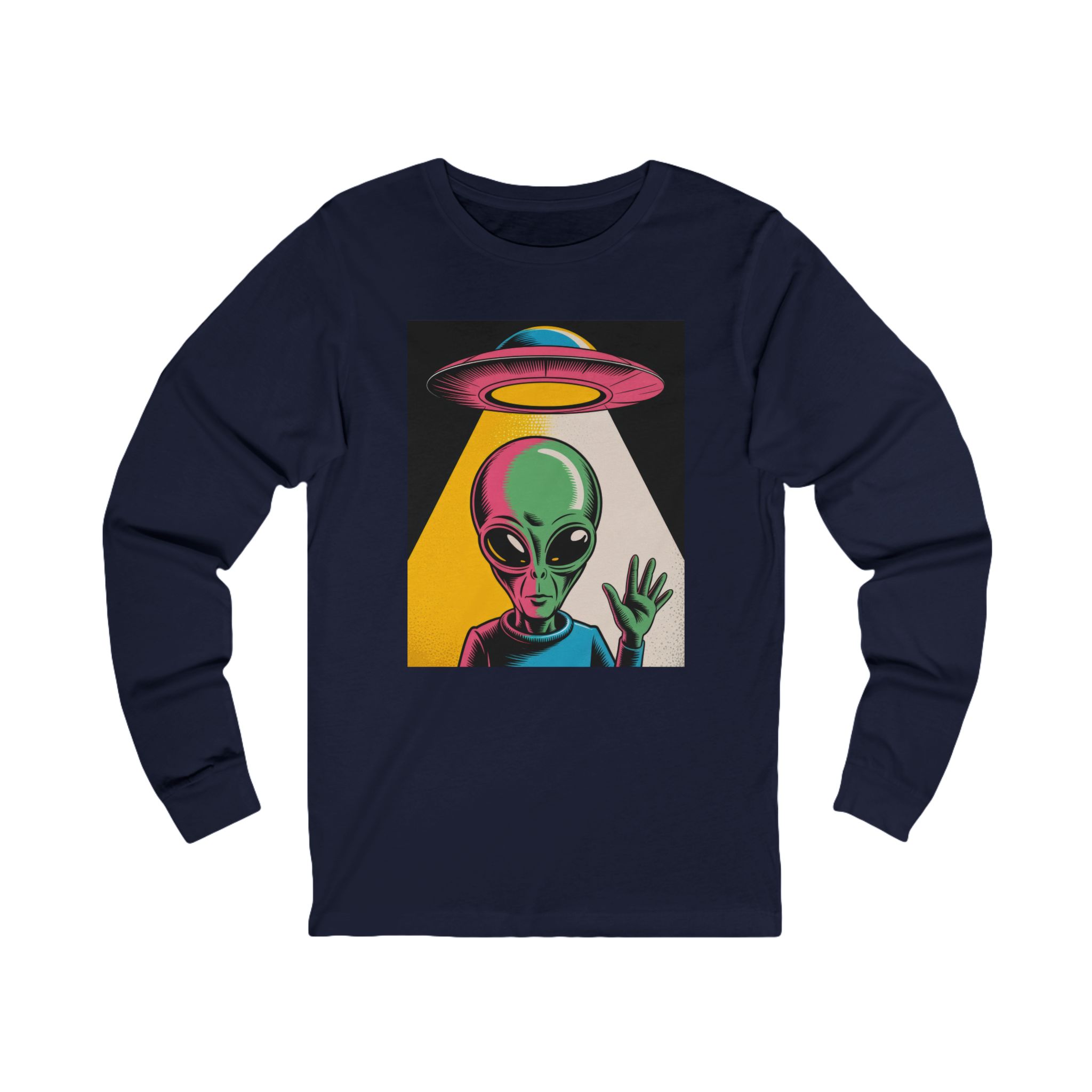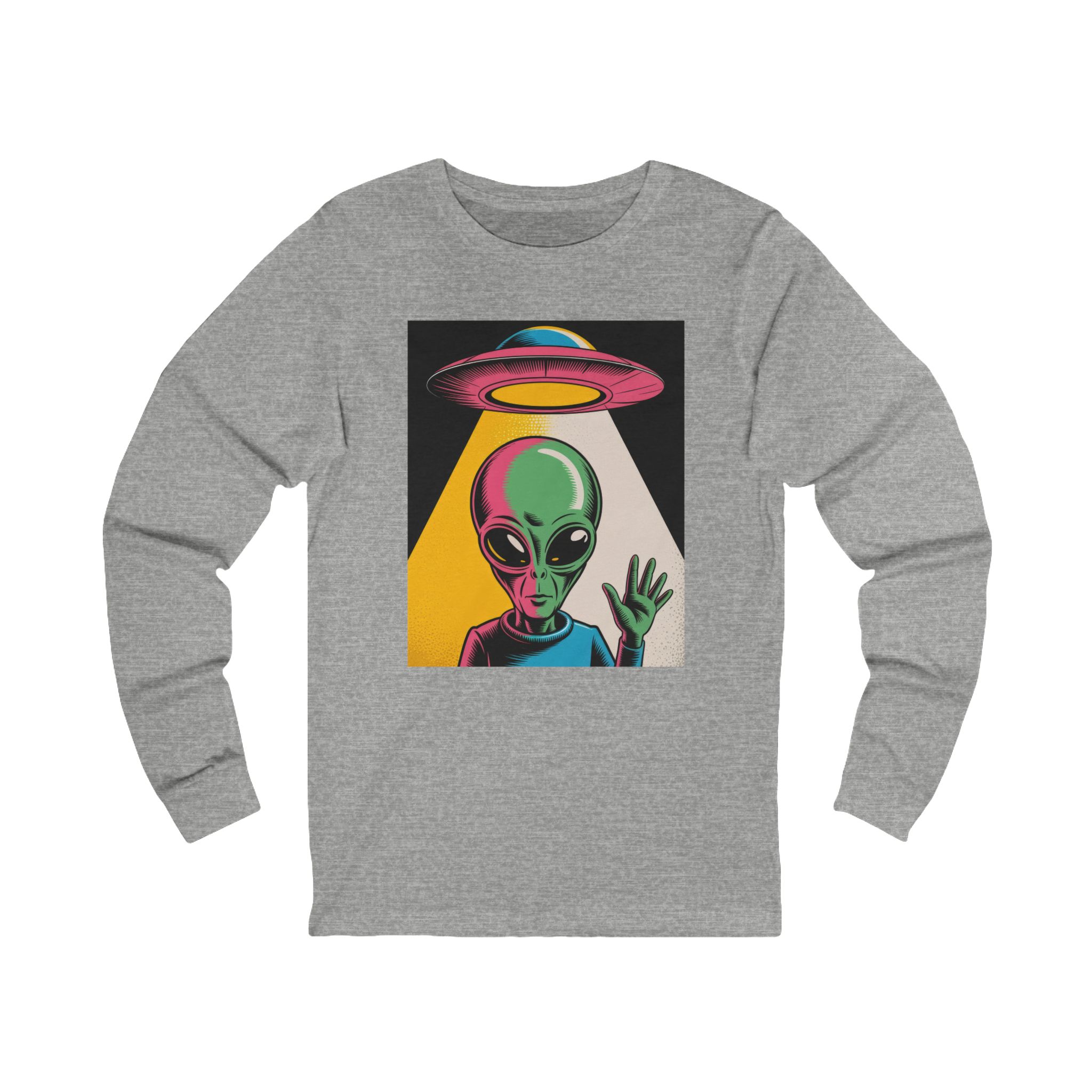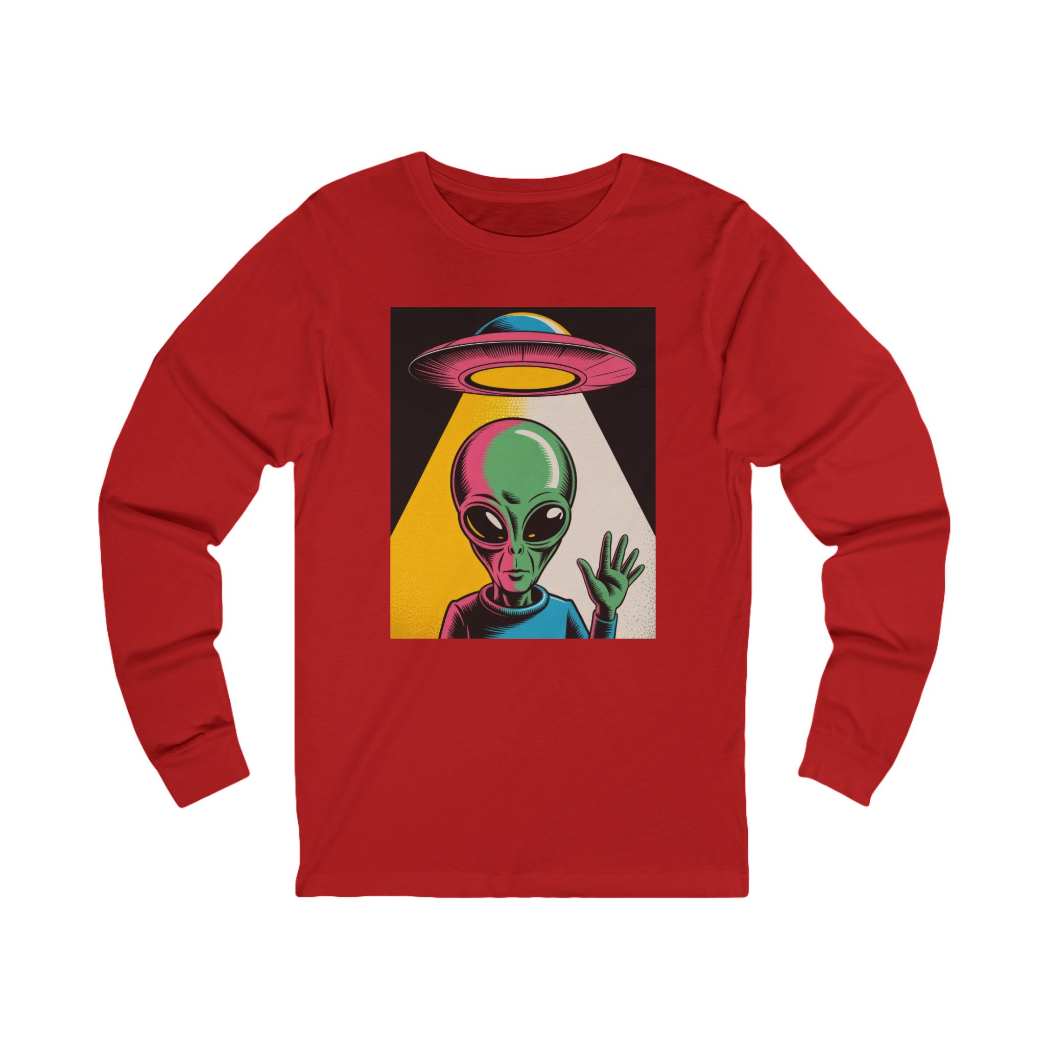 Bright, odd, and pulsing with motion—this lightweight long sleeve t-shirt brings a Warhol-inspired alien aesthetic to your daily rotation. The playful extraterrestrial waves while a retro UFO drifts overhead, all rendered in bold, pop-art colors that leap off the soft, airy fabric.