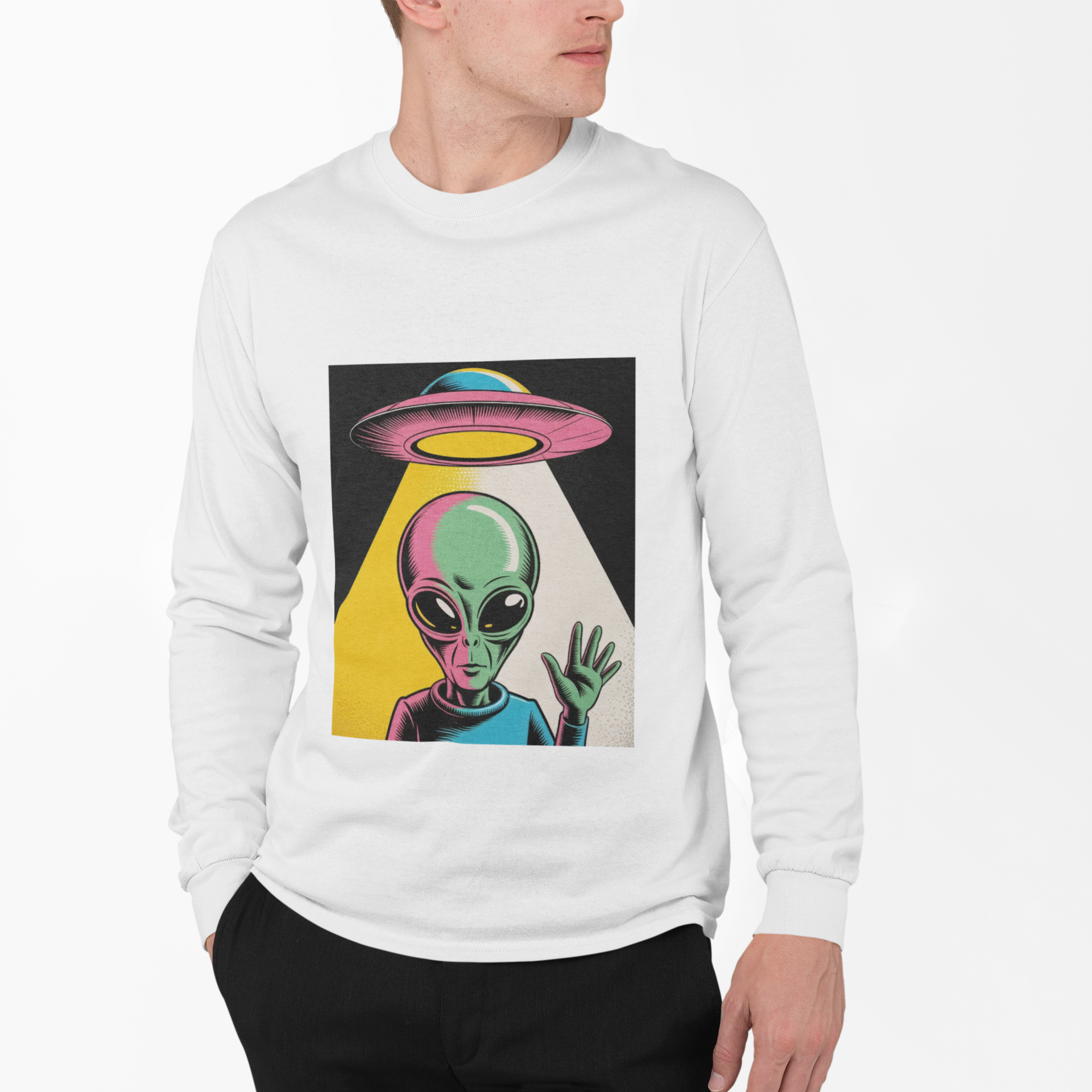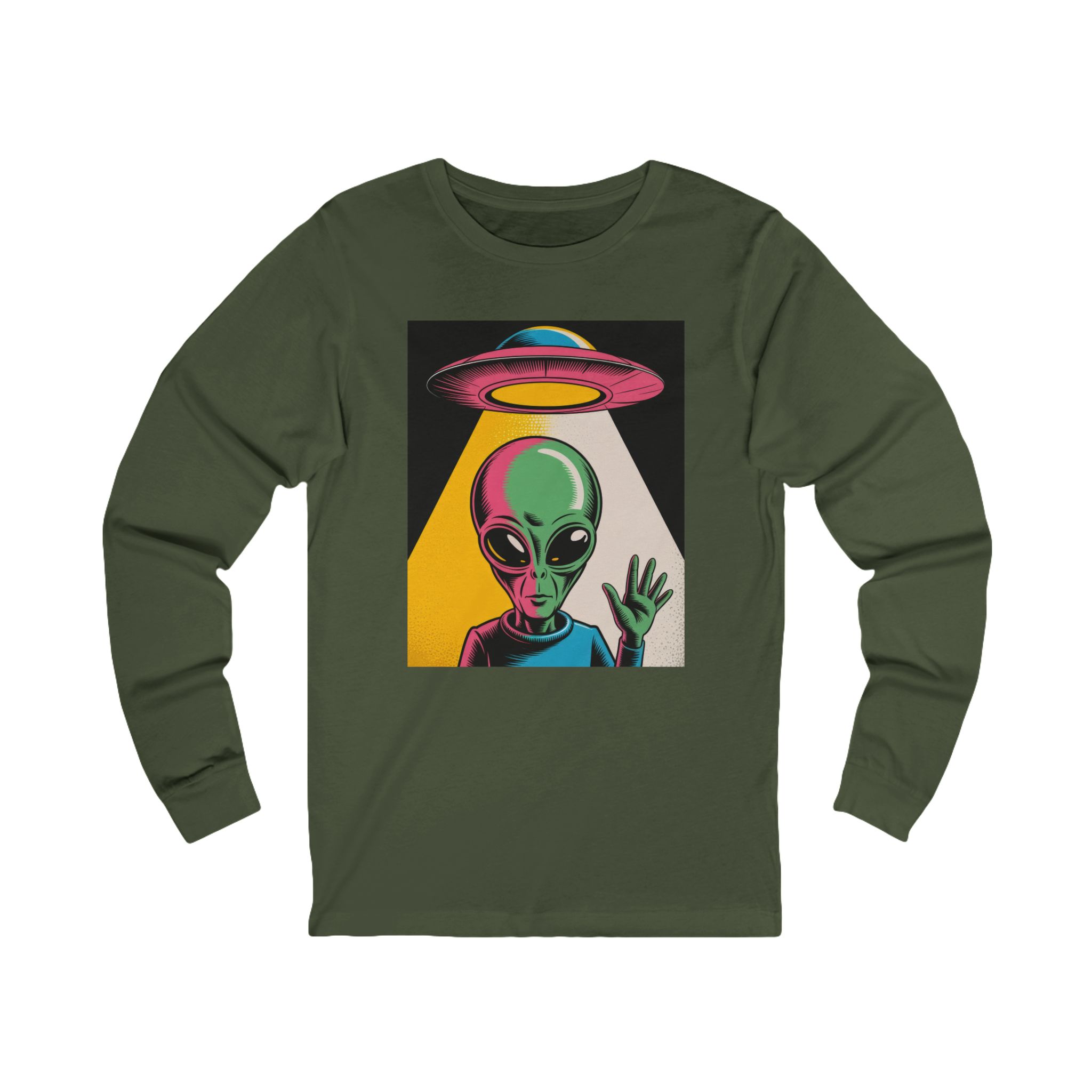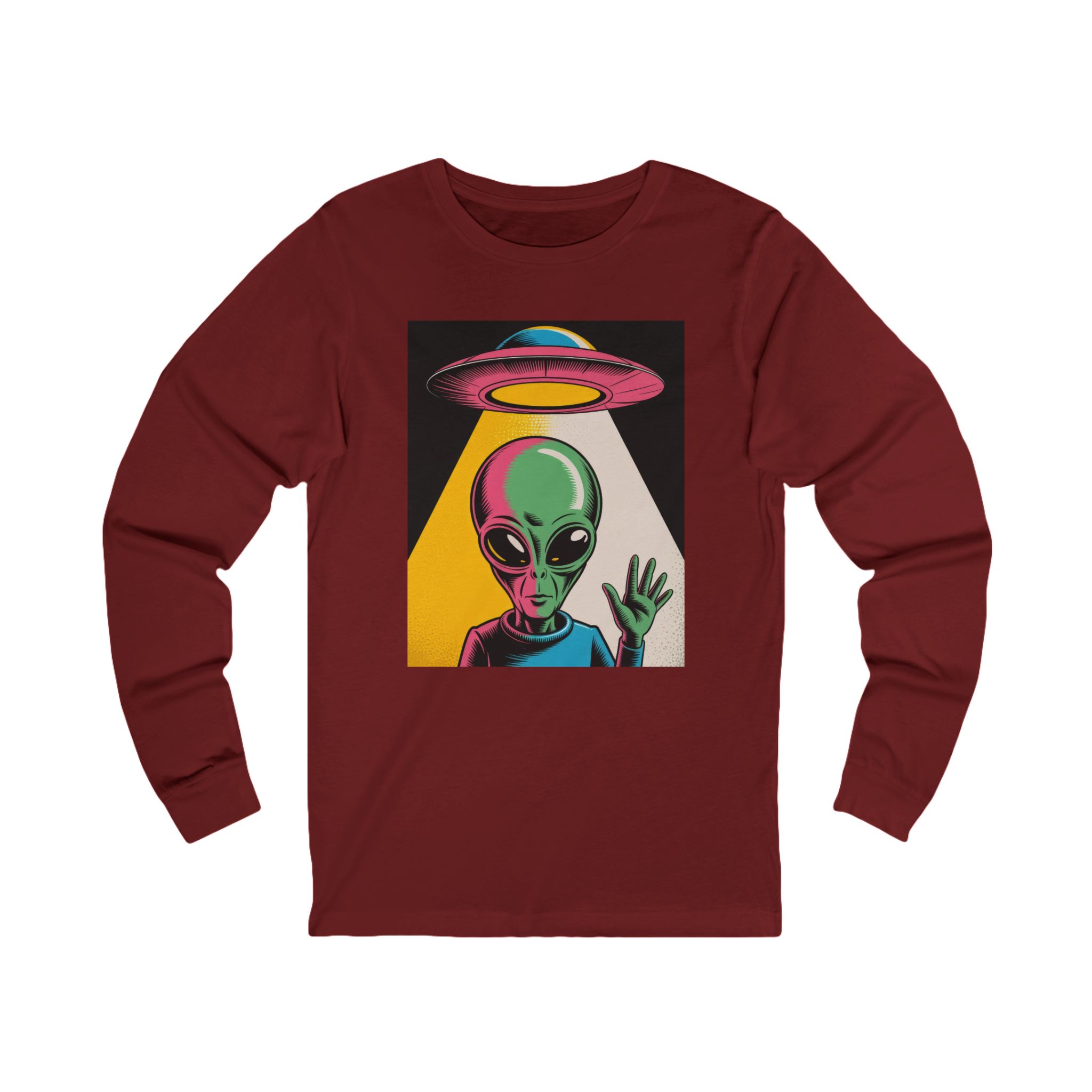 Bright, odd, and pulsing with motion—this lightweight long sleeve t-shirt brings a Warhol-inspired alien aesthetic to your daily rotation. The playful extraterrestrial waves while a retro UFO drifts overhead, all rendered in bold, pop-art colors that leap off the soft, airy fabric.