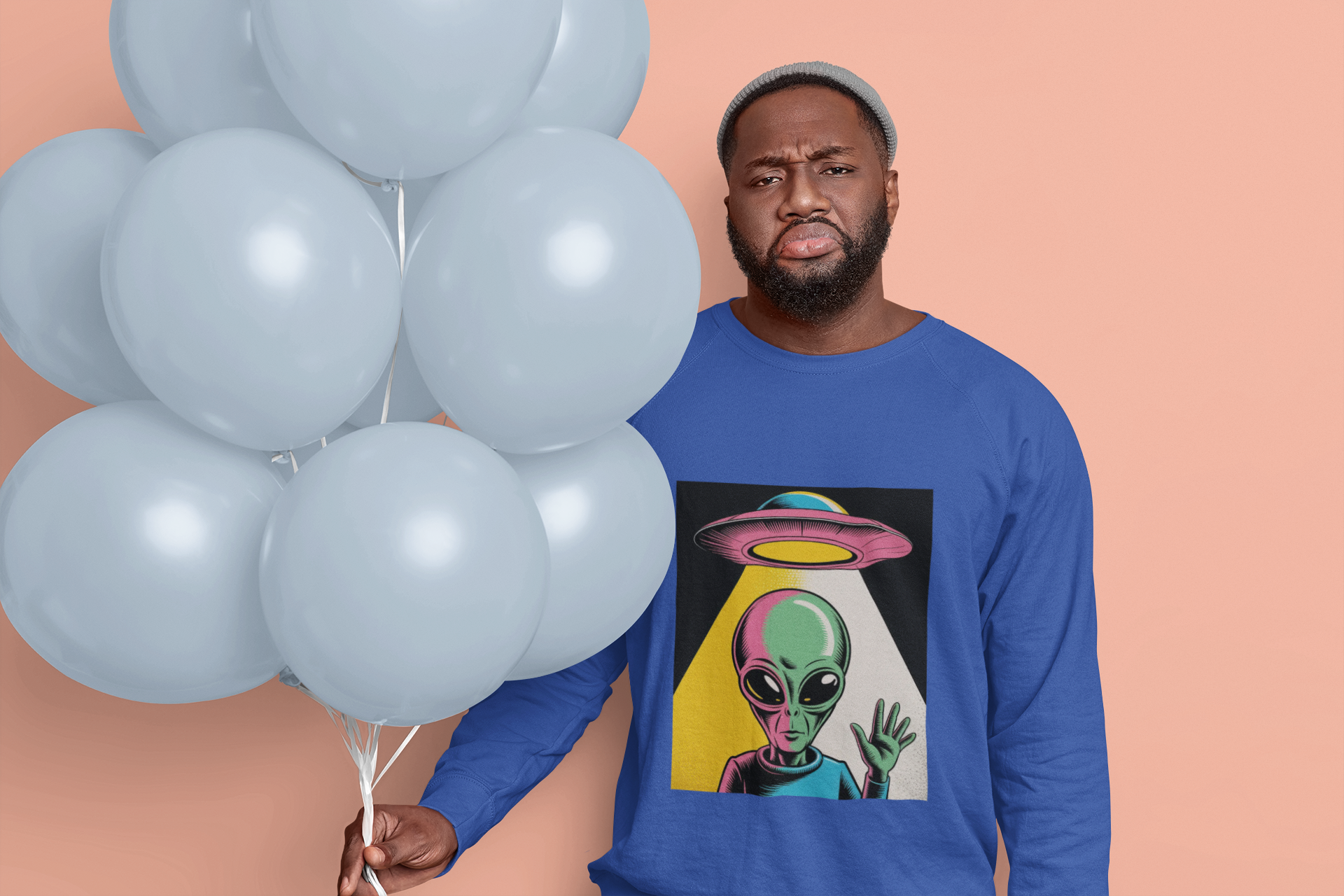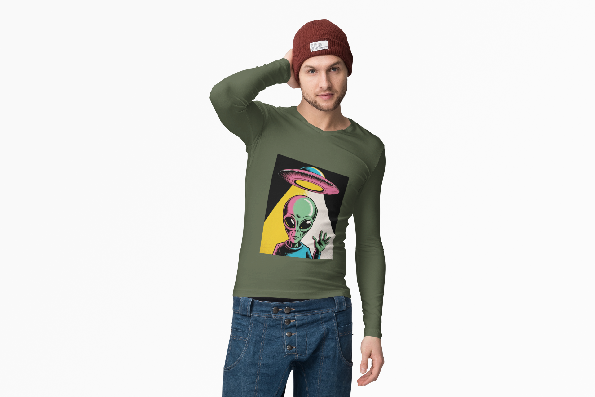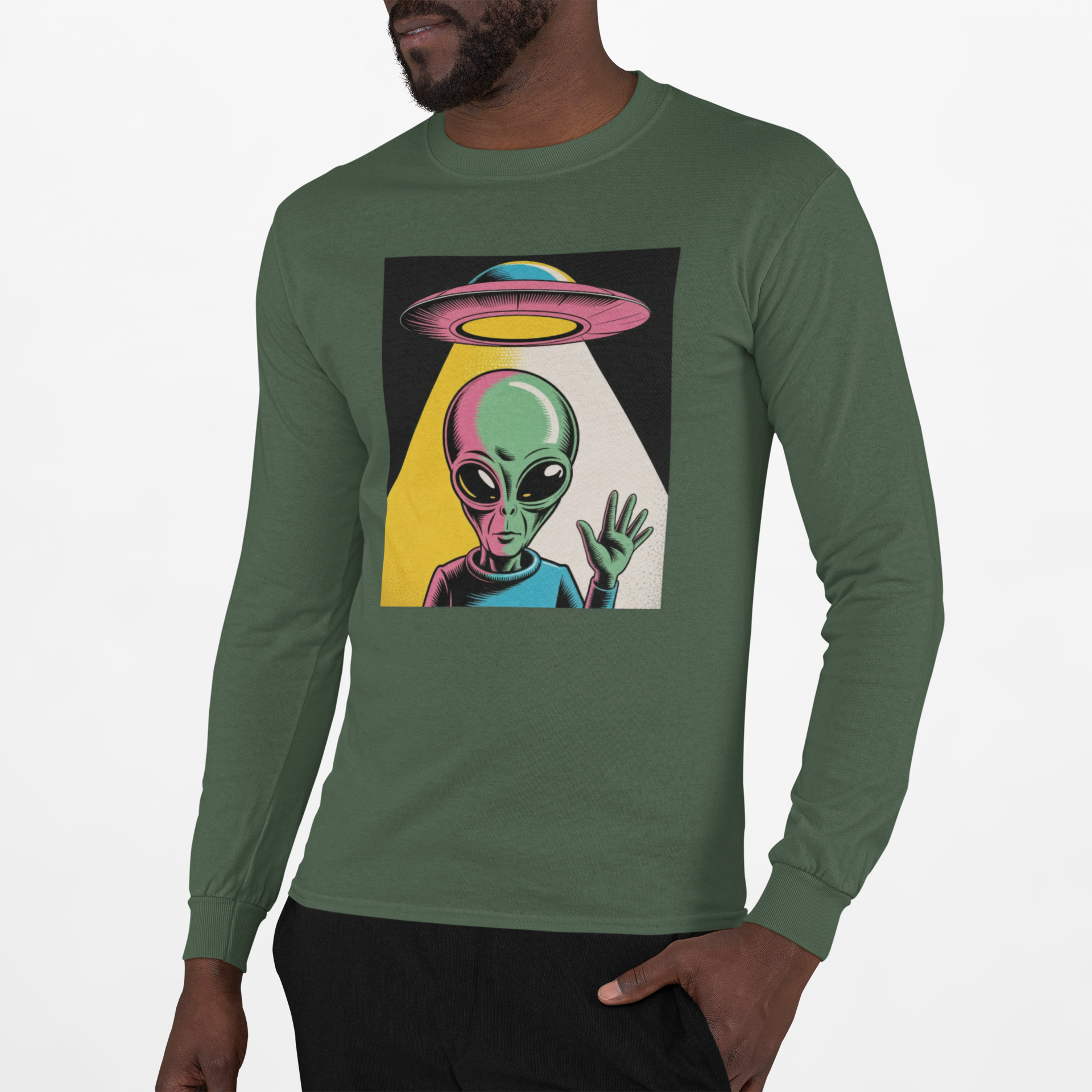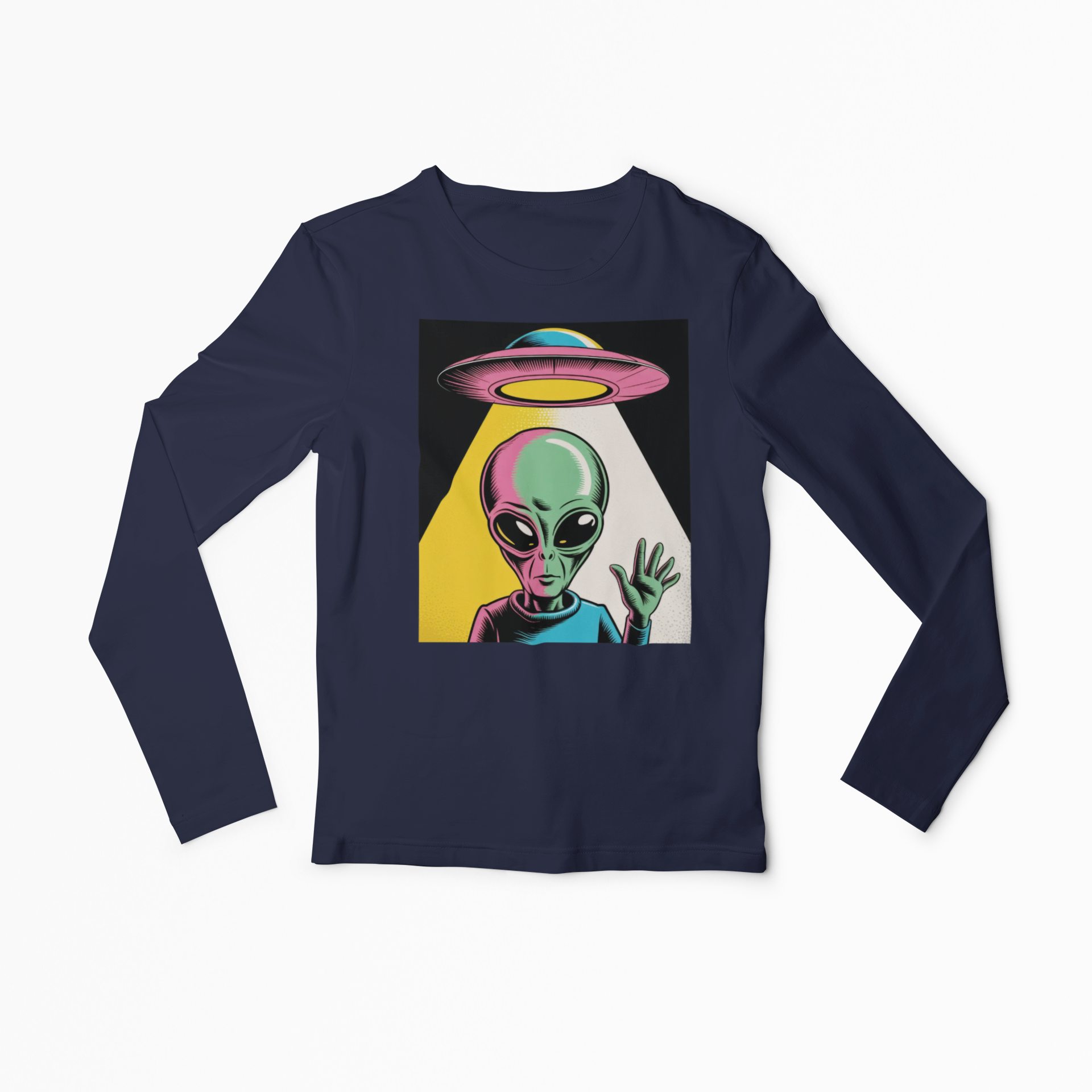 Bright, odd, and pulsing with motion—this lightweight long sleeve t-shirt brings a Warhol-inspired alien aesthetic to your daily rotation. The playful extraterrestrial waves while a retro UFO drifts overhead, all rendered in bold, pop-art colors that leap off the soft, airy fabric.