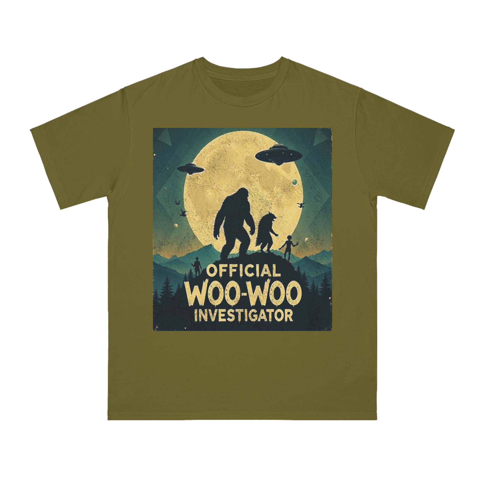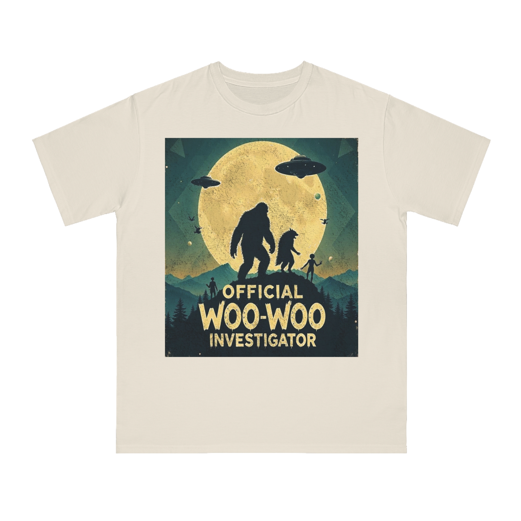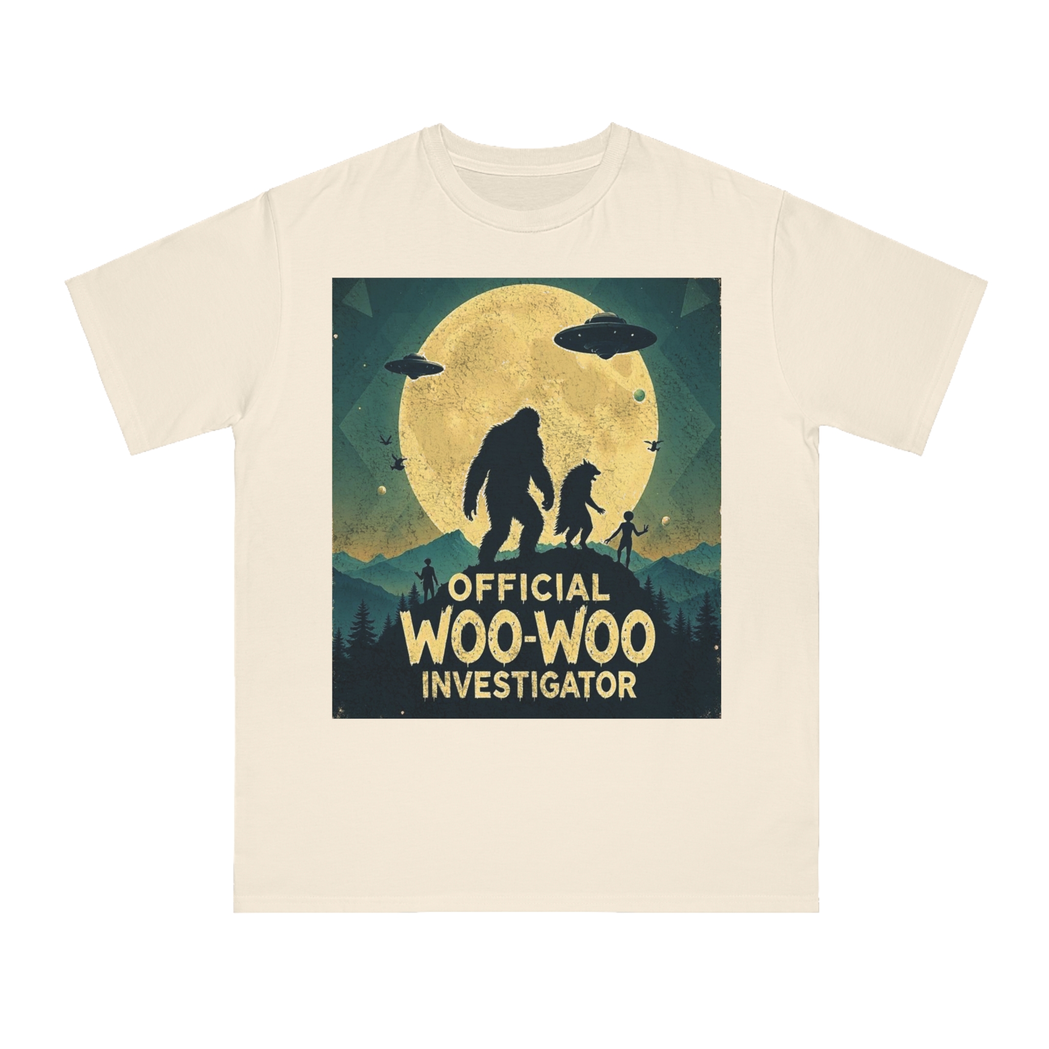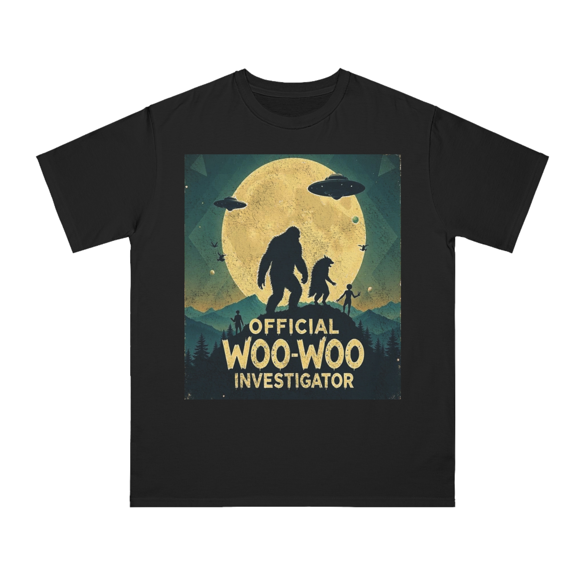Discover the whimsical world of cryptid investigation with this vintage-style poster featuring a humorous “Official Woo-Woo Investigator” theme. The image depicts a silhouetted landscape under a massive golden moon, with two large cryptid-like creatures (a Bigfoot and what appears to be a smaller companion) standing dramatically against the lunar backdrop. Two UFOs hover in the sky, while small humanoid figures and birds add to the mysterious atmosphere. The graphic uses a retro, slightly weathered design with a teal and yellow color palette that evokes classic paranormal and conspiracy theory artwork. This playful illustration captures the essence of supernatural investigation, blending folklore, alien encounters, and cryptozoology into a single, entertaining visual narrative.