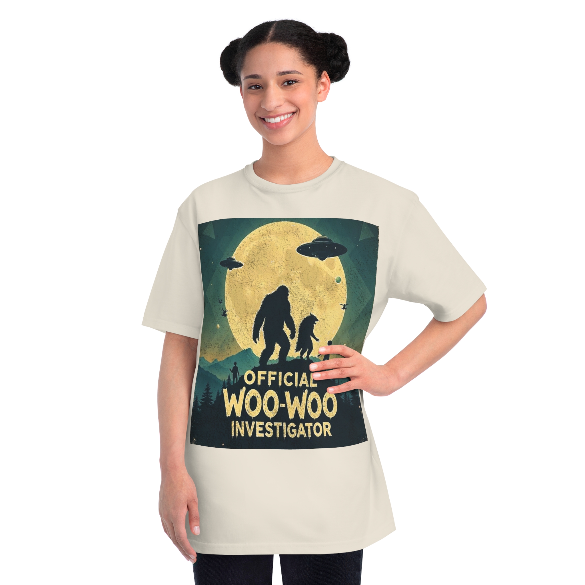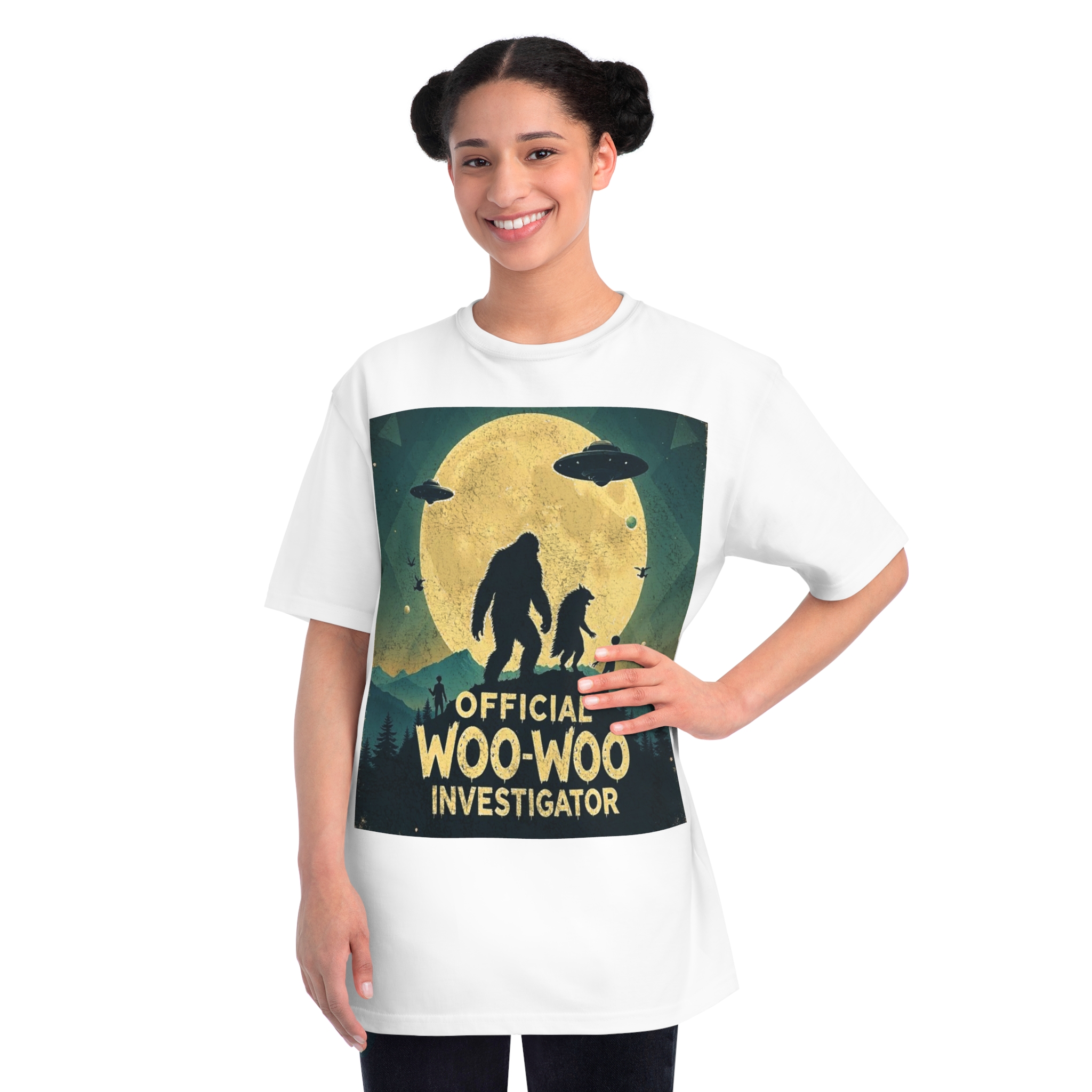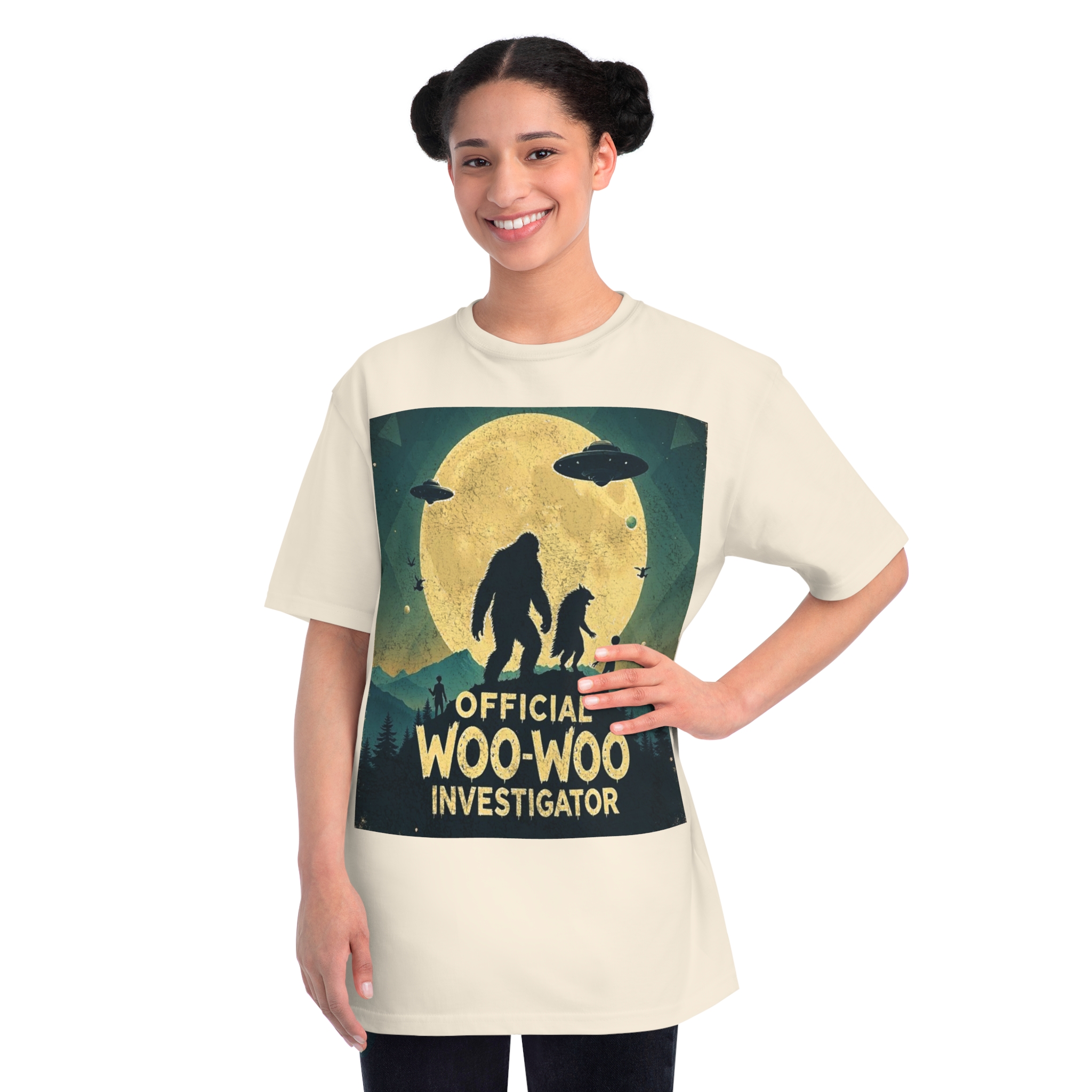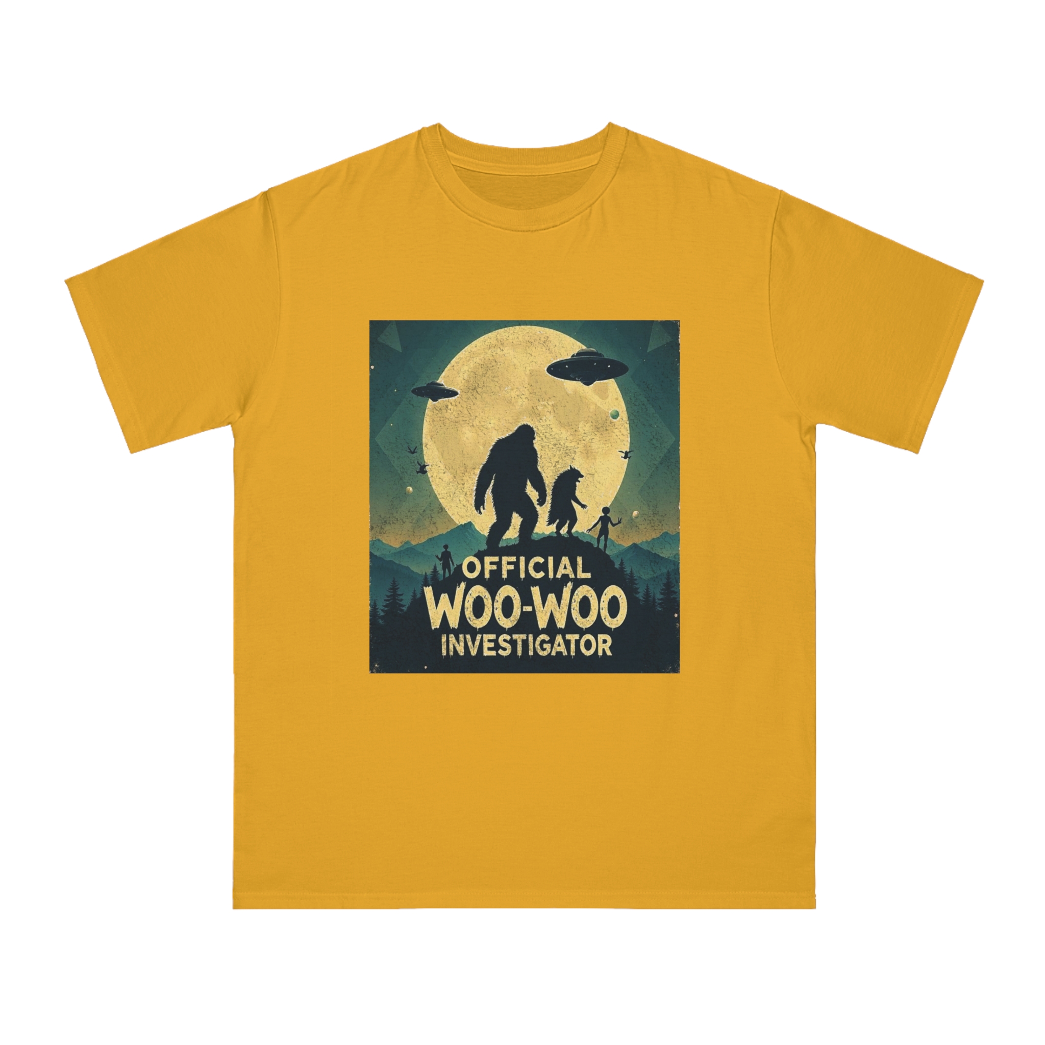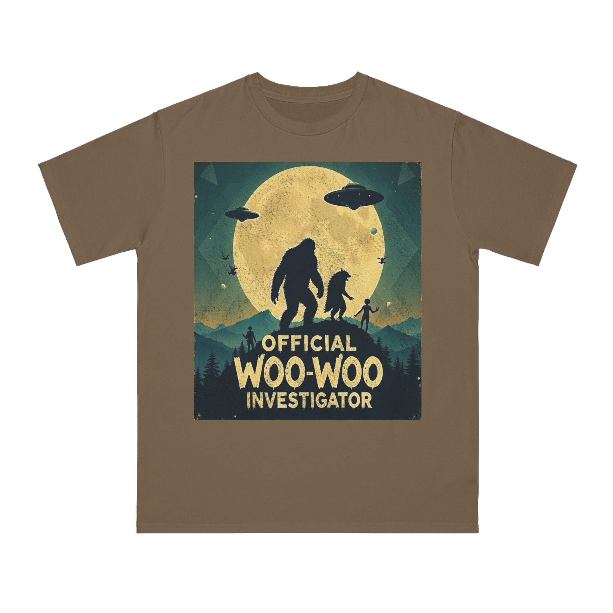 Discover the whimsical world of cryptid investigation with this vintage-style poster featuring a humorous “Official Woo-Woo Investigator” theme. The image depicts a silhouetted landscape under a massive golden moon, with two large cryptid-like creatures (a Bigfoot and what appears to be a smaller companion) standing dramatically against the lunar backdrop. Two UFOs hover in the sky, while small humanoid figures and birds add to the mysterious atmosphere. The graphic uses a retro, slightly weathered design with a teal and yellow color palette that evokes classic paranormal and conspiracy theory artwork. This playful illustration captures the essence of supernatural investigation, blending folklore, alien encounters, and cryptozoology into a single, entertaining visual narrative.