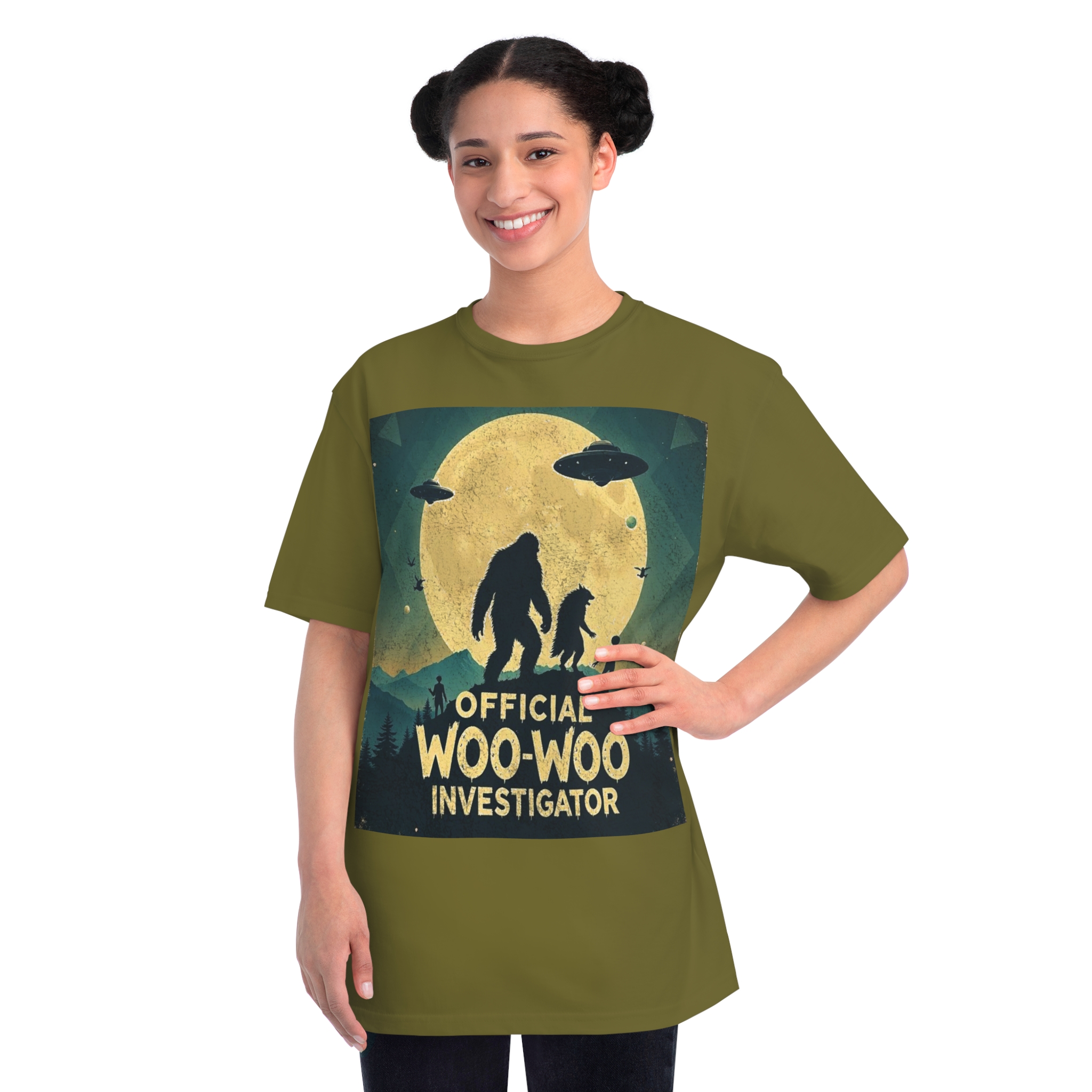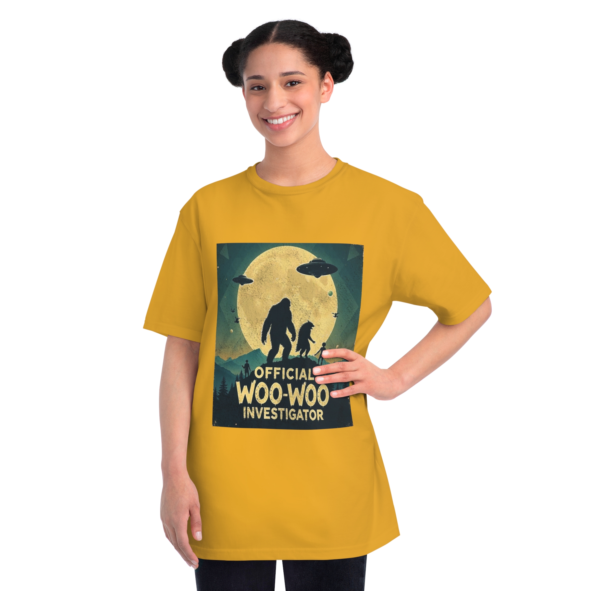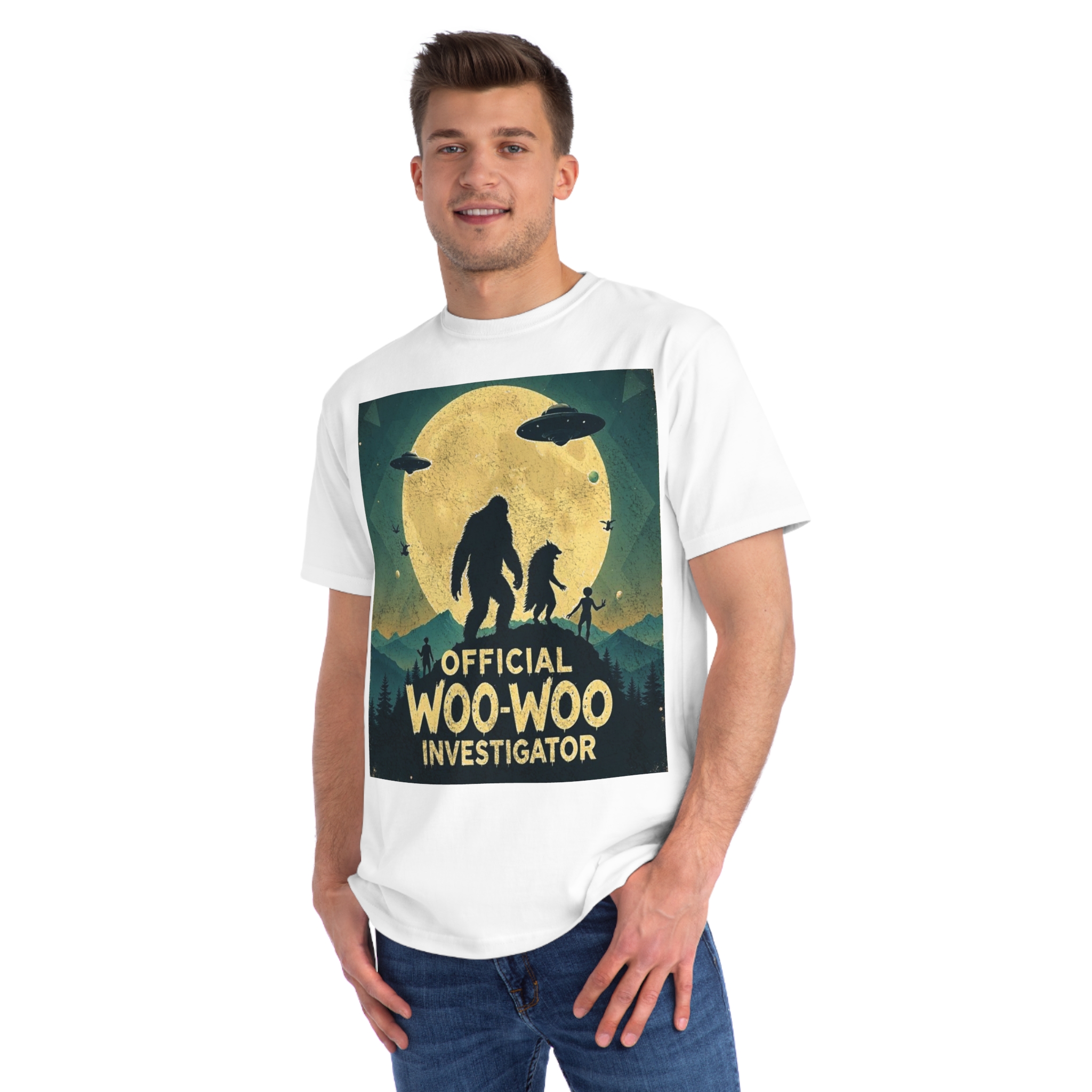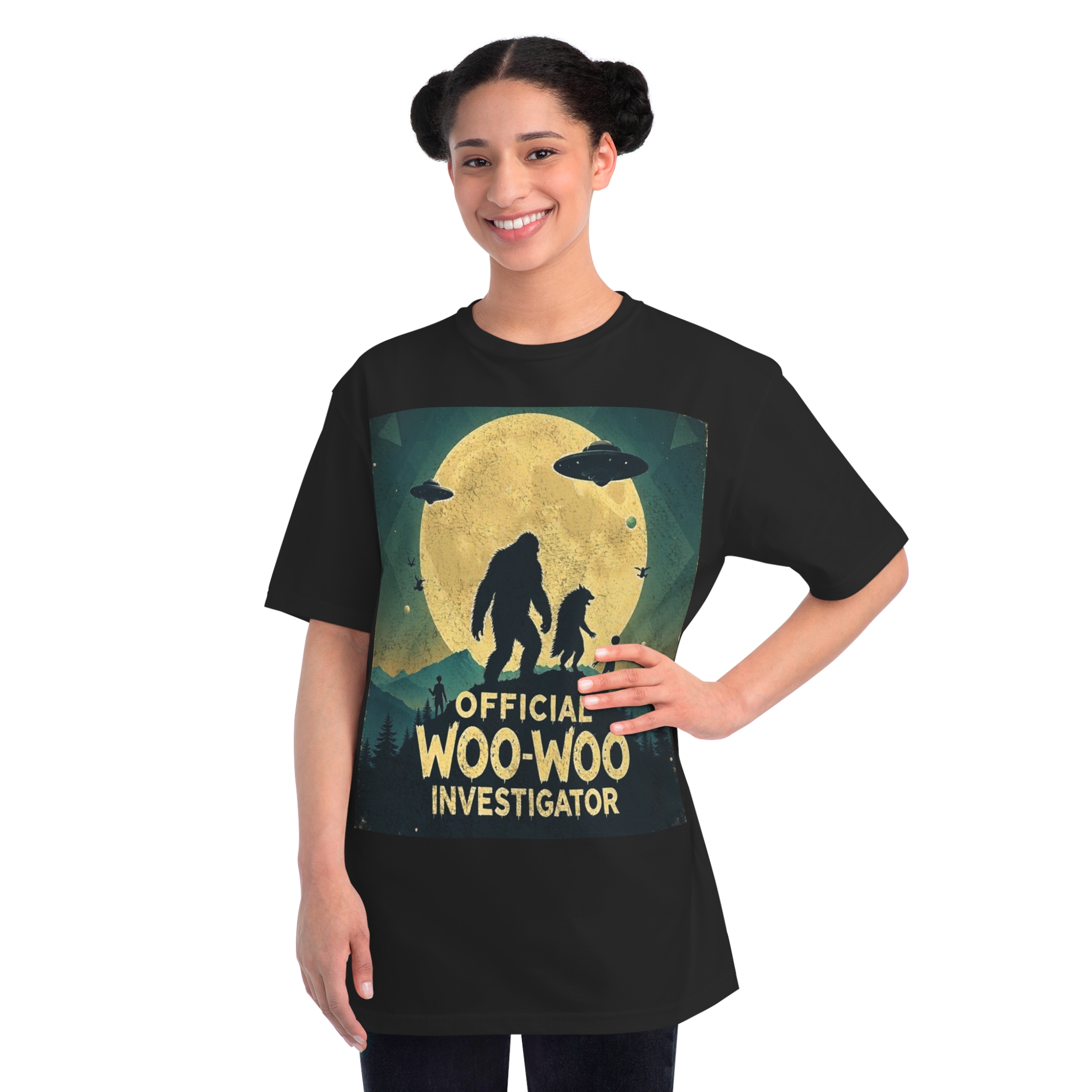 Discover the whimsical world of cryptid investigation with this vintage-style poster featuring a humorous “Official Woo-Woo Investigator” theme. The image depicts a silhouetted landscape under a massive golden moon, with two large cryptid-like creatures (a Bigfoot and what appears to be a smaller companion) standing dramatically against the lunar backdrop. Two UFOs hover in the sky, while small humanoid figures and birds add to the mysterious atmosphere. The graphic uses a retro, slightly weathered design with a teal and yellow color palette that evokes classic paranormal and conspiracy theory artwork. This playful illustration captures the essence of supernatural investigation, blending folklore, alien encounters, and cryptozoology into a single, entertaining visual narrative.