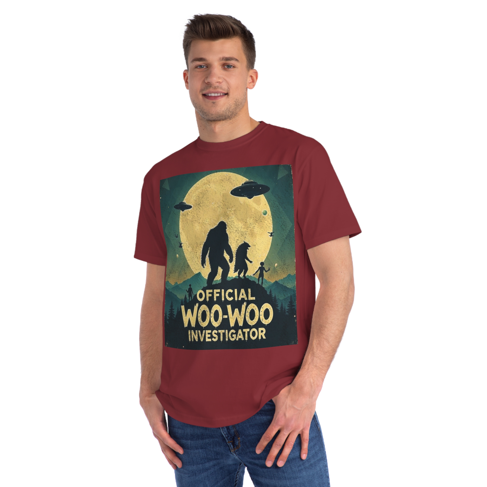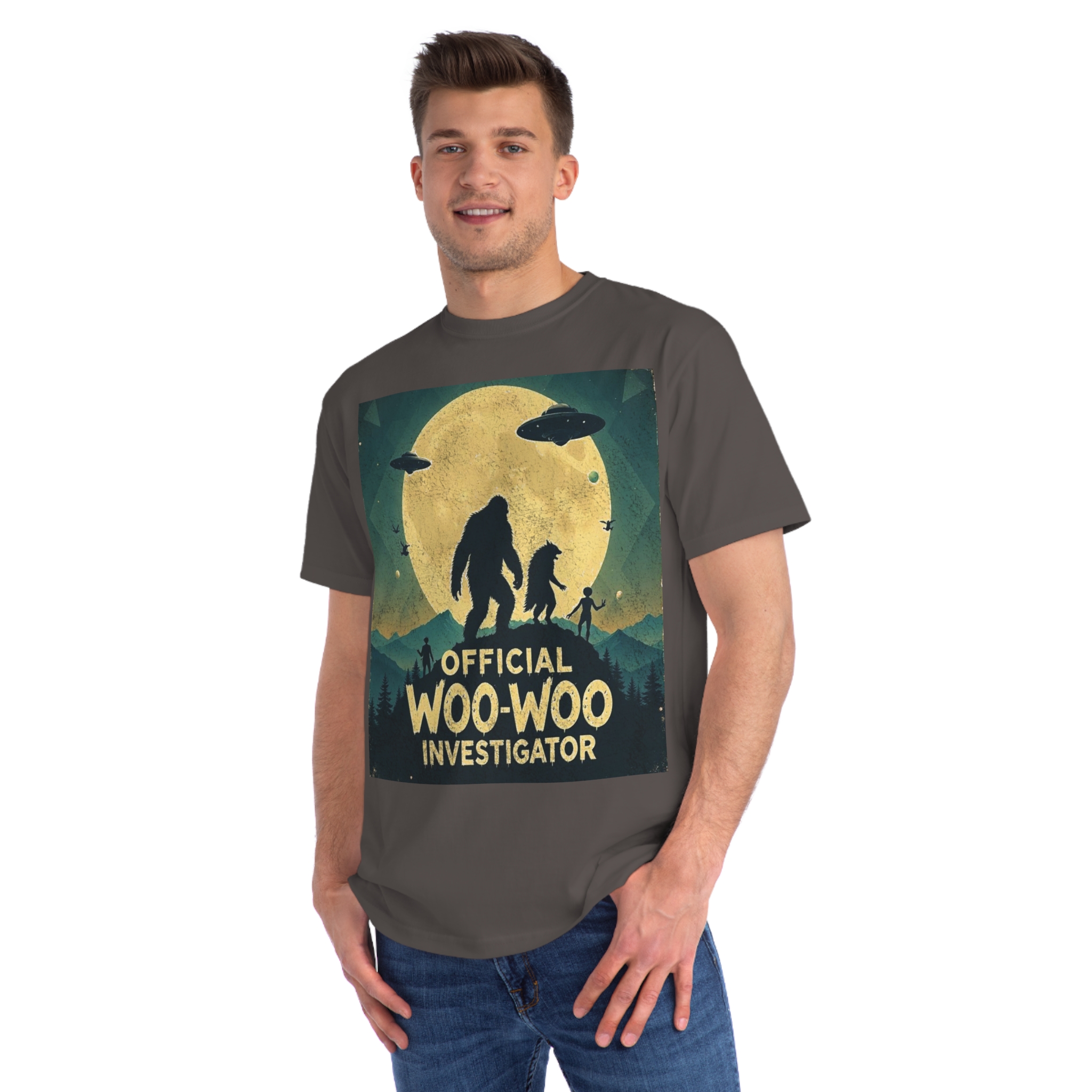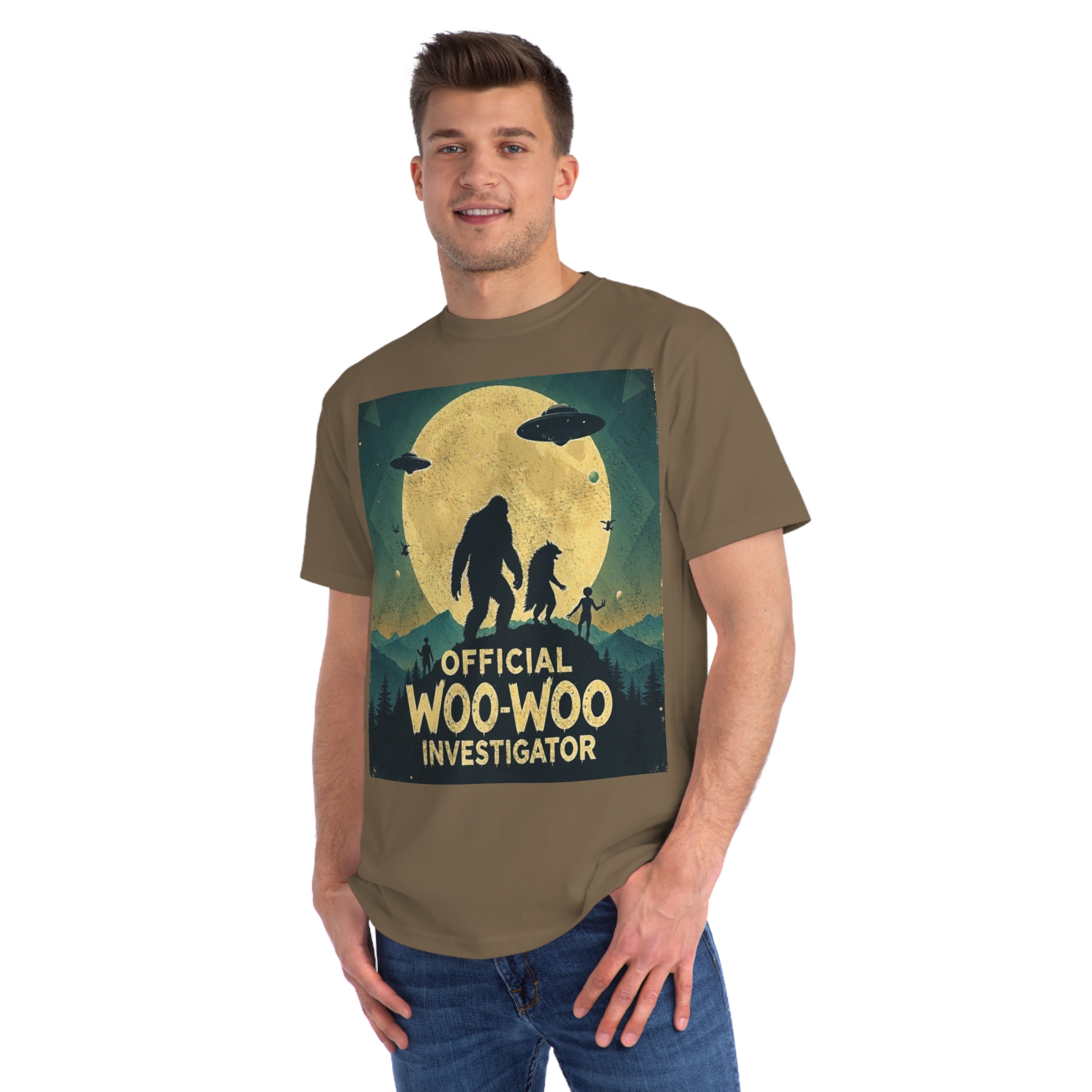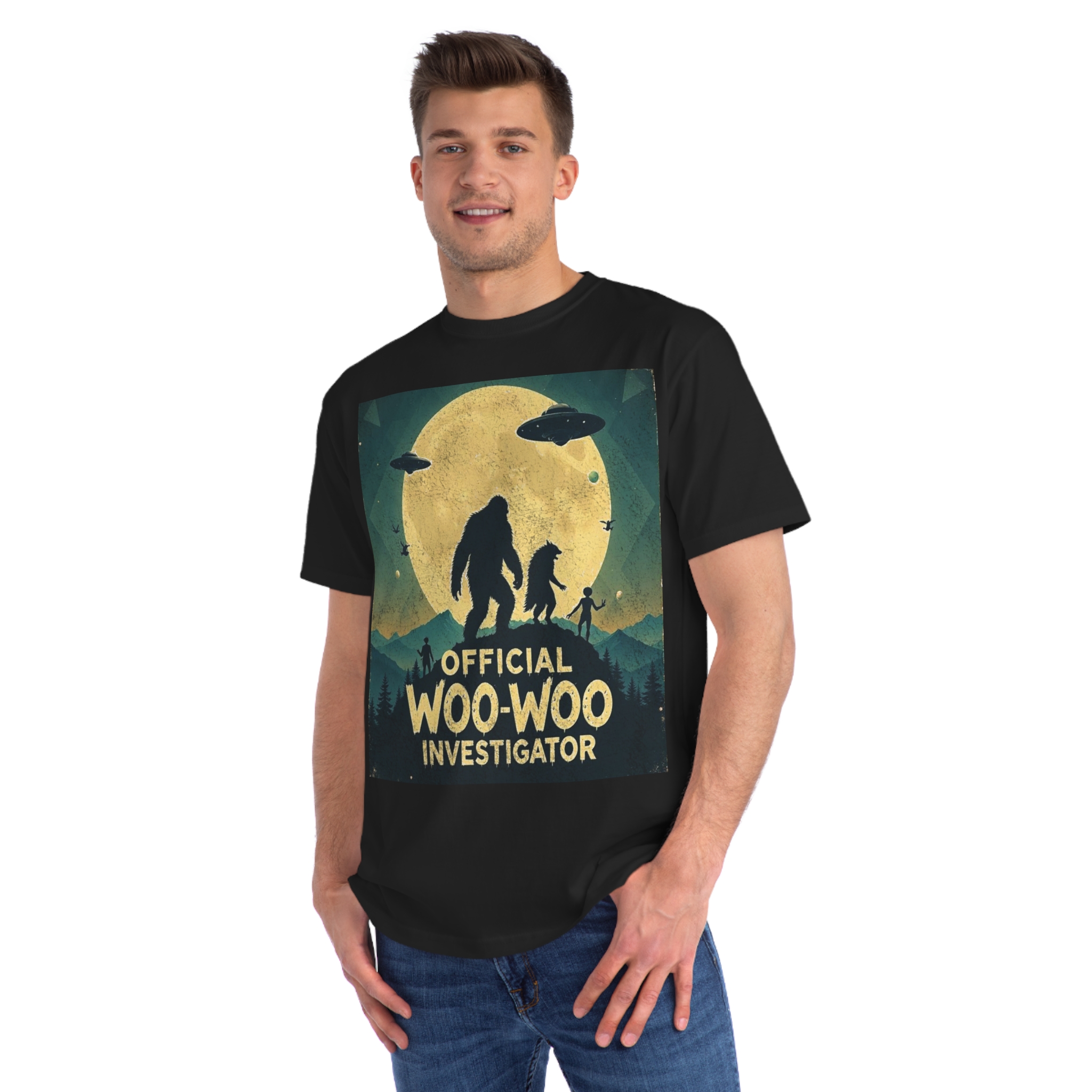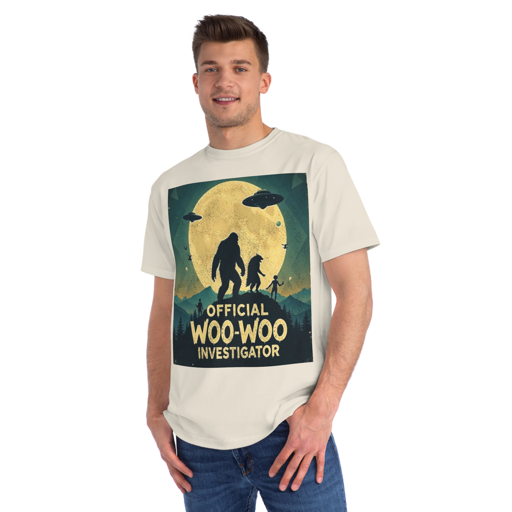 Discover the whimsical world of cryptid investigation with this vintage-style poster featuring a humorous “Official Woo-Woo Investigator” theme. The image depicts a silhouetted landscape under a massive golden moon, with two large cryptid-like creatures (a Bigfoot and what appears to be a smaller companion) standing dramatically against the lunar backdrop. Two UFOs hover in the sky, while small humanoid figures and birds add to the mysterious atmosphere. The graphic uses a retro, slightly weathered design with a teal and yellow color palette that evokes classic paranormal and conspiracy theory artwork. This playful illustration captures the essence of supernatural investigation, blending folklore, alien encounters, and cryptozoology into a single, entertaining visual narrative.